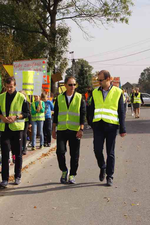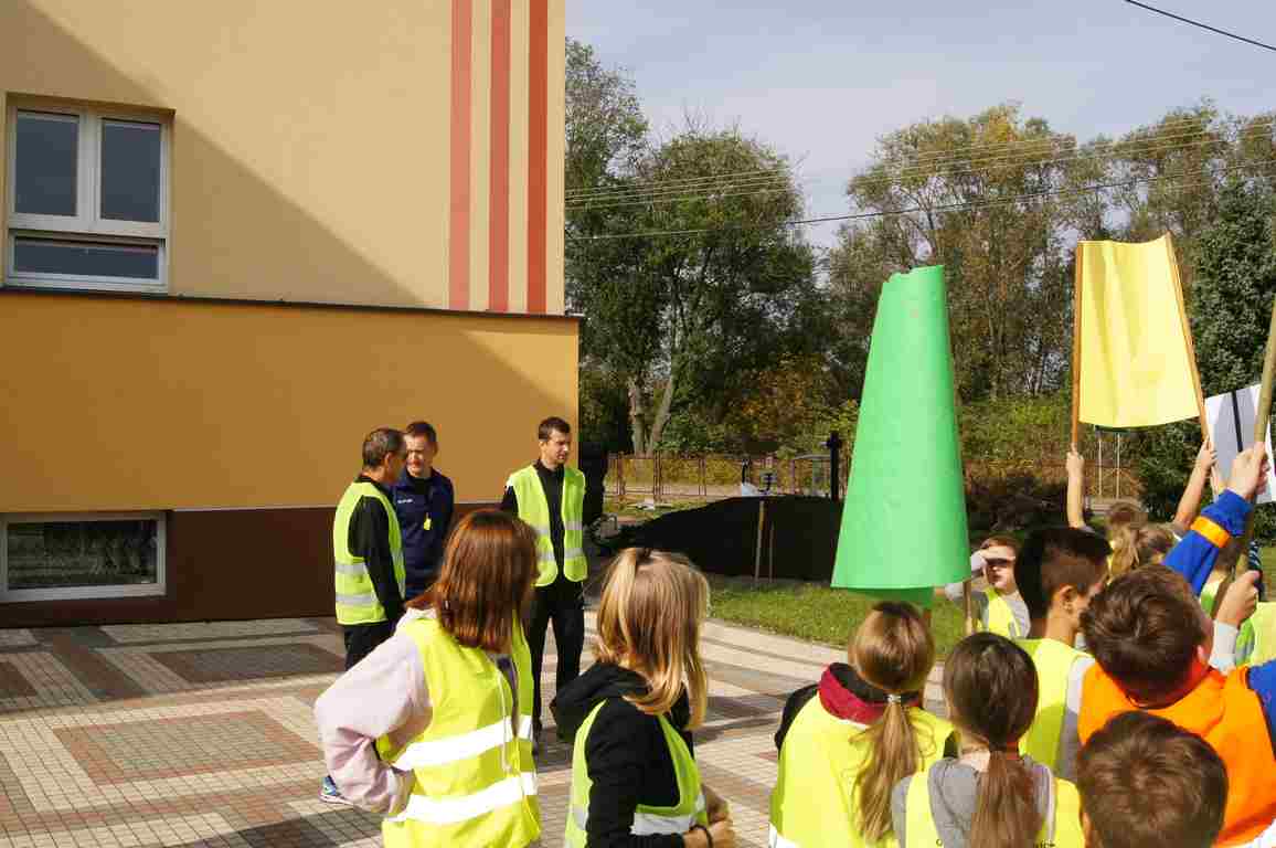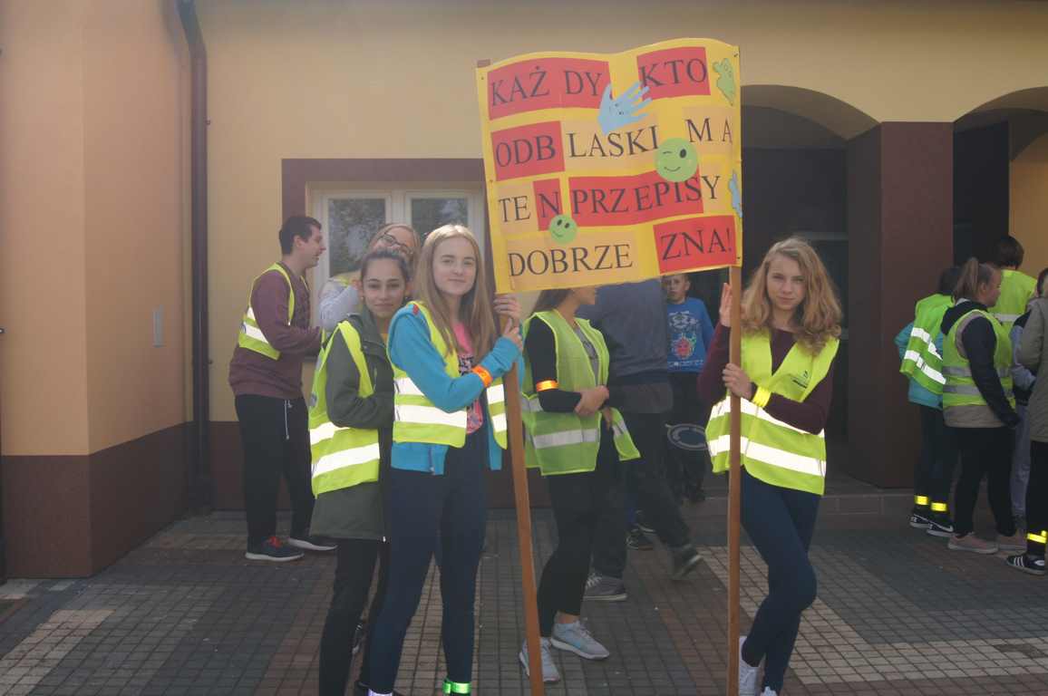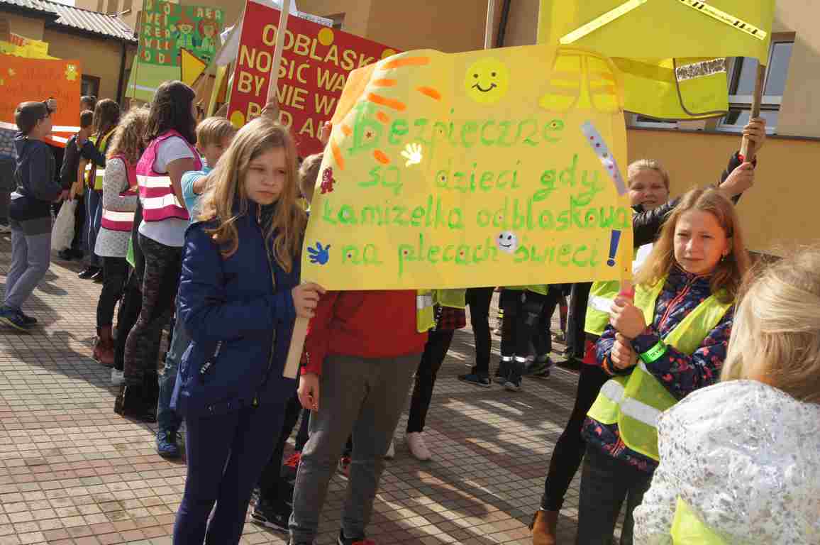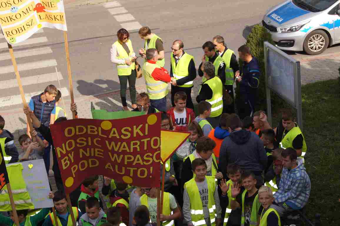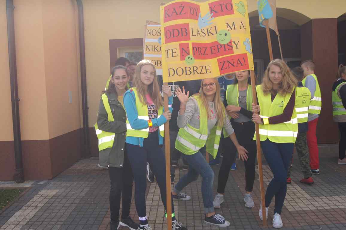 Uczniowie ubrani w kamizelki odblaskowe nieśli własnoręcznie wykonane transparenty z hasłami promującymi noszenie odblasków oraz skandowali przygotowane specjalnie na tę okazję rymowanki. Szkolny pochód dotarł pod Urząd Gminy, gdzie na spotkanie z uczniami i nauczycielami przybyła pani Sabina Nowak – zastępca Wójta Gminy Wietrzychowice, która podziękowała wszystkim za kolejną akcję i wyraziła radość z faktu, że pamiętamy nie tylko o sobie, ale również o pozostałych mieszkańcach gminy.