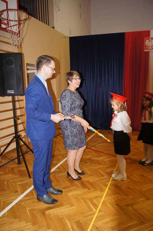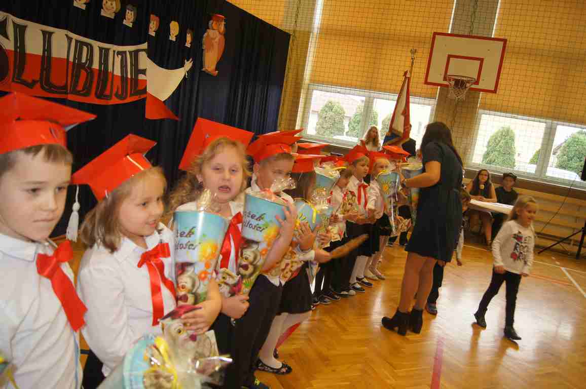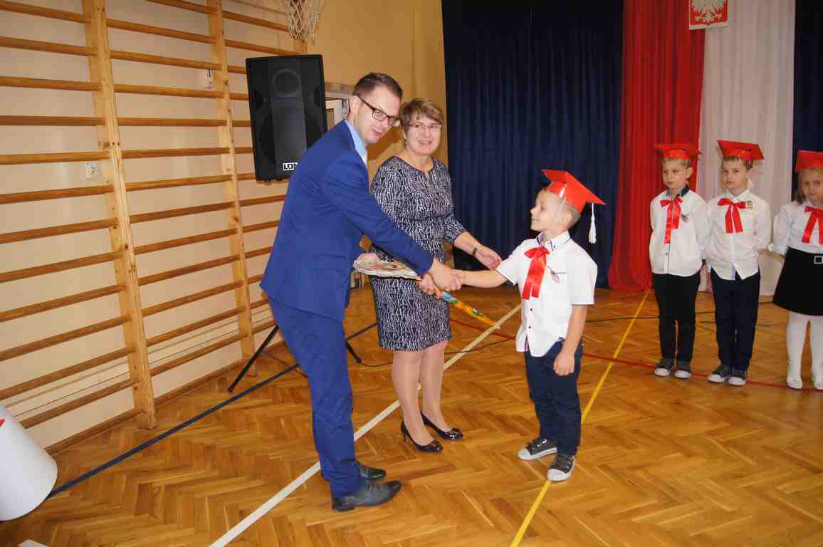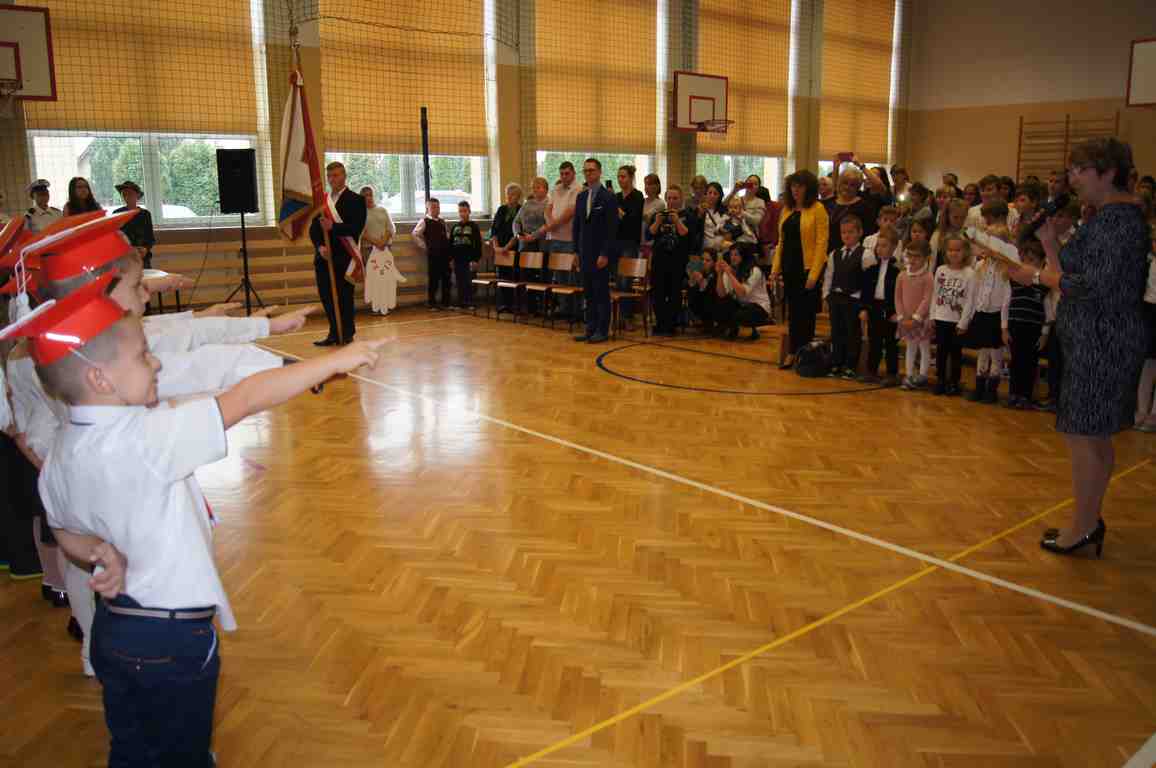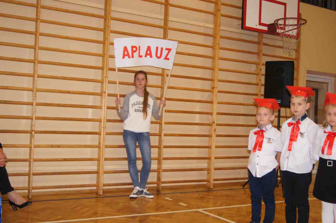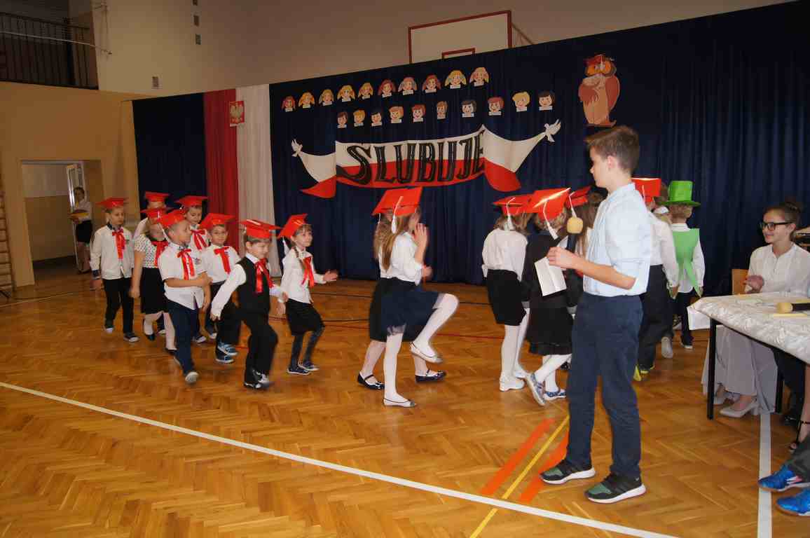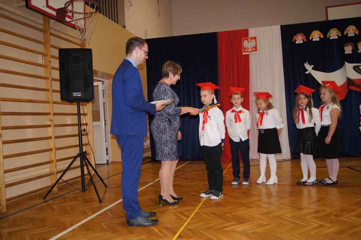 Uroczystość pierwszoklasistów zgromadziła w sali gimnastycznej uczniów, rodziców i nauczycieli. Swoją obecnością uświetnił ją również Wójt Gminy Wietrzychowice, pan Tomasz Banek. Wszyscy bacznie przyglądali się, czy nasi najmłodsi zasługują na miano prawdziwych uczniów. Jak się okazało, zasługują w pełni. Dziewczynki i chłopcy, odświętnie ubrani i bardzo przejęci zaprezentowali pełną gamę swoich możliwości i umiejętności – śpiewali piosenki, recytowali wiersze, rozpoznawali znaki drogowe i wykazali się wiedzą na temat zdrowego odżywiania. Najwięcej emocji bez wątpienia wzbudził piękny taniec, nawiązujący do obchodzonej w bieżącym roku rocznicy 100 – lecia Odzyskania Niepodległości – dopracowany w każdym szczególe, precyzyjny i niezwykle wymowny. Po takim występie nikt z zebranych nie miał żadnych wątpliwości, co do umiejętności najmłodszej grupy w szkole, zatem z prawdziwą przyjemnością pani dyrektor wraz z panem wójtem przeszli do punktu kulminacyjnego, jakim było ślubowanie i pasowanie na uczniów. Tym samym pierwszaki zostały włączone do społeczności uczniowskiej Szkoły Podstawowej im. Stanisława Miłkowskiego w Wietrzychowicach, czego dowodem były akty pasowania na ucznia wręczone dzieciom po pasowaniu.