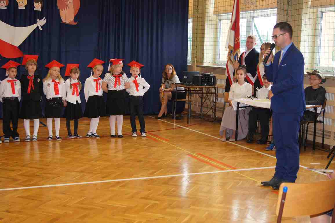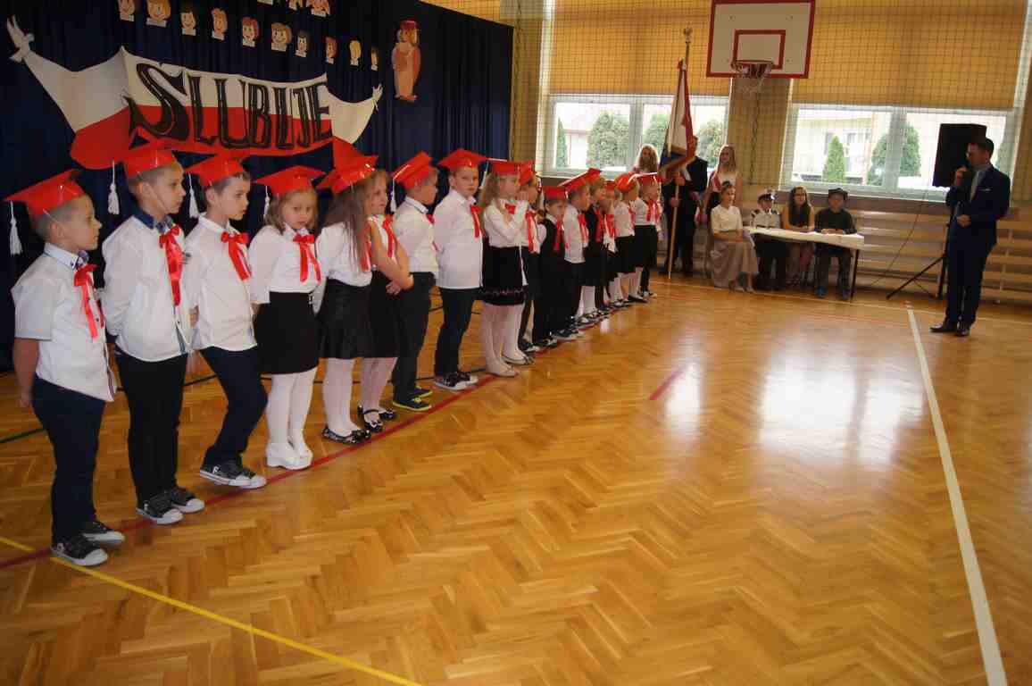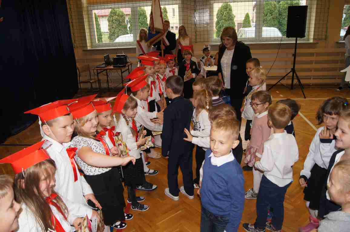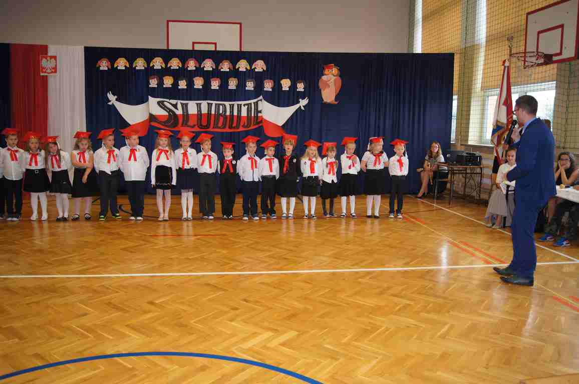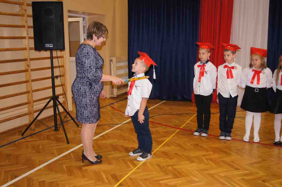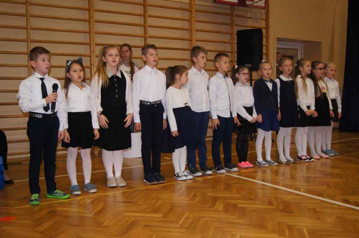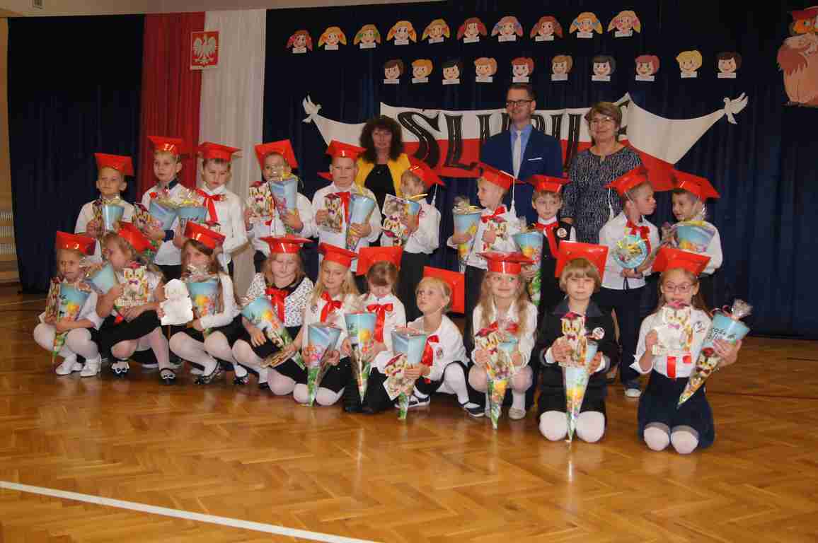 Uroczystość pierwszoklasistów zgromadziła w sali gimnastycznej uczniów, rodziców i nauczycieli. Swoją obecnością uświetnił ją również Wójt Gminy Wietrzychowice, pan Tomasz Banek. Wszyscy bacznie przyglądali się, czy nasi najmłodsi zasługują na miano prawdziwych uczniów. Jak się okazało, zasługują w pełni. Dziewczynki i chłopcy, odświętnie ubrani i bardzo przejęci zaprezentowali pełną gamę swoich możliwości i umiejętności – śpiewali piosenki, recytowali wiersze, rozpoznawali znaki drogowe i wykazali się wiedzą na temat zdrowego odżywiania. Najwięcej emocji bez wątpienia wzbudził piękny taniec, nawiązujący do obchodzonej w bieżącym roku rocznicy 100 – lecia Odzyskania Niepodległości – dopracowany w każdym szczególe, precyzyjny i niezwykle wymowny. Po takim występie nikt z zebranych nie miał żadnych wątpliwości, co do umiejętności najmłodszej grupy w szkole, zatem z prawdziwą przyjemnością pani dyrektor wraz z panem wójtem przeszli do punktu kulminacyjnego, jakim było ślubowanie i pasowanie na uczniów. Tym samym pierwszaki zostały włączone do społeczności uczniowskiej Szkoły Podstawowej im. Stanisława Miłkowskiego w Wietrzychowicach, czego dowodem były akty pasowania na ucznia wręczone dzieciom po pasowaniu.