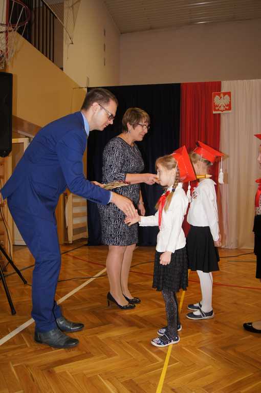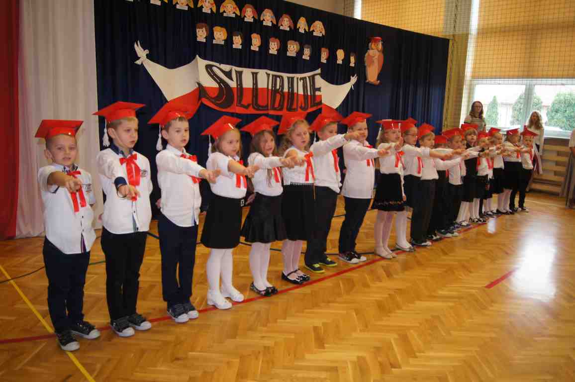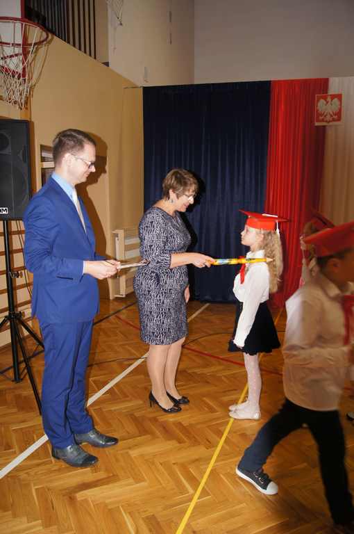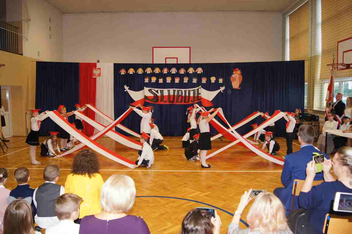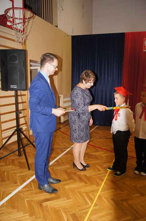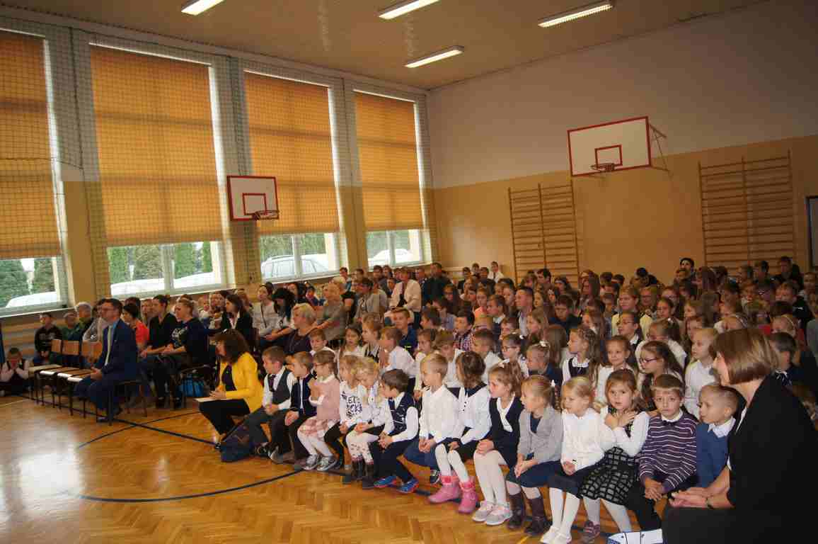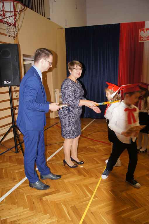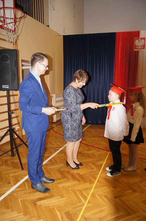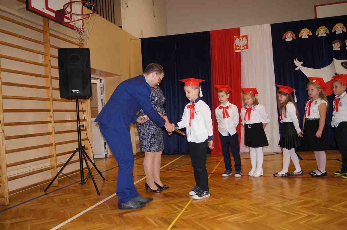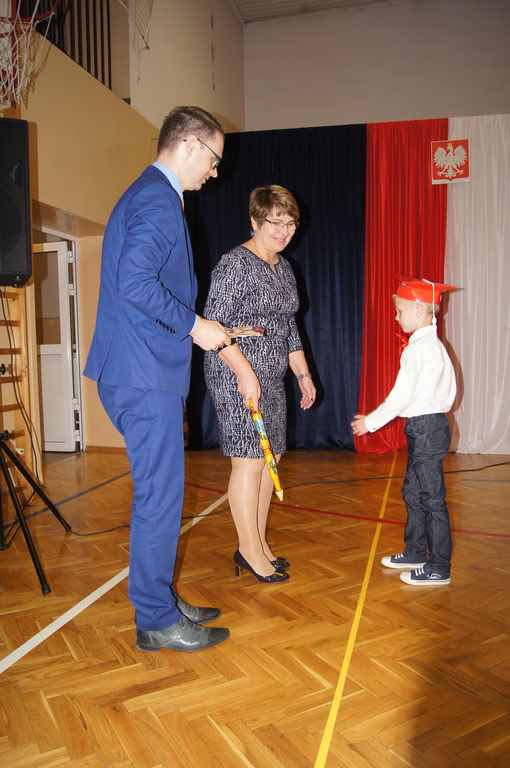 Uroczystość pierwszoklasistów zgromadziła w sali gimnastycznej uczniów, rodziców i nauczycieli. Swoją obecnością uświetnił ją również Wójt Gminy Wietrzychowice, pan Tomasz Banek. Wszyscy bacznie przyglądali się, czy nasi najmłodsi zasługują na miano prawdziwych uczniów. Jak się okazało, zasługują w pełni. Dziewczynki i chłopcy, odświętnie ubrani i bardzo przejęci zaprezentowali pełną gamę swoich możliwości i umiejętności – śpiewali piosenki, recytowali wiersze, rozpoznawali znaki drogowe i wykazali się wiedzą na temat zdrowego odżywiania. Najwięcej emocji bez wątpienia wzbudził piękny taniec, nawiązujący do obchodzonej w bieżącym roku rocznicy 100 – lecia Odzyskania Niepodległości – dopracowany w każdym szczególe, precyzyjny i niezwykle wymowny. Po takim występie nikt z zebranych nie miał żadnych wątpliwości, co do umiejętności najmłodszej grupy w szkole, zatem z prawdziwą przyjemnością pani dyrektor wraz z panem wójtem przeszli do punktu kulminacyjnego, jakim było ślubowanie i pasowanie na uczniów. Tym samym pierwszaki zostały włączone do społeczności uczniowskiej Szkoły Podstawowej im. Stanisława Miłkowskiego w Wietrzychowicach, czego dowodem były akty pasowania na ucznia wręczone dzieciom po pasowaniu.
