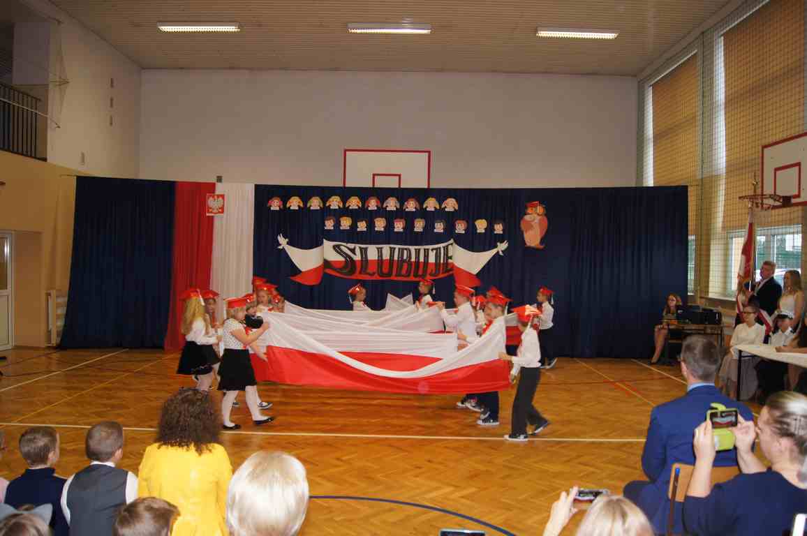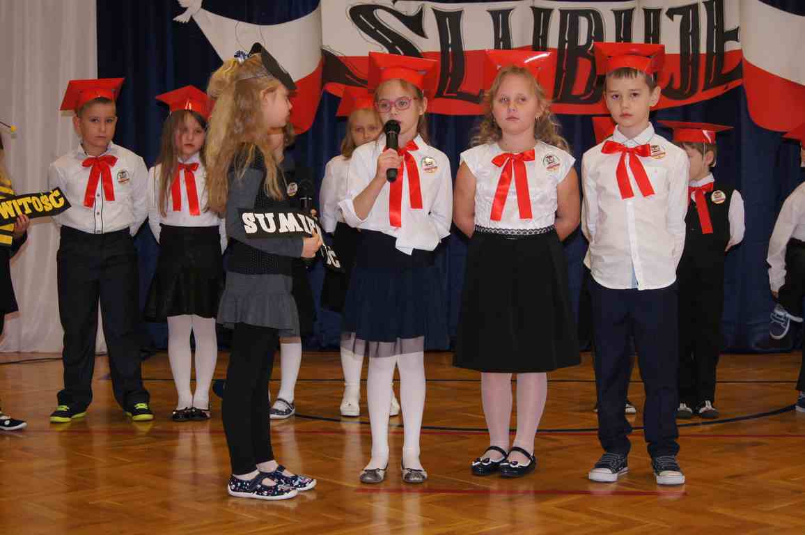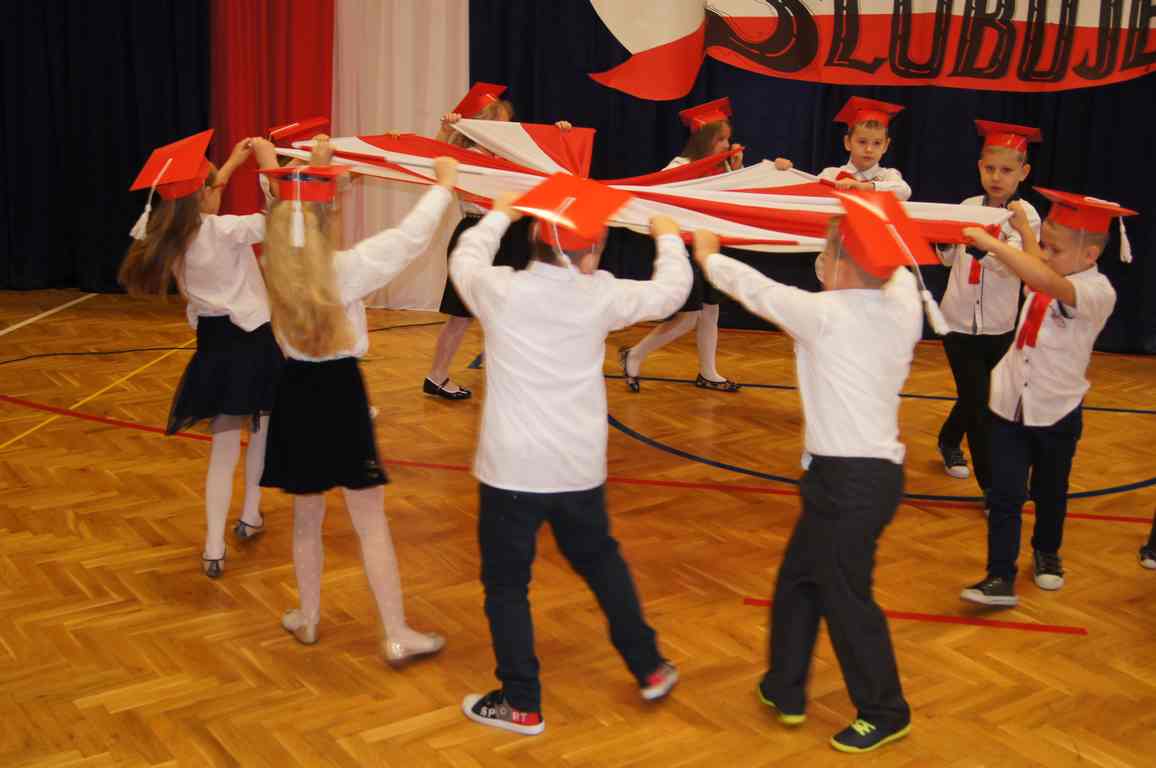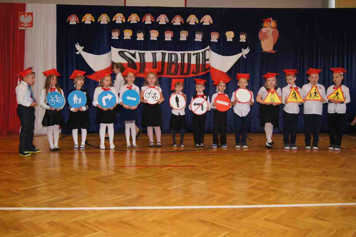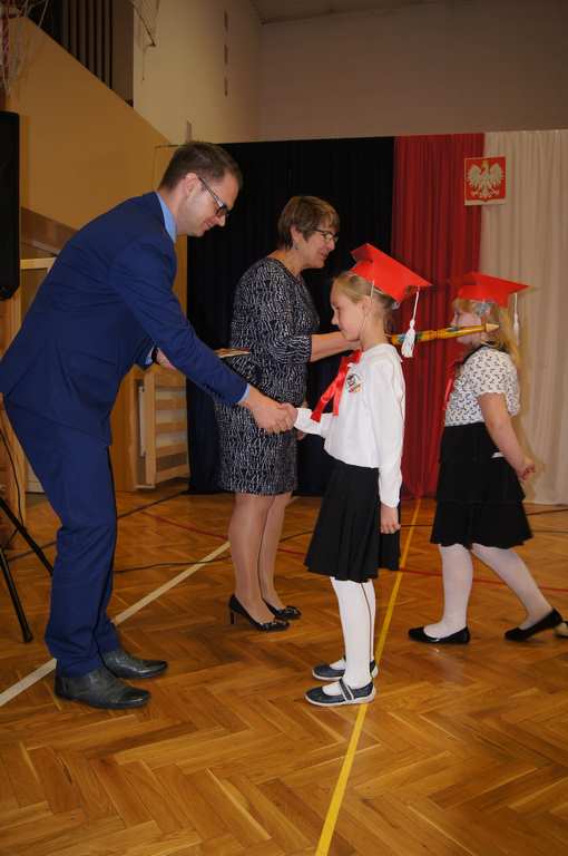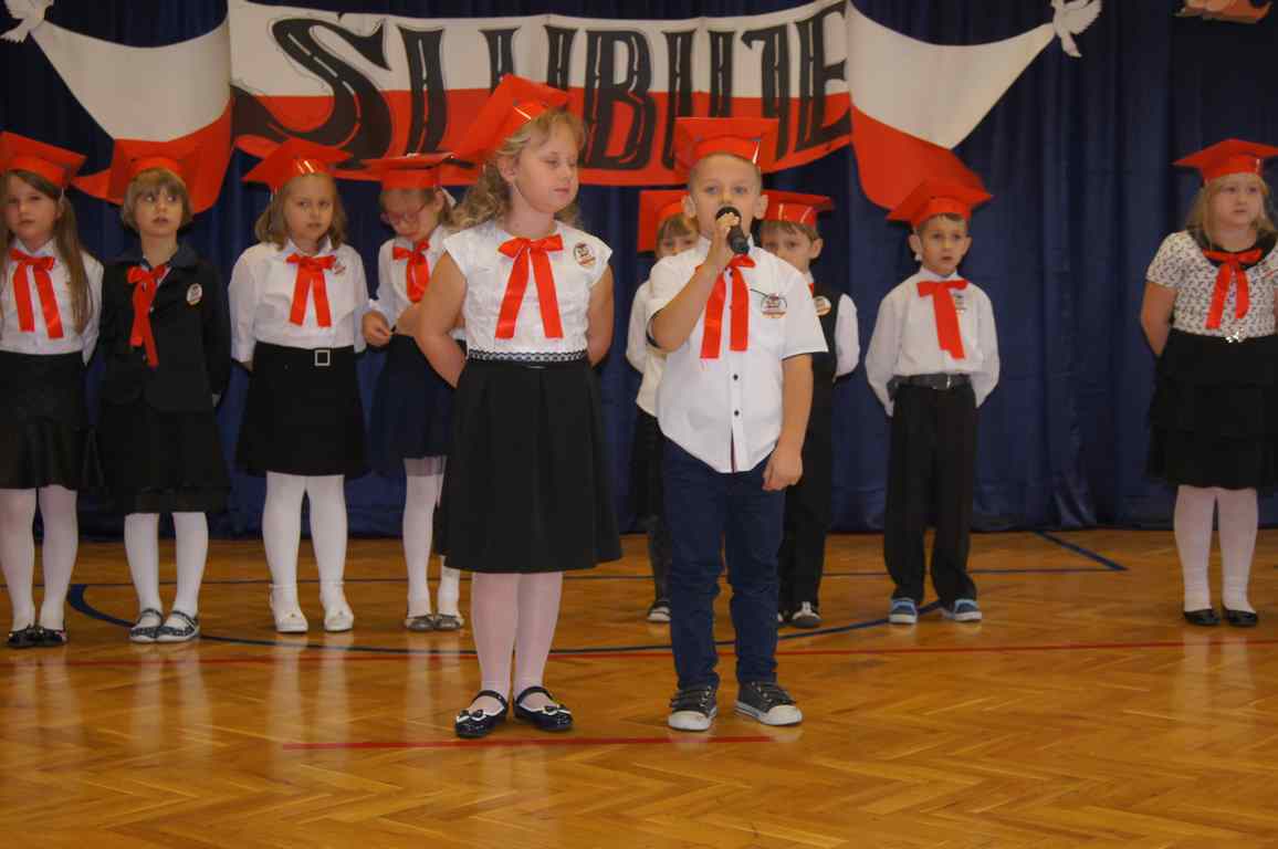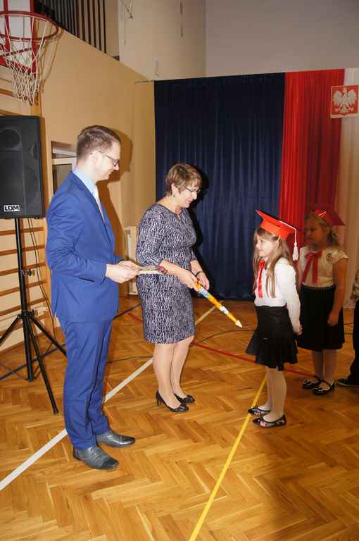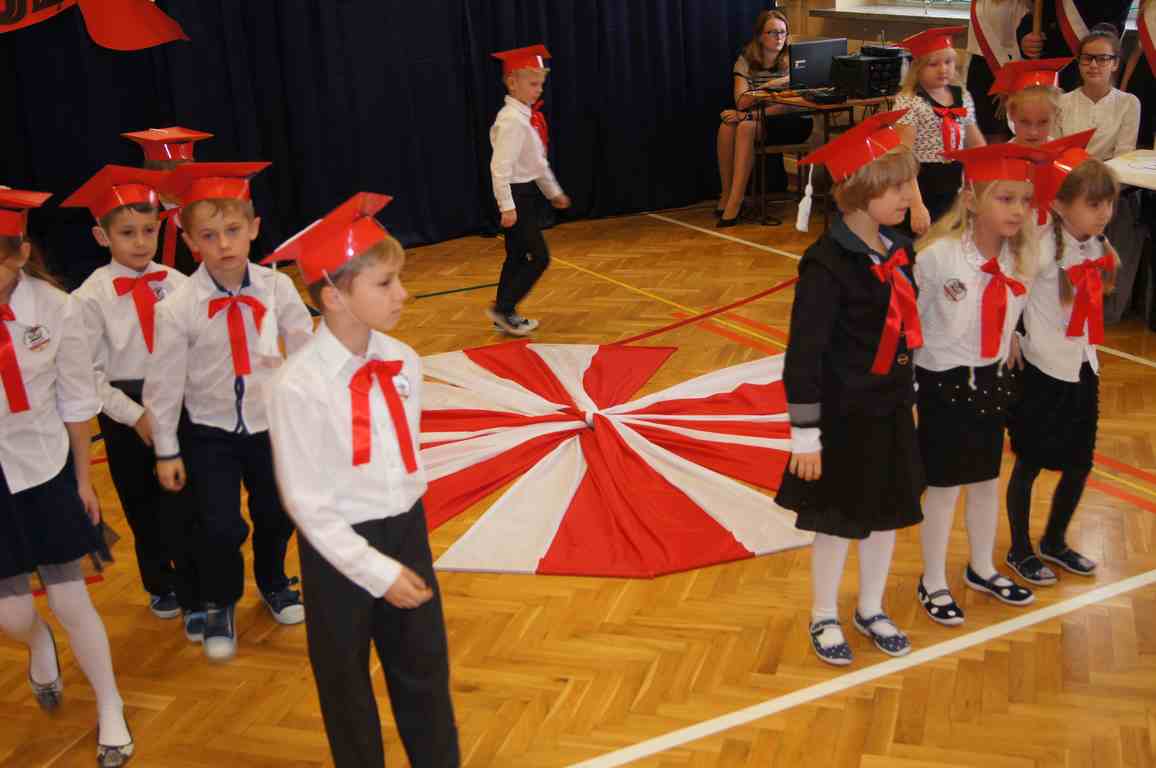 Uroczystość pierwszoklasistów zgromadziła w sali gimnastycznej uczniów, rodziców i nauczycieli. Swoją obecnością uświetnił ją również Wójt Gminy Wietrzychowice, pan Tomasz Banek. Wszyscy bacznie przyglądali się, czy nasi najmłodsi zasługują na miano prawdziwych uczniów. Jak się okazało, zasługują w pełni. Dziewczynki i chłopcy, odświętnie ubrani i bardzo przejęci zaprezentowali pełną gamę swoich możliwości i umiejętności – śpiewali piosenki, recytowali wiersze, rozpoznawali znaki drogowe i wykazali się wiedzą na temat zdrowego odżywiania. Najwięcej emocji bez wątpienia wzbudził piękny taniec, nawiązujący do obchodzonej w bieżącym roku rocznicy 100 – lecia Odzyskania Niepodległości – dopracowany w każdym szczególe, precyzyjny i niezwykle wymowny. Po takim występie nikt z zebranych nie miał żadnych wątpliwości, co do umiejętności najmłodszej grupy w szkole, zatem z prawdziwą przyjemnością pani dyrektor wraz z panem wójtem przeszli do punktu kulminacyjnego, jakim było ślubowanie i pasowanie na uczniów. Tym samym pierwszaki zostały włączone do społeczności uczniowskiej Szkoły Podstawowej im. Stanisława Miłkowskiego w Wietrzychowicach, czego dowodem były akty pasowania na ucznia wręczone dzieciom po pasowaniu.