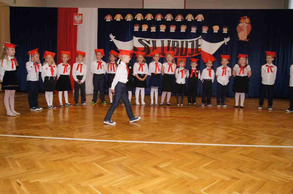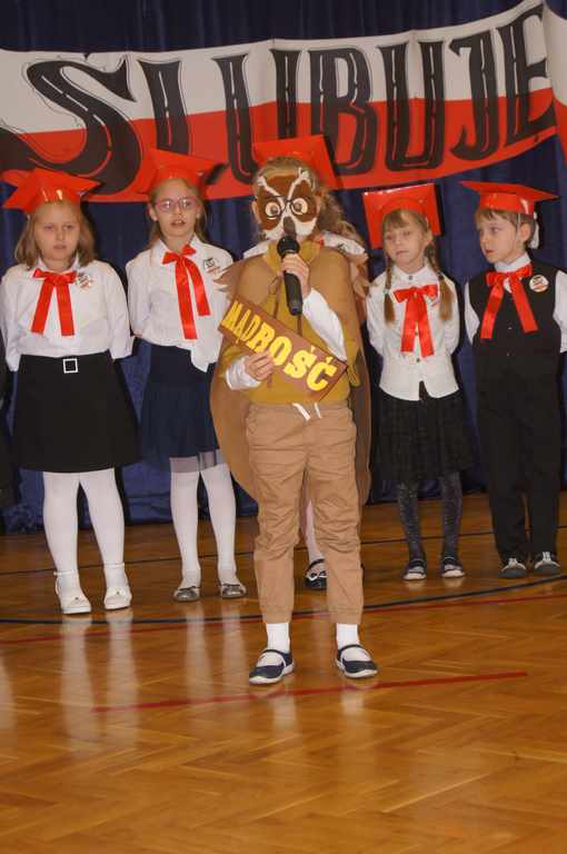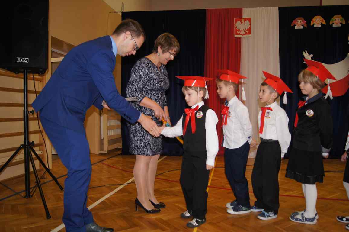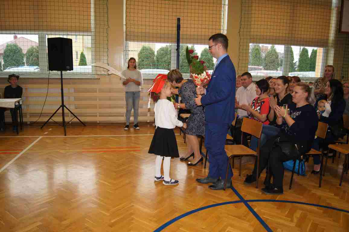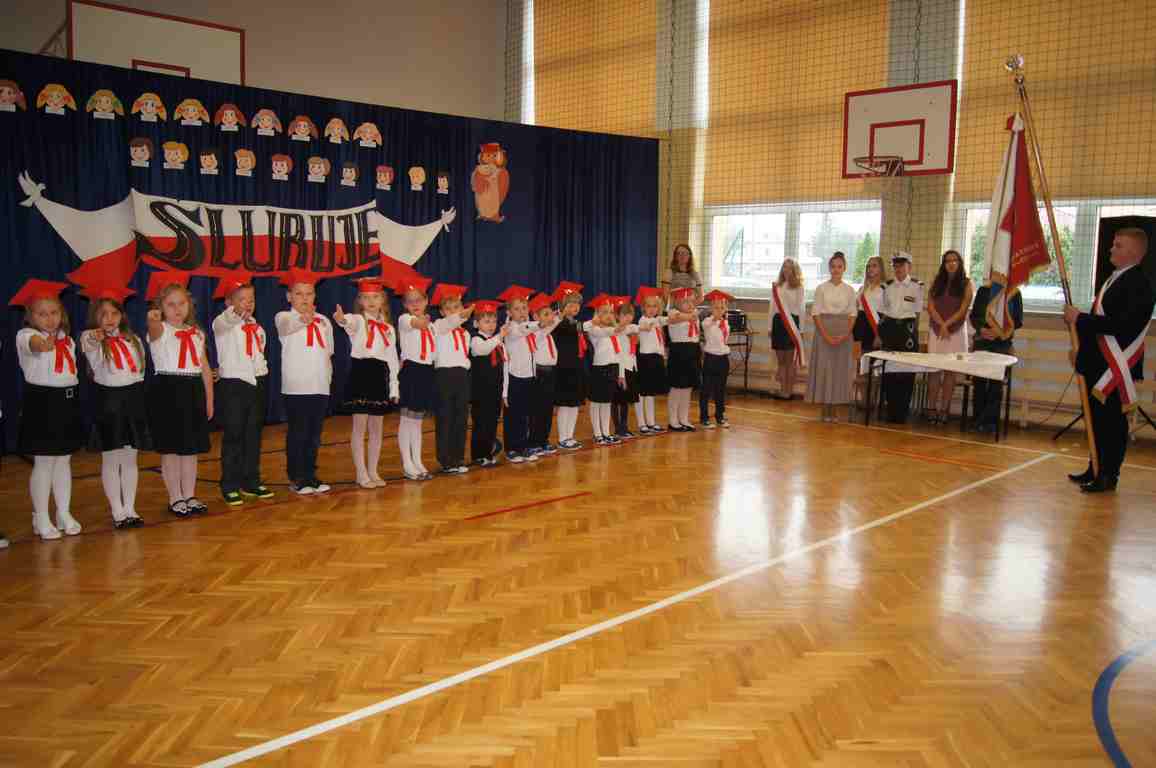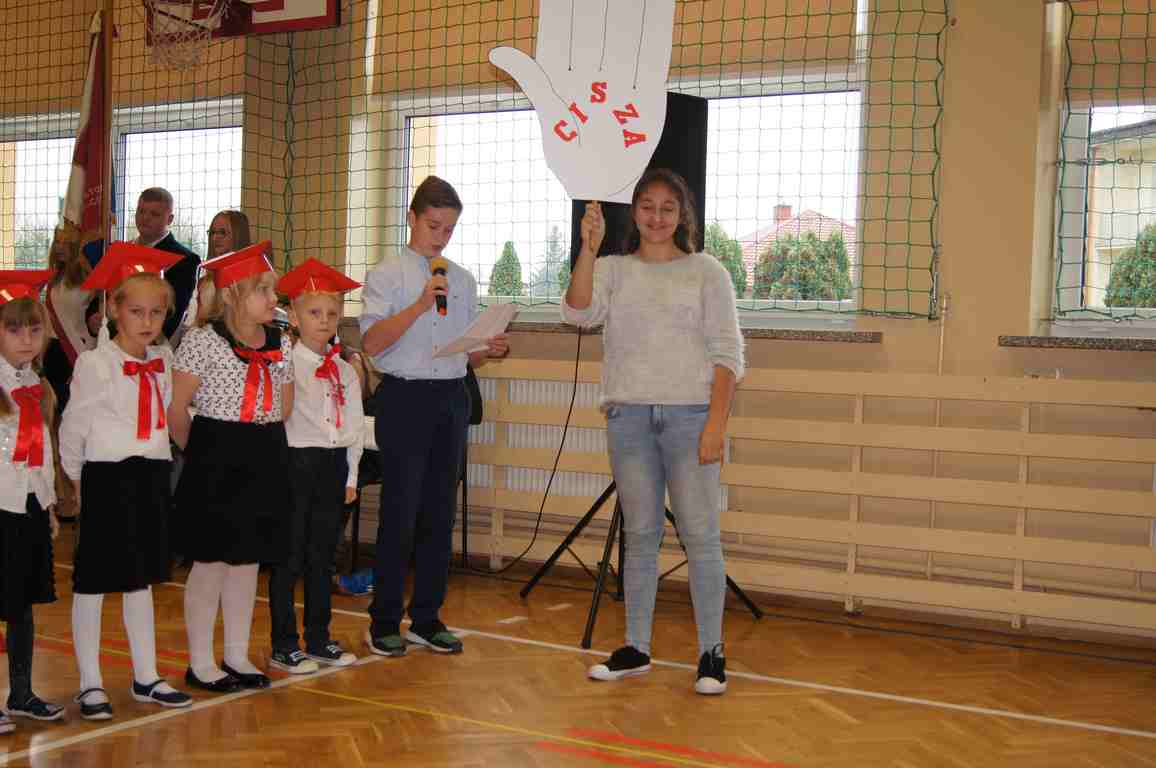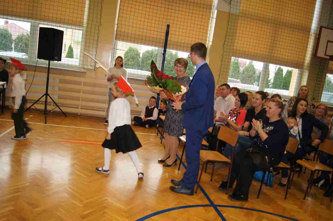 Uroczystość pierwszoklasistów zgromadziła w sali gimnastycznej uczniów, rodziców i nauczycieli. Swoją obecnością uświetnił ją również Wójt Gminy Wietrzychowice, pan Tomasz Banek. Wszyscy bacznie przyglądali się, czy nasi najmłodsi zasługują na miano prawdziwych uczniów. Jak się okazało, zasługują w pełni. Dziewczynki i chłopcy, odświętnie ubrani i bardzo przejęci zaprezentowali pełną gamę swoich możliwości i umiejętności – śpiewali piosenki, recytowali wiersze, rozpoznawali znaki drogowe i wykazali się wiedzą na temat zdrowego odżywiania. Najwięcej emocji bez wątpienia wzbudził piękny taniec, nawiązujący do obchodzonej w bieżącym roku rocznicy 100 – lecia Odzyskania Niepodległości – dopracowany w każdym szczególe, precyzyjny i niezwykle wymowny. Po takim występie nikt z zebranych nie miał żadnych wątpliwości, co do umiejętności najmłodszej grupy w szkole, zatem z prawdziwą przyjemnością pani dyrektor wraz z panem wójtem przeszli do punktu kulminacyjnego, jakim było ślubowanie i pasowanie na uczniów. Tym samym pierwszaki zostały włączone do społeczności uczniowskiej Szkoły Podstawowej im. Stanisława Miłkowskiego w Wietrzychowicach, czego dowodem były akty pasowania na ucznia wręczone dzieciom po pasowaniu.