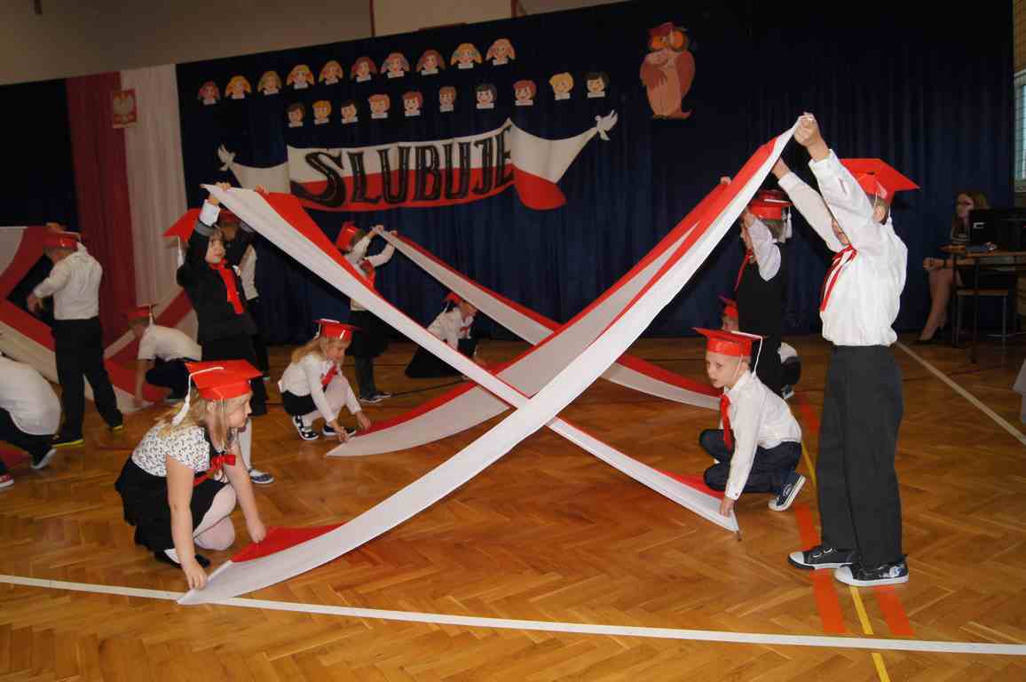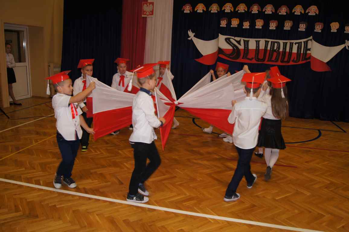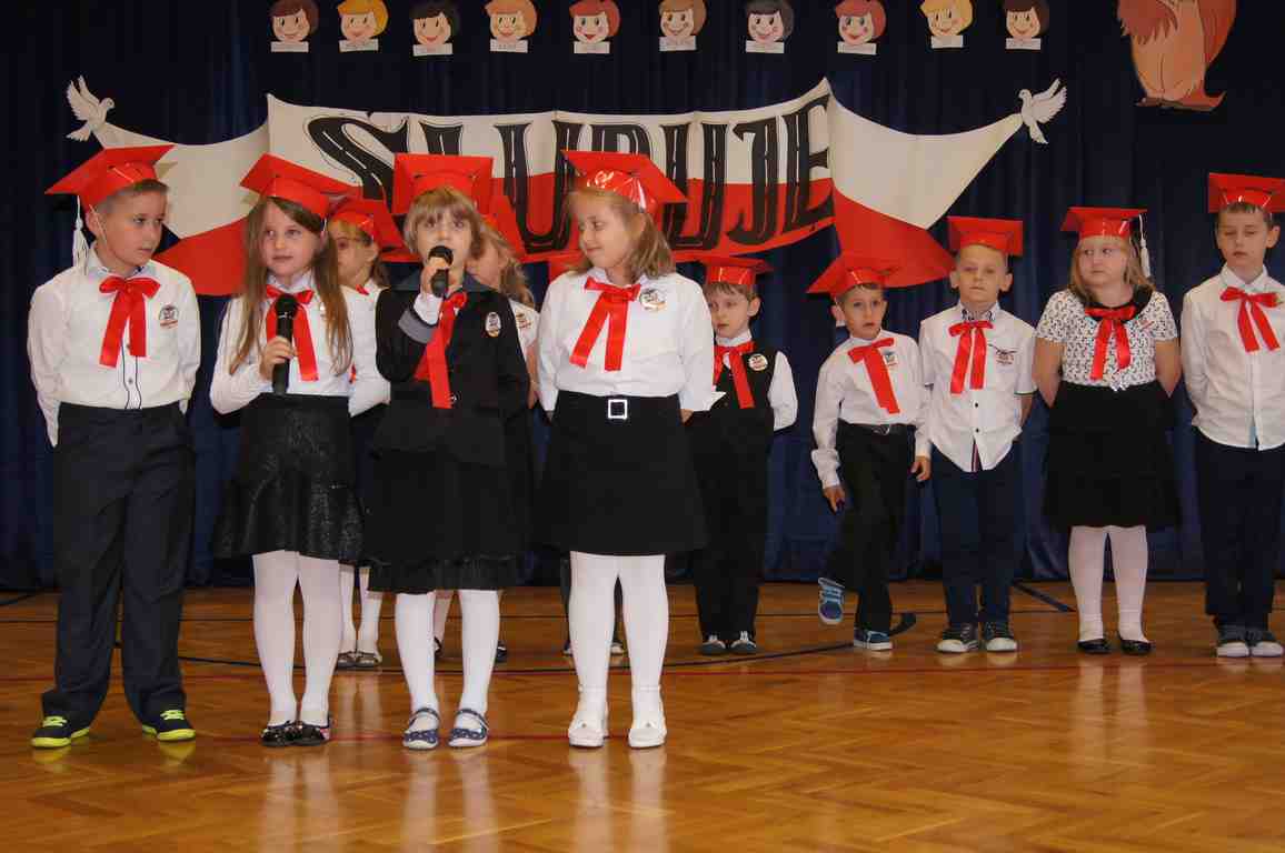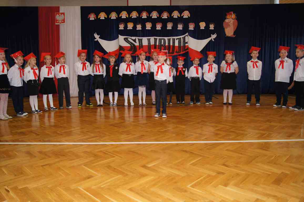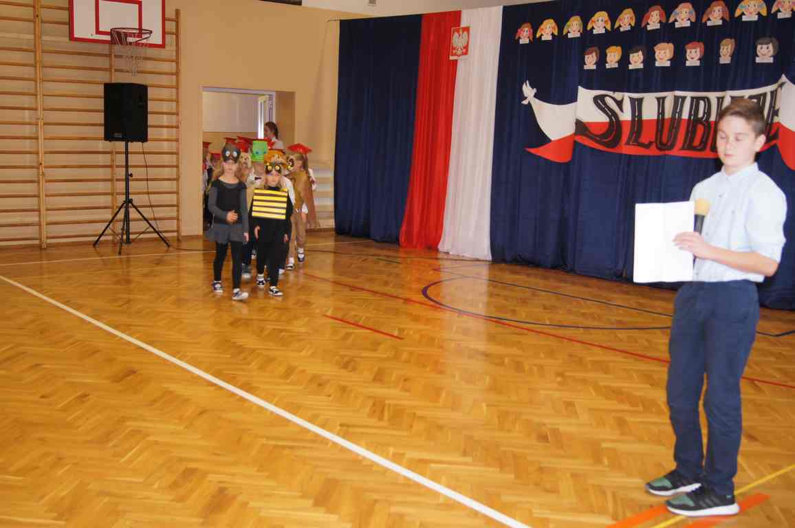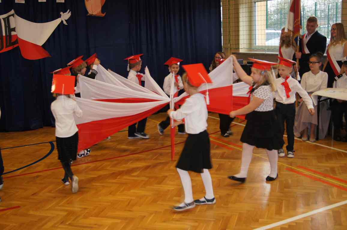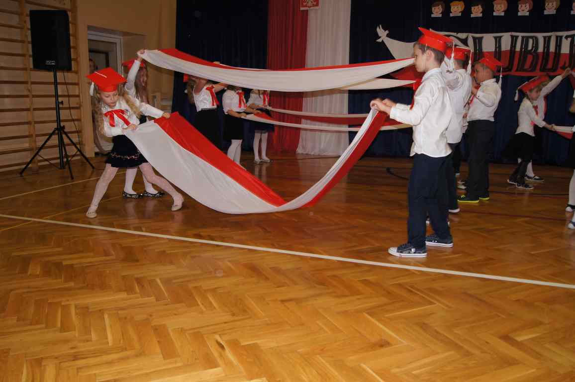 Uroczystość pierwszoklasistów zgromadziła w sali gimnastycznej uczniów, rodziców i nauczycieli. Swoją obecnością uświetnił ją również Wójt Gminy Wietrzychowice, pan Tomasz Banek. Wszyscy bacznie przyglądali się, czy nasi najmłodsi zasługują na miano prawdziwych uczniów. Jak się okazało, zasługują w pełni. Dziewczynki i chłopcy, odświętnie ubrani i bardzo przejęci zaprezentowali pełną gamę swoich możliwości i umiejętności – śpiewali piosenki, recytowali wiersze, rozpoznawali znaki drogowe i wykazali się wiedzą na temat zdrowego odżywiania. Najwięcej emocji bez wątpienia wzbudził piękny taniec, nawiązujący do obchodzonej w bieżącym roku rocznicy 100 – lecia Odzyskania Niepodległości – dopracowany w każdym szczególe, precyzyjny i niezwykle wymowny. Po takim występie nikt z zebranych nie miał żadnych wątpliwości, co do umiejętności najmłodszej grupy w szkole, zatem z prawdziwą przyjemnością pani dyrektor wraz z panem wójtem przeszli do punktu kulminacyjnego, jakim było ślubowanie i pasowanie na uczniów. Tym samym pierwszaki zostały włączone do społeczności uczniowskiej Szkoły Podstawowej im. Stanisława Miłkowskiego w Wietrzychowicach, czego dowodem były akty pasowania na ucznia wręczone dzieciom po pasowaniu.