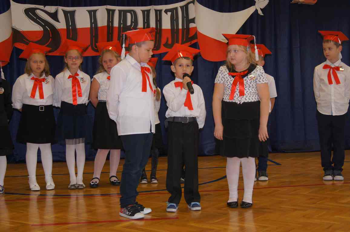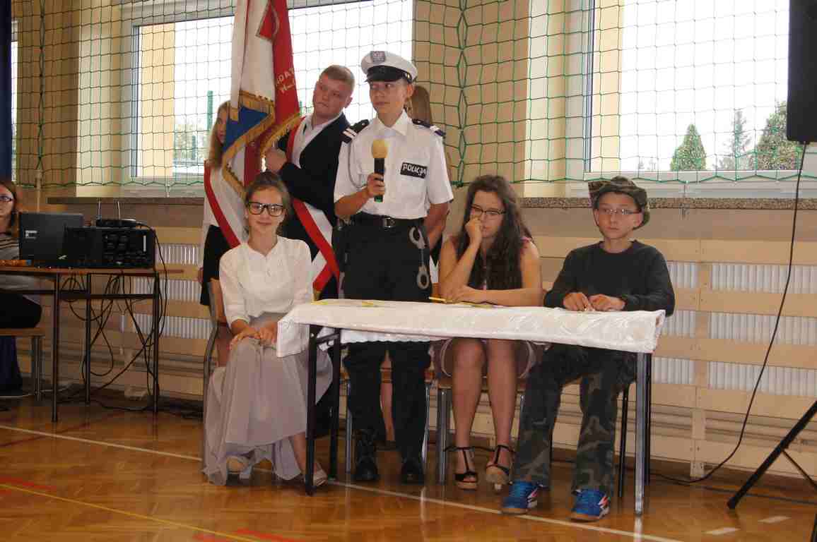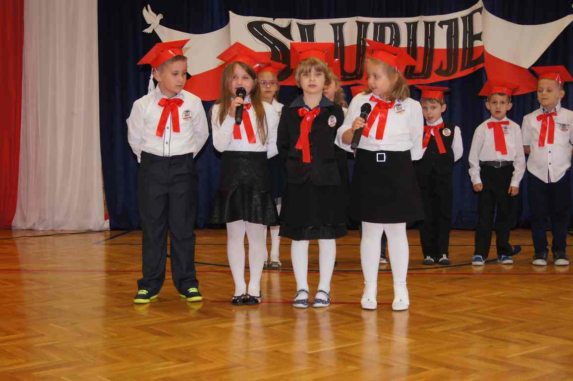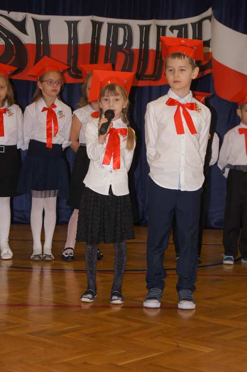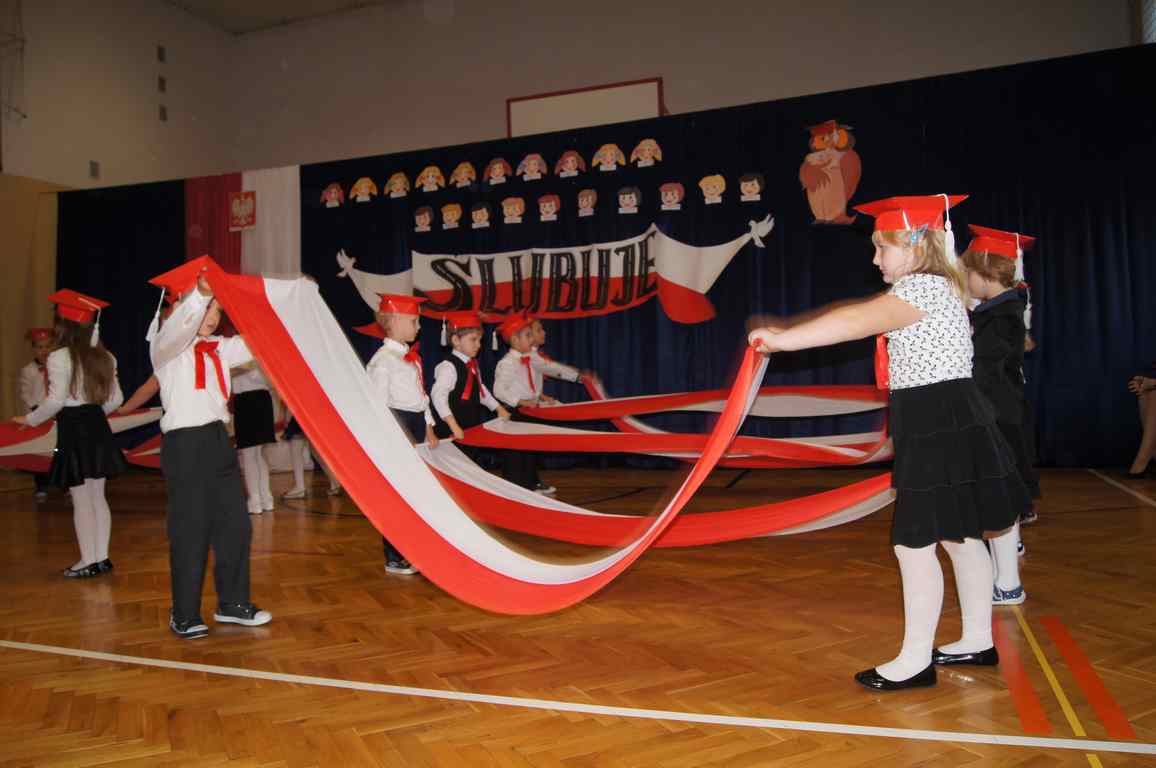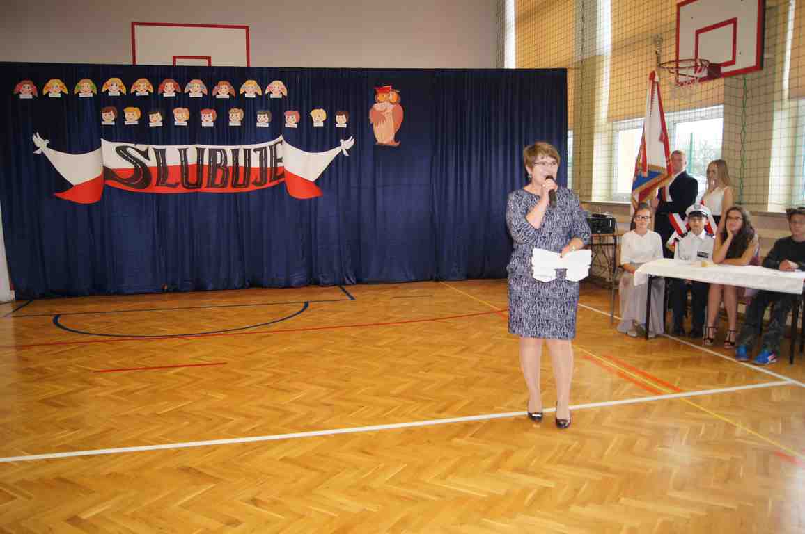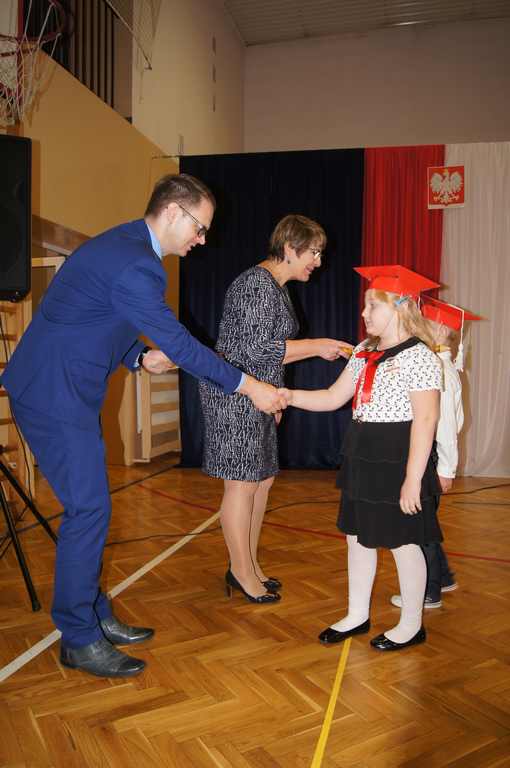 Uroczystość pierwszoklasistów zgromadziła w sali gimnastycznej uczniów, rodziców i nauczycieli. Swoją obecnością uświetnił ją również Wójt Gminy Wietrzychowice, pan Tomasz Banek. Wszyscy bacznie przyglądali się, czy nasi najmłodsi zasługują na miano prawdziwych uczniów. Jak się okazało, zasługują w pełni. Dziewczynki i chłopcy, odświętnie ubrani i bardzo przejęci zaprezentowali pełną gamę swoich możliwości i umiejętności – śpiewali piosenki, recytowali wiersze, rozpoznawali znaki drogowe i wykazali się wiedzą na temat zdrowego odżywiania. Najwięcej emocji bez wątpienia wzbudził piękny taniec, nawiązujący do obchodzonej w bieżącym roku rocznicy 100 – lecia Odzyskania Niepodległości – dopracowany w każdym szczególe, precyzyjny i niezwykle wymowny. Po takim występie nikt z zebranych nie miał żadnych wątpliwości, co do umiejętności najmłodszej grupy w szkole, zatem z prawdziwą przyjemnością pani dyrektor wraz z panem wójtem przeszli do punktu kulminacyjnego, jakim było ślubowanie i pasowanie na uczniów. Tym samym pierwszaki zostały włączone do społeczności uczniowskiej Szkoły Podstawowej im. Stanisława Miłkowskiego w Wietrzychowicach, czego dowodem były akty pasowania na ucznia wręczone dzieciom po pasowaniu.