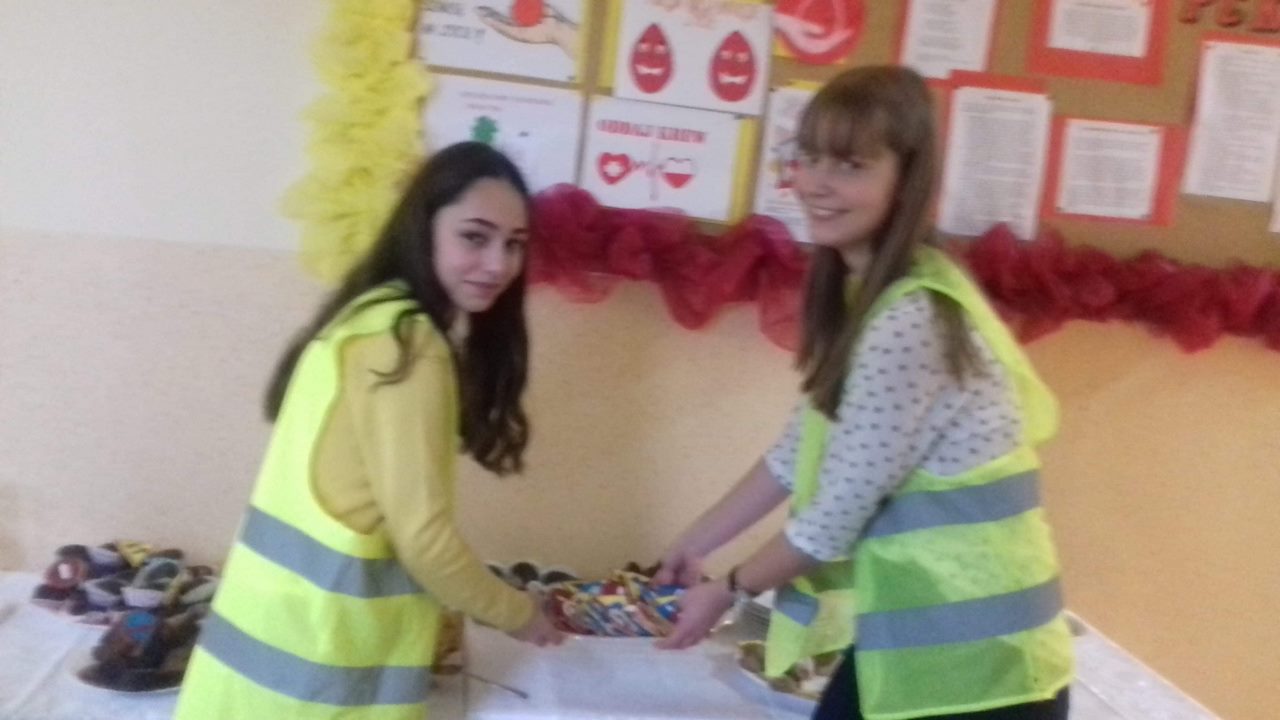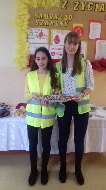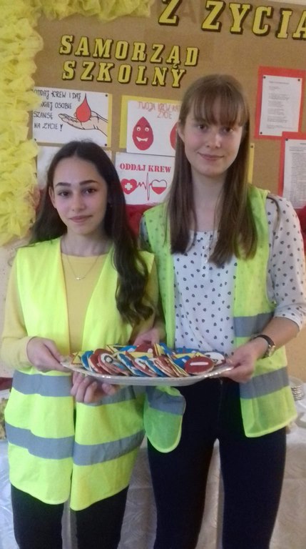 Przeprowadzona w naszej szkole 28 października Akcja Krwiodawstwa była kolejną już okazją do zwrócenia uwagi na konieczność noszenia kamizelek i elementów odblaskowych. Na stoliku „barowym”, do którego byli zapraszani krwiodawcy znalazły się specjalnie upieczone przez zaprzyjaźnioną mamę odblaskowe ciasteczka. Dziewczęta w odblaskowych kamizelkach nie tylko zapraszały do konsumpcji, ale również zwracały uwagę przybyłych na fakt, iż noszenie odblasków także może uratować zdrowie lub życie.