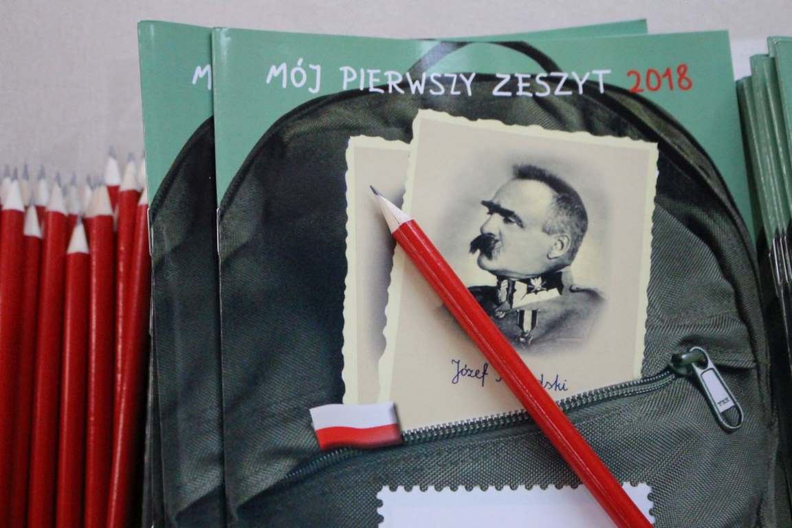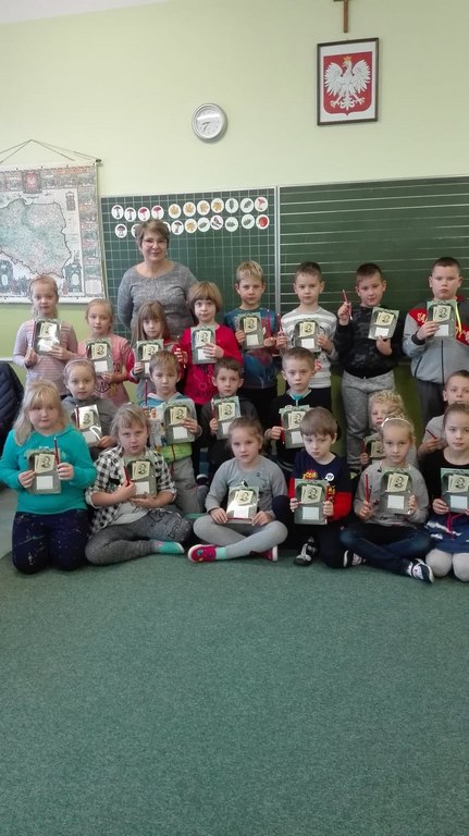 8 XI 2018 pani dyrektor Jadwiga Łucarz wręczyła uczniom klasy I pakiet edukacyjny „Mój pierwszy zeszyt” przygotowany przez Instytut Pamięci Narodowej z okazji setnej rocznicy odzyskania niepodległości. Pakiet ten składa się z zeszytu z wizerunkiem marszałka Józefa Piłsudskiego na okładce oraz ołówka z logotypem akcji #MojaNiepodległa. Małym Polakom tak bardzo podobał się zarówno zeszyt, jak i ołówek, że stwierdzili, iż zachowają je na pamiątkę niezwykłej rocznicy, jaką jest im dane przeżyć i świętować.