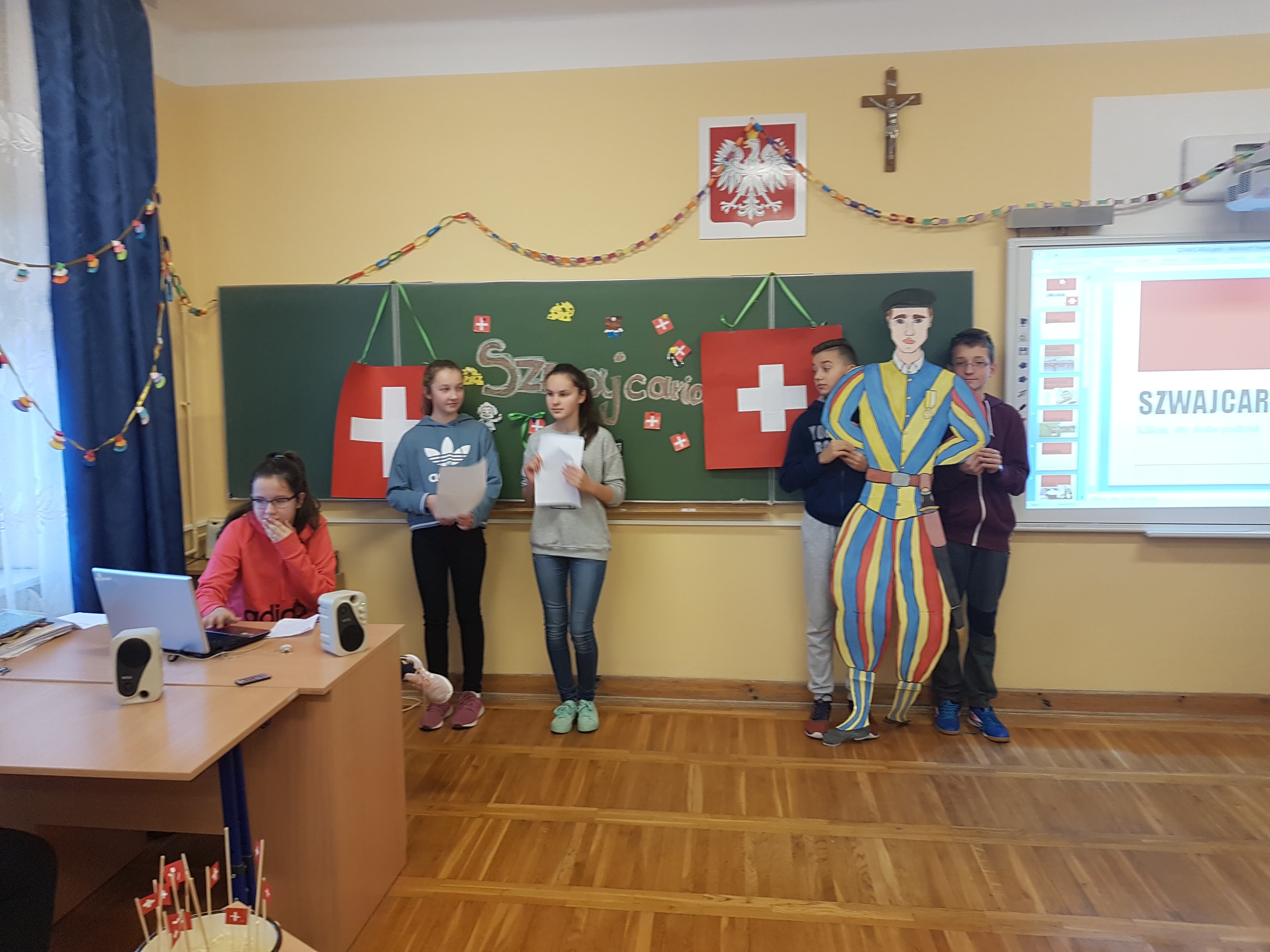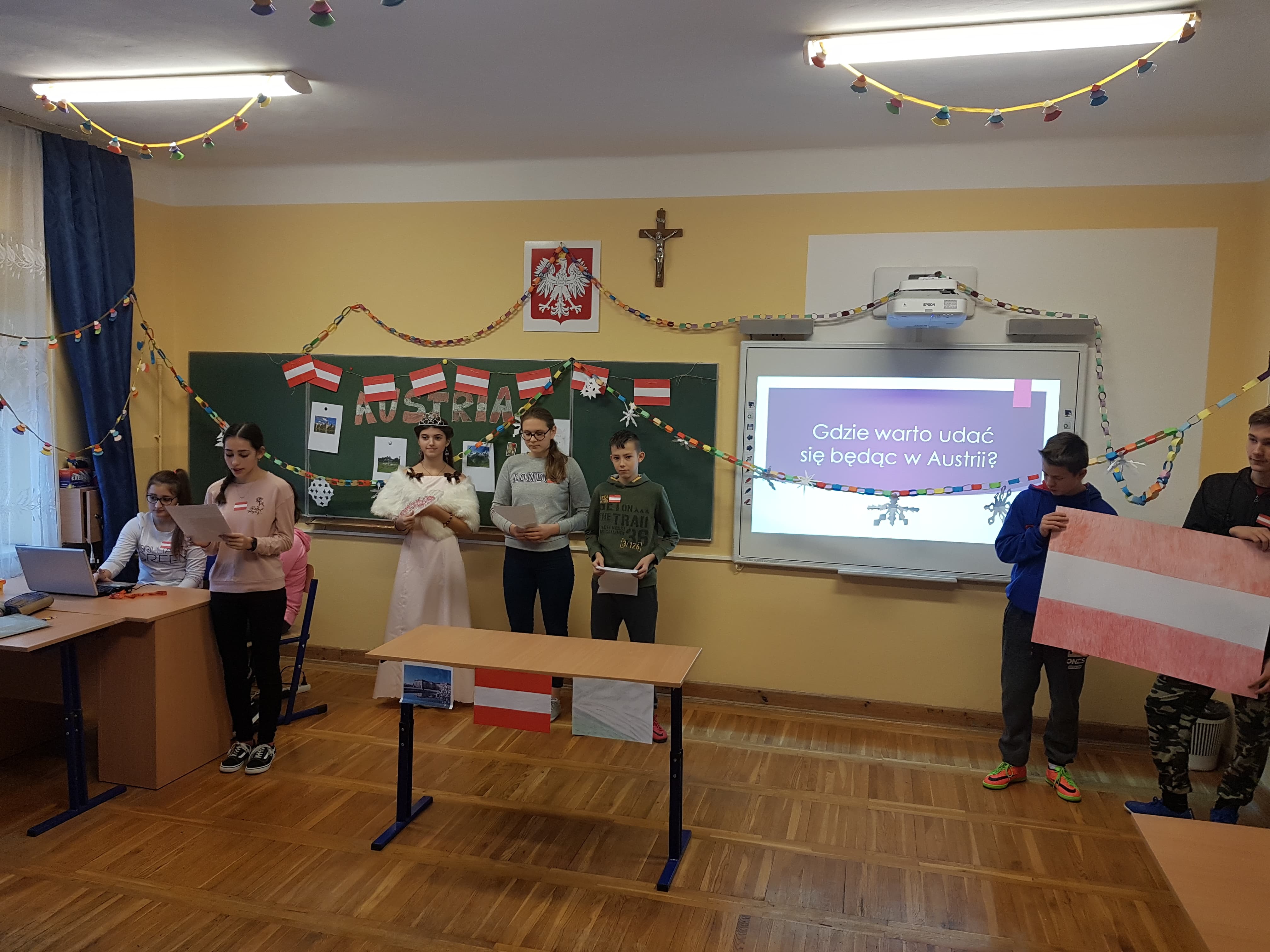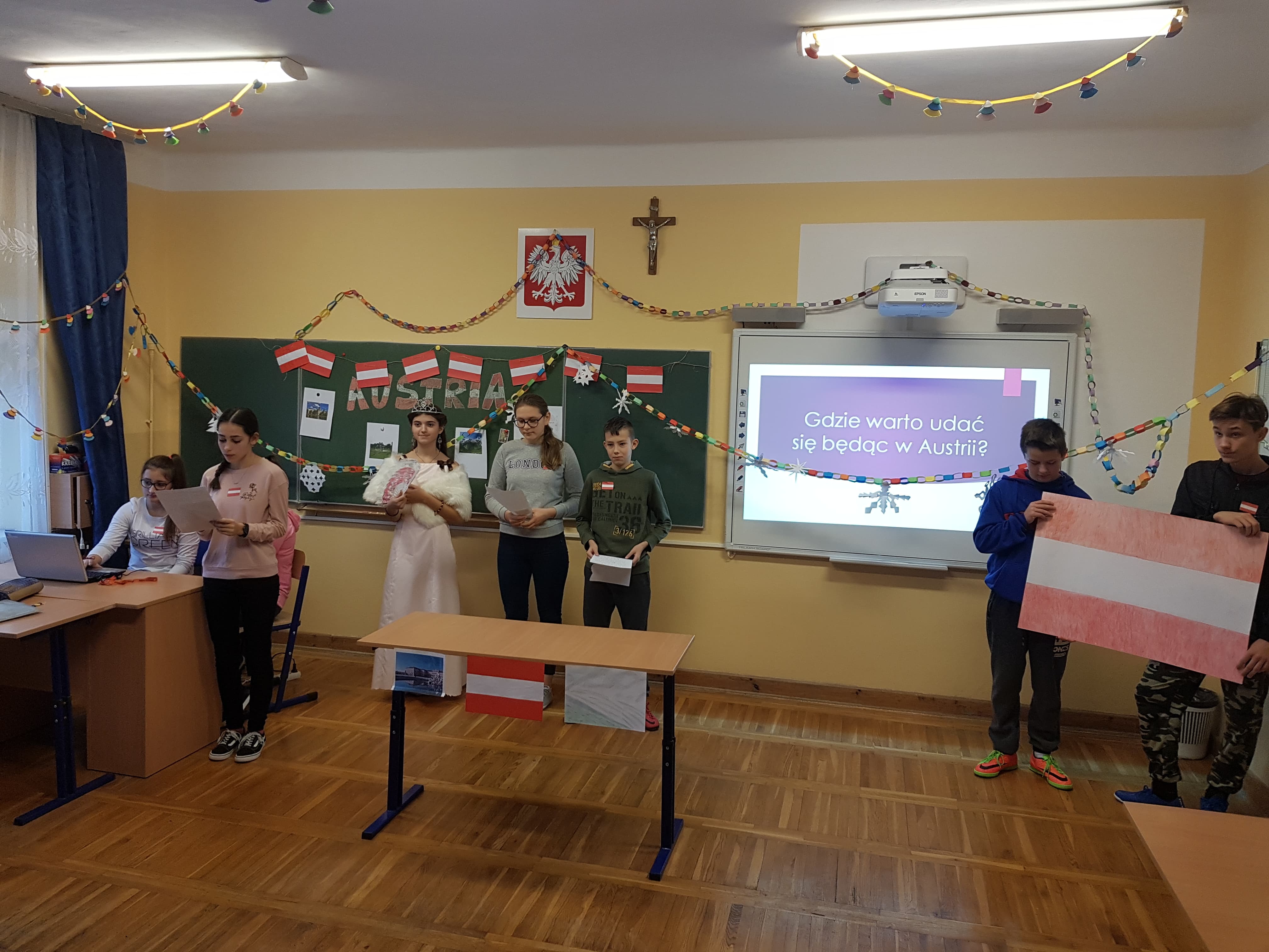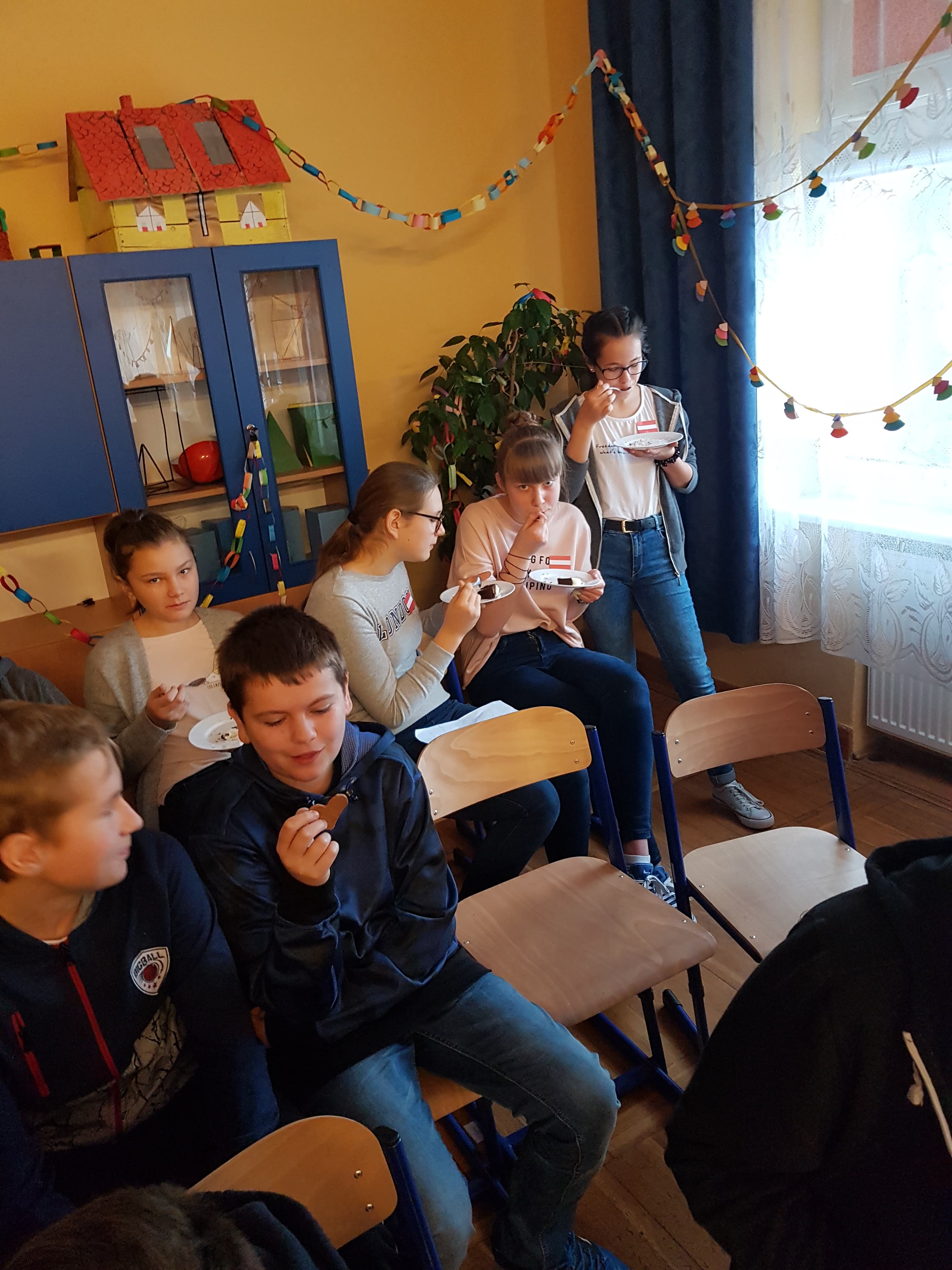 Klasa 7a, 7b i 8 uczestniczyły w projekcie języka niemieckiego „Co wiesz o krajach DACH?”. Zadaniem każdej klasy było przedstawienie kultury i tradycji wylosowanego państwa niemieckojęzycznego (Austria, Niemcy, Szwajcaria). Uczniowie wykazali się dużym zaangażowaniem w przydzielone im zadania i zaskakującą kreatywnością. Podczas pokazowych lekcji można było spotkać Alana – Żołnierza Gwardii Szwajcarskiej, Sissi – cesarzową Austrii, posłuchać utworów Bacha i Beethovena, zobaczyć najpiękniejsze miejsca krajów DACH, poznać zwyczaje adwentowe i świąteczne w Niemczech oraz (co okazało się najważniejsze) skosztować przysmaków z tych krajów np. pysznego fondue, tortu Sachera, pierniczków czy sałatki kartoflanej.