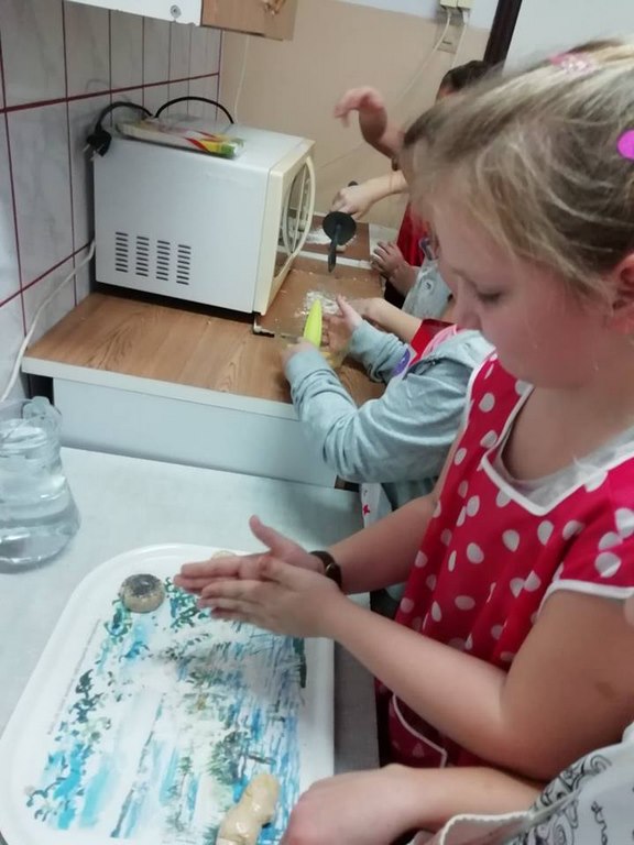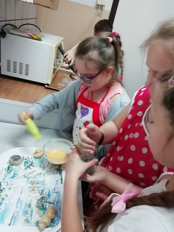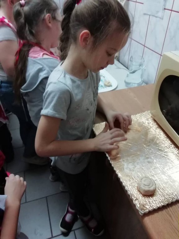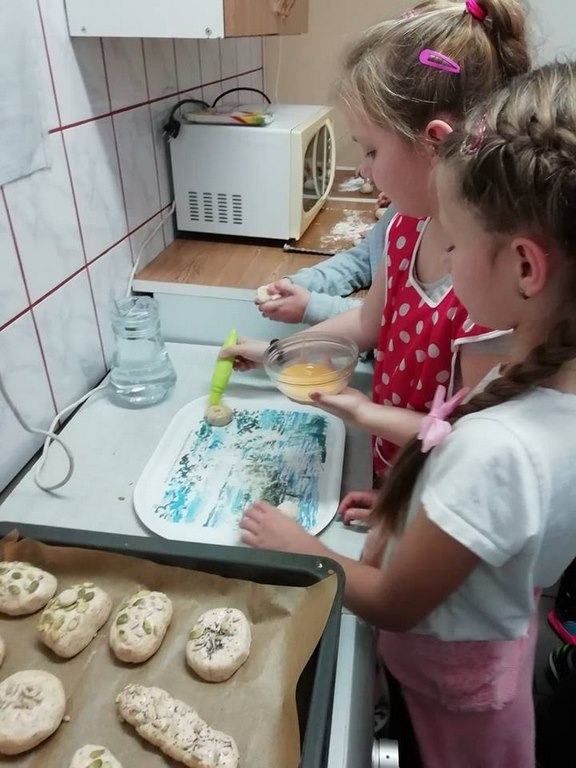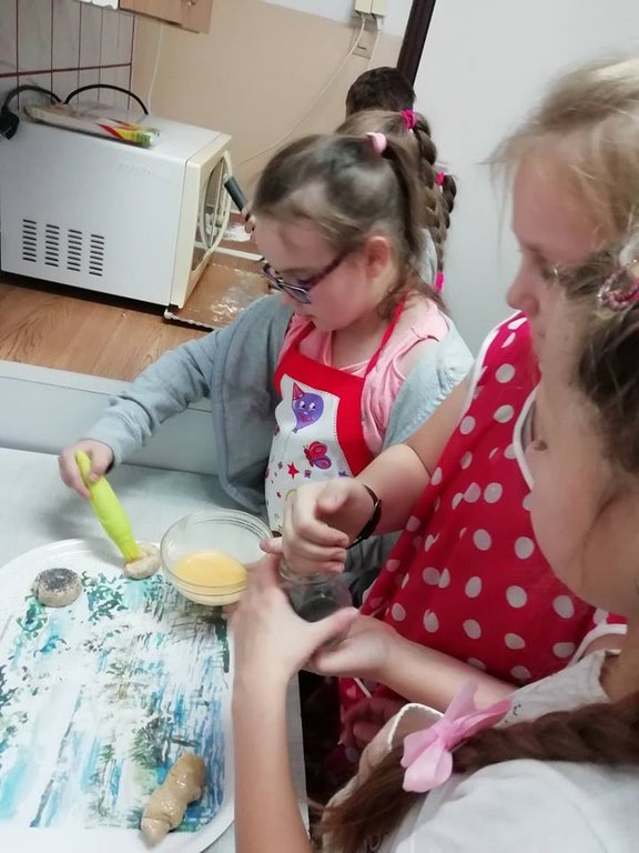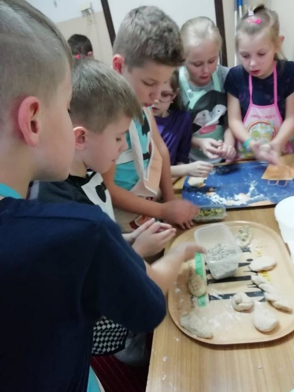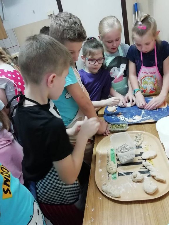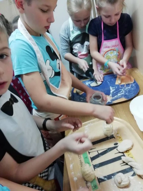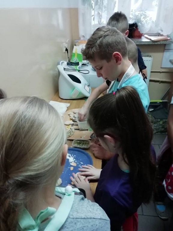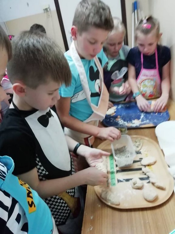 Uczniowie klasy II w ubiegłym tygodniu rozpoczęli warsztaty kulinarne pod hasłem „Gotuj z pomysłem smacznie i zdrowo”. Podczas tych zajęć będą poznawać zasady prawidłowego odżywiania oraz kształtować swoje praktyczne umiejętności kulinarne. Pomysł zorganizowania takich zajęć zyskał uznanie i poparcie wśród rodziców, którym to wychowawca klasy nakreślił sposób i cel zajęć przy okazji zebrania rodziców. W trakcie pierwszego spotkania uczniowie wykonali bułeczki pszenne i przygotowali sok ze świeżych owoców (pomarańczy, cytryn). Warsztaty kulinarne są rodzajem zajęć pozalekcyjnych, cieszących się dużym zainteresowaniem wśród dzieci. Odzwierciedleniem tego było ogromne zaangażowanie i pasja z jaka dzieci podeszły do realizacji wyznaczonego im zadania już w trakcie pierwszych zajęć. Po upieczeniu bułeczek wszyscy z apetytem degustowali przygotowane własnoręcznie wypieki. Z pewnością zajęcia te wpłyną korzystnie na proces lepszej integracji uczniów, jak również będą okazja do poznawania otaczającego świata, a wszystko dzięki osobistemu doświadczeniu, przezywaniu i zaangażowaniu wielu zmysłów podczas pracy w grupie. Należy pamiętać, ze owoce i warzywa są istotnym źródłem witamin i soli mineralnych, dlatego ich spożywanie jest niezwykle istotne. Proponowane uczniom zajęcia będą zatem doskonałą okazja pozyskania wielu pomysłów na przygotowanie różnorodnych, wartościowych posiłków z wykorzystaniem warzyw i owoców.