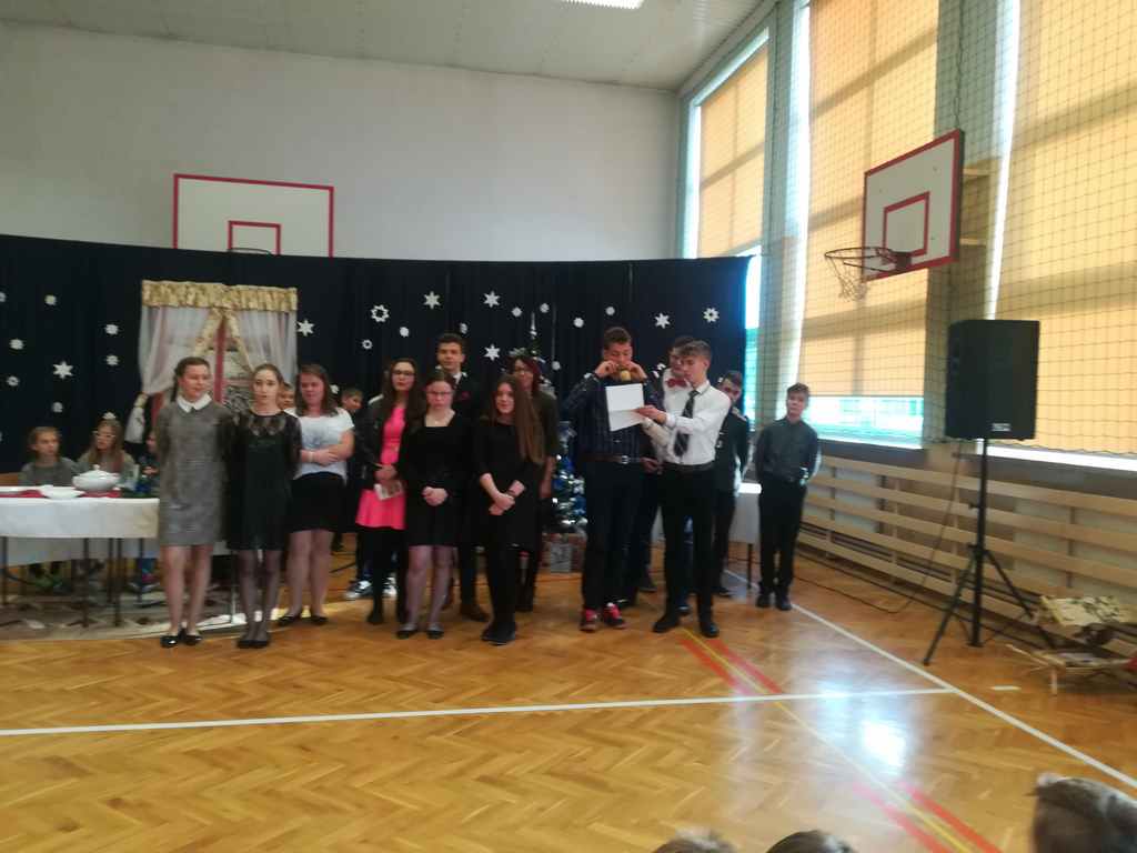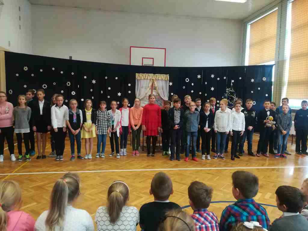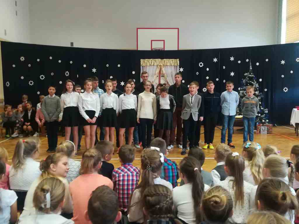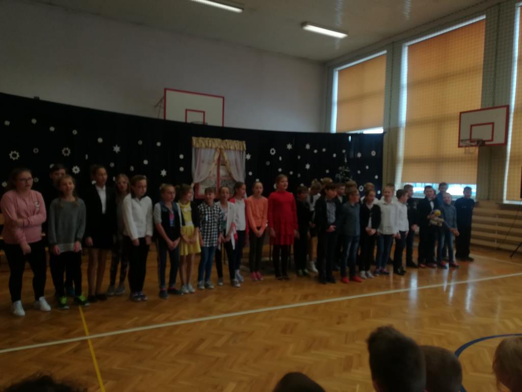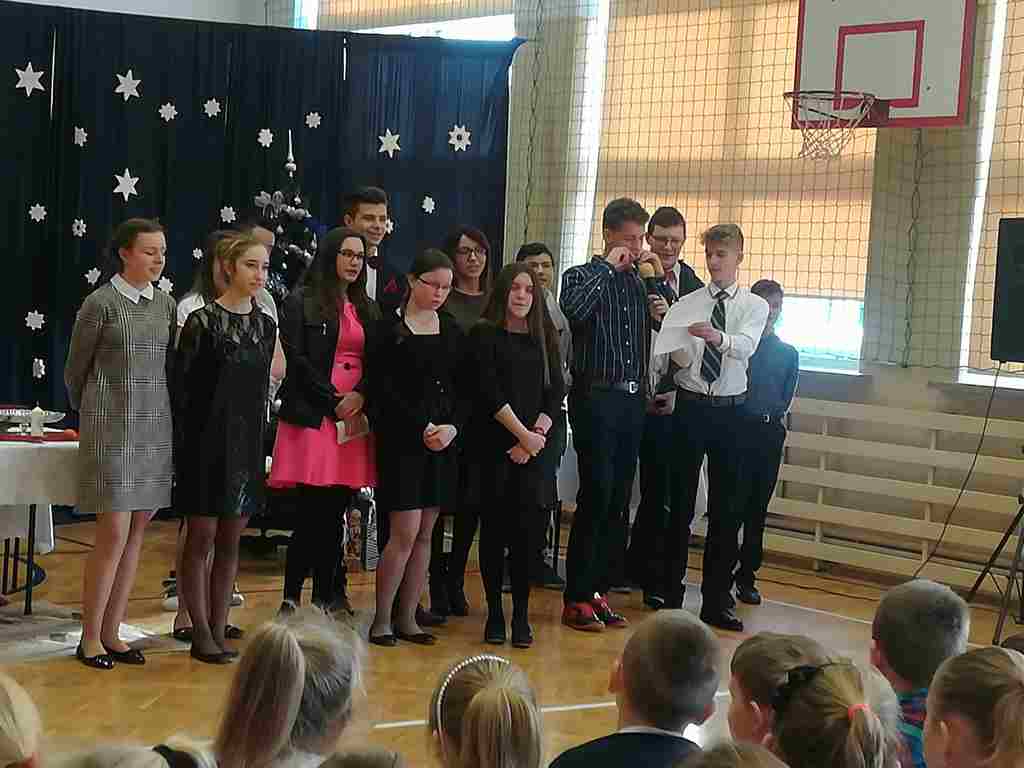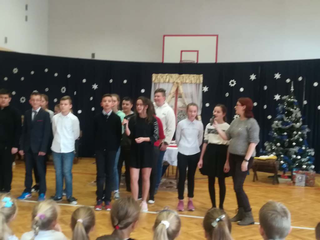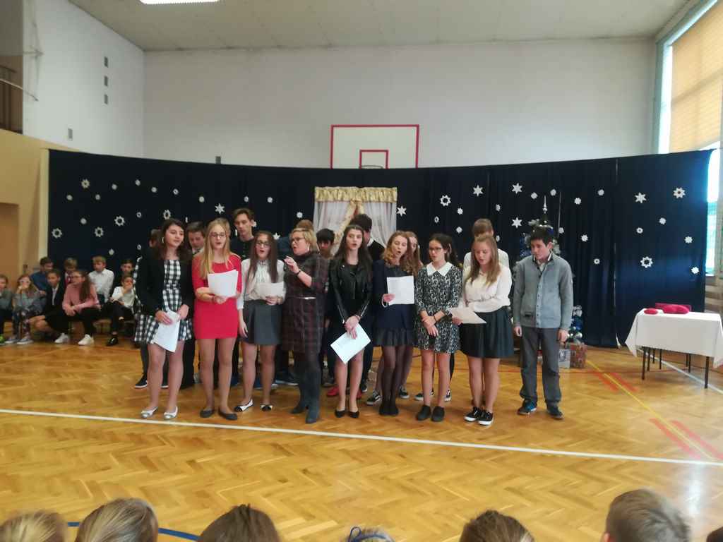 Po części oficjalnej wszyscy uczniowie wraz z nauczycielami wzięli udział we wspólnym kolędowaniu. Podobnie jak w roku poprzednim każda klasa przygotowała wylosowaną wcześniej kolędę lub pastorałkę. I choć z założenia był to międzyklasowy konkurs, to jednak z przygotowanych aranżacji trudno było wybrać zwycięzcę – wszyscy śpiewali pięknie, więc wszyscy wygrali 🙂
