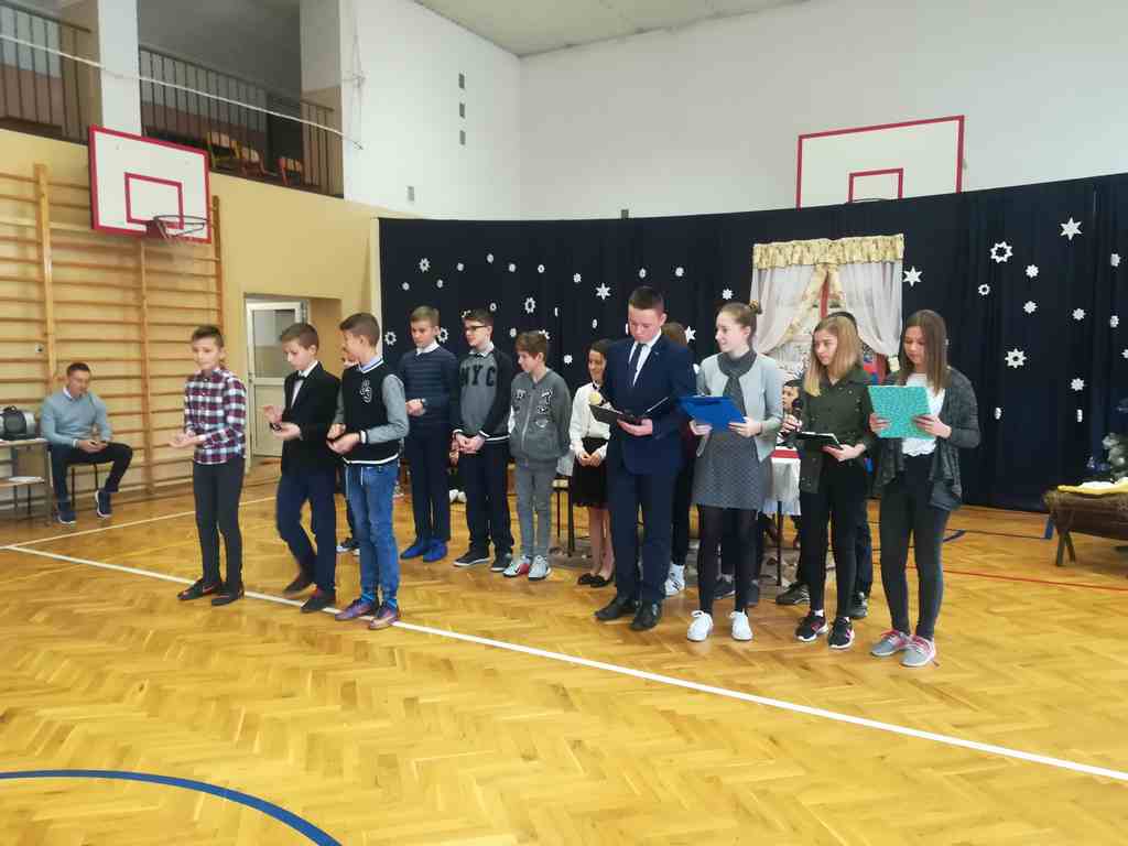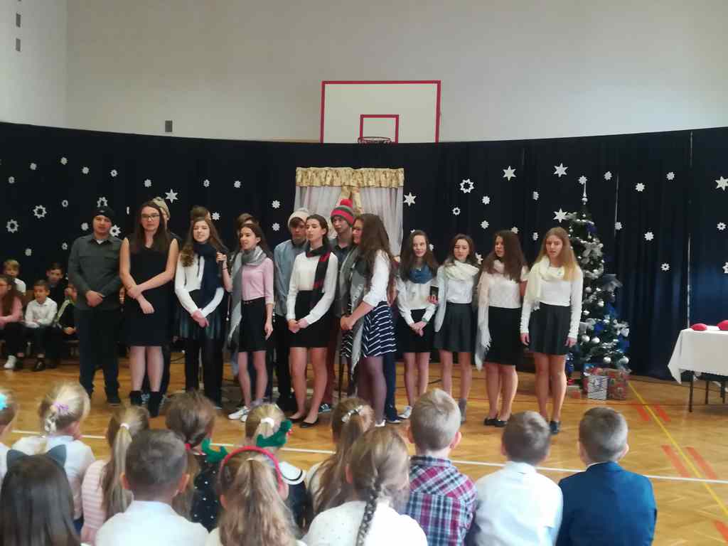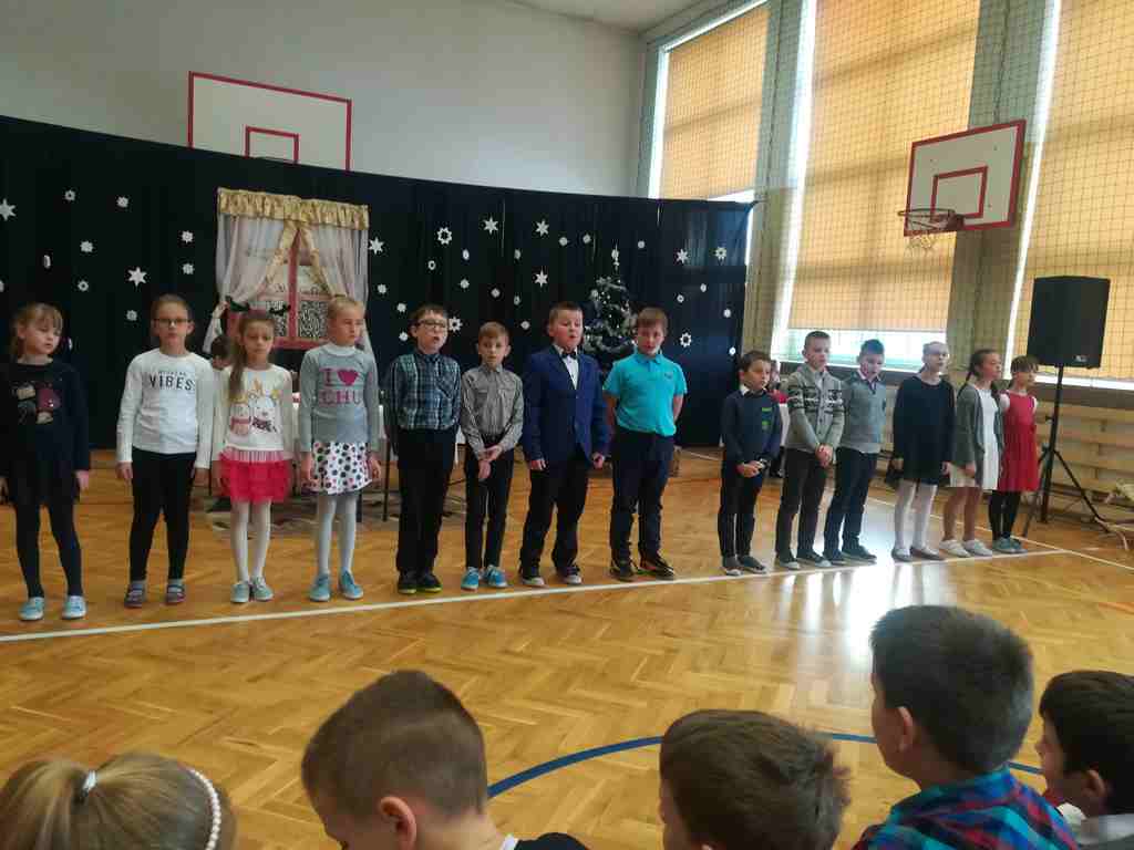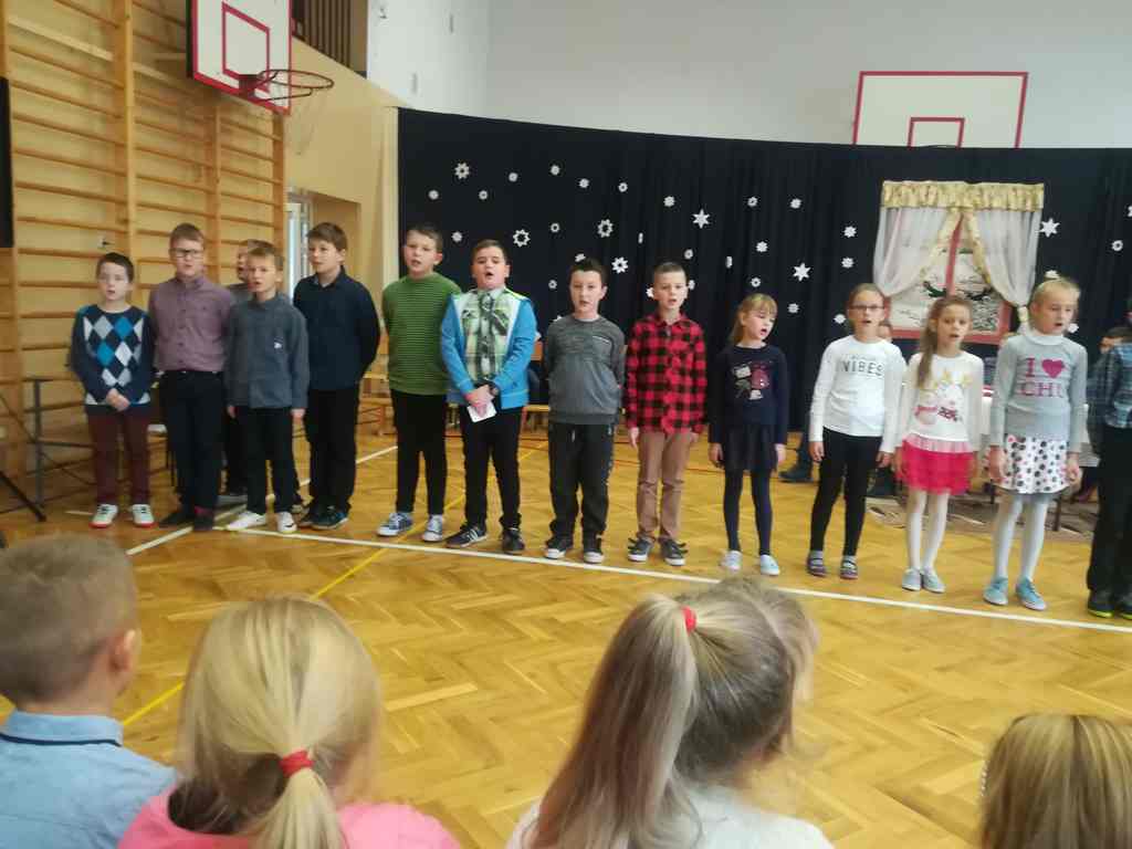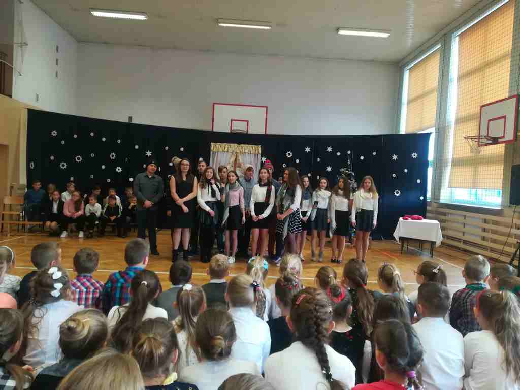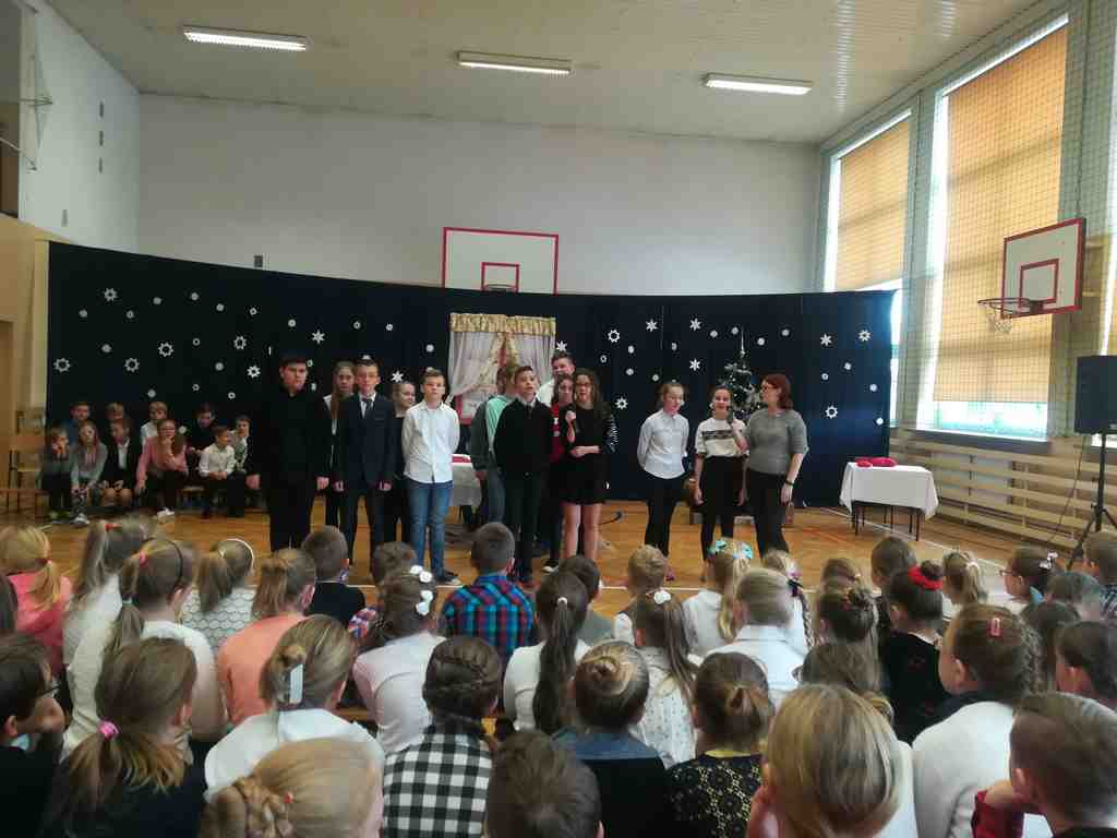 Po części oficjalnej wszyscy uczniowie wraz z nauczycielami wzięli udział we wspólnym kolędowaniu. Podobnie jak w roku poprzednim każda klasa przygotowała wylosowaną wcześniej kolędę lub pastorałkę. I choć z założenia był to międzyklasowy konkurs, to jednak z przygotowanych aranżacji trudno było wybrać zwycięzcę – wszyscy śpiewali pięknie, więc wszyscy wygrali 🙂