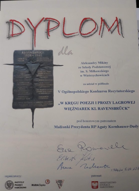 W Centrum Edukacyjnym „Przystanek Historia” w Krakowie 5 marca odbyły się eliminacje dla województwa małopolskiego V Ogólnopolskiego Konkursu Recytatorskiego „W kręgu poezji i prozy lagrowej więźniarek KL Ravensbrück. Wśród ponad 30 uczestników znalazła się także uczennica naszej szkoły – Aleksandra Mikina z klasy IIIa, która zaprezentowała wybrany wiersz oraz fragment prozy („Wspomnienia wojenne” K. Lanckorońska).