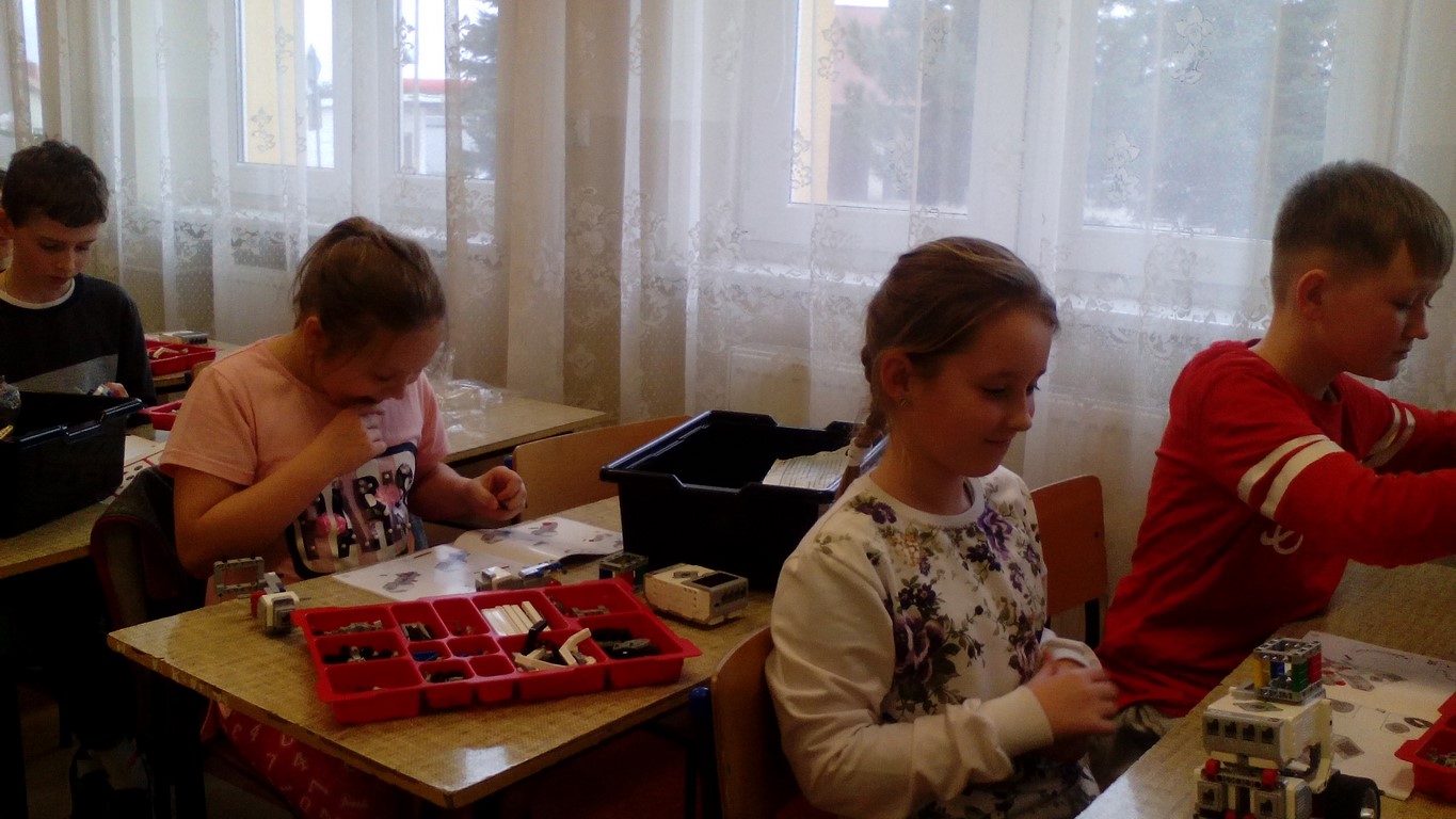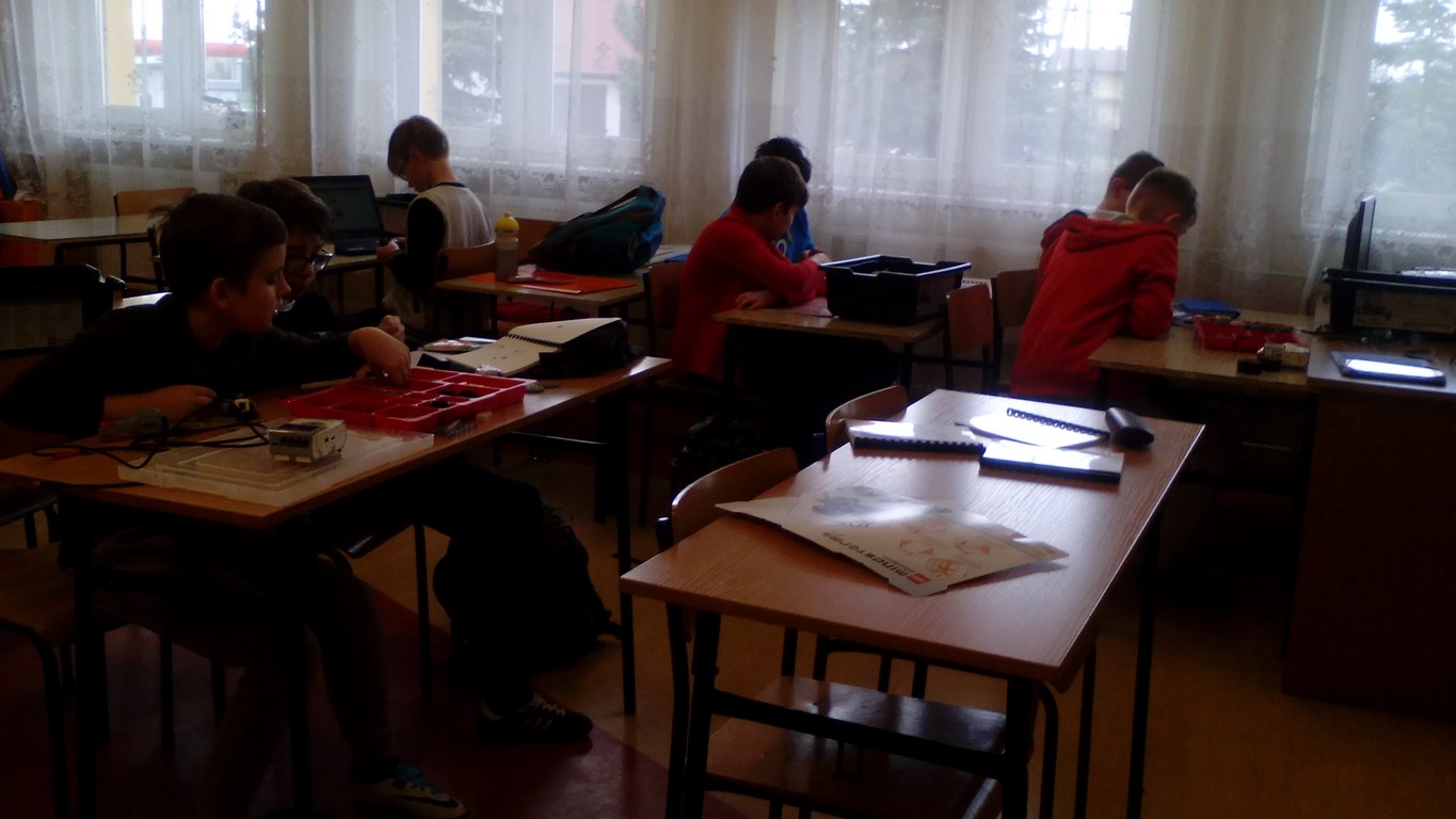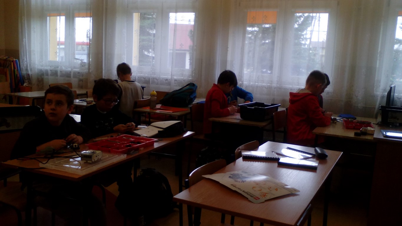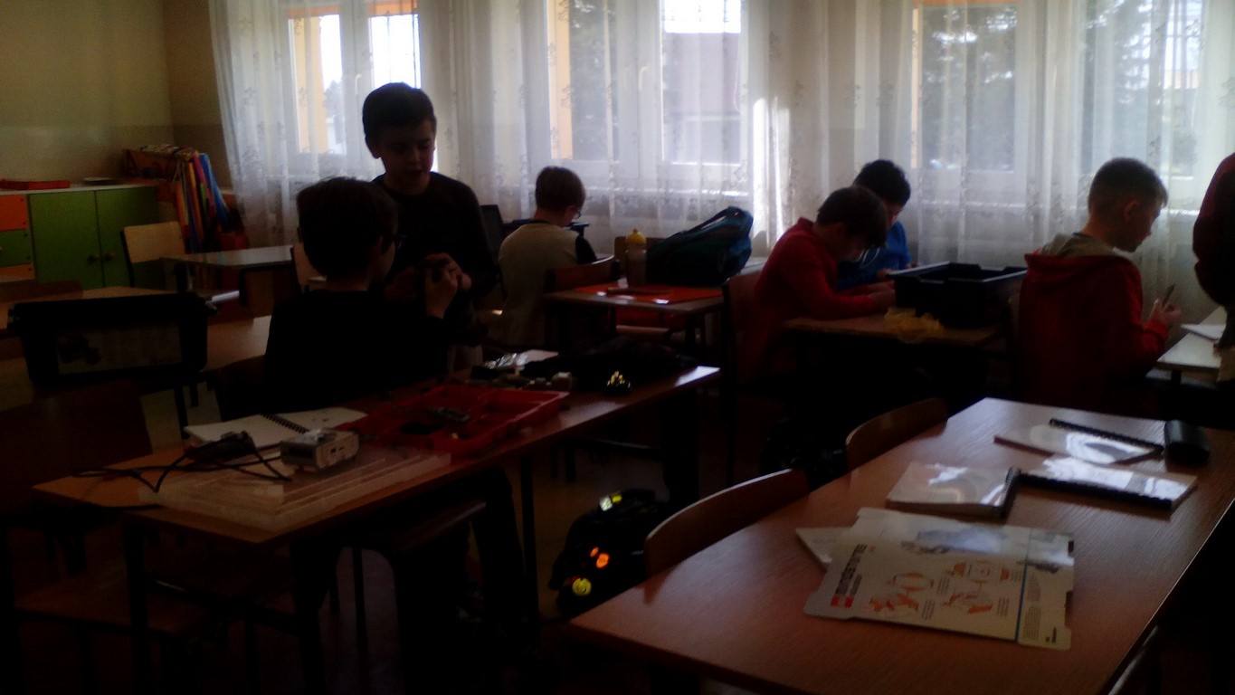 Uczniowie pracują w dwóch grupach ośmioosobowych, po dwie osoby przy jednym zestawie. Wiele radości daje im budowanie robotów z maleńkich elementów, a następnie wprawianie ich w ruch. Nasze „stworki – robotki” potrafią jeździć po linii, wykrywają kolory, przeszkody i odpowiedni na nie reagują. Oczywiście wymaga to dużej sprawności i wytrwałości, aby robot dokładnie wykonywał polecenia konstruktora. Obowiązkowo urządzaliśmy także wyścigi naszych maszyn. Konstruktorzy musieli włożyć wiele wysiłku aby ułożyć program, który powoduje że jego robot jedzie najszybciej, najszybciej i najdokładniej pokonuje przeszkody i oczywiście wraca do twórcy. Teraz budujemy pieska. mając nadzieje że okaże się naszym elektronicznym przyjacielem.