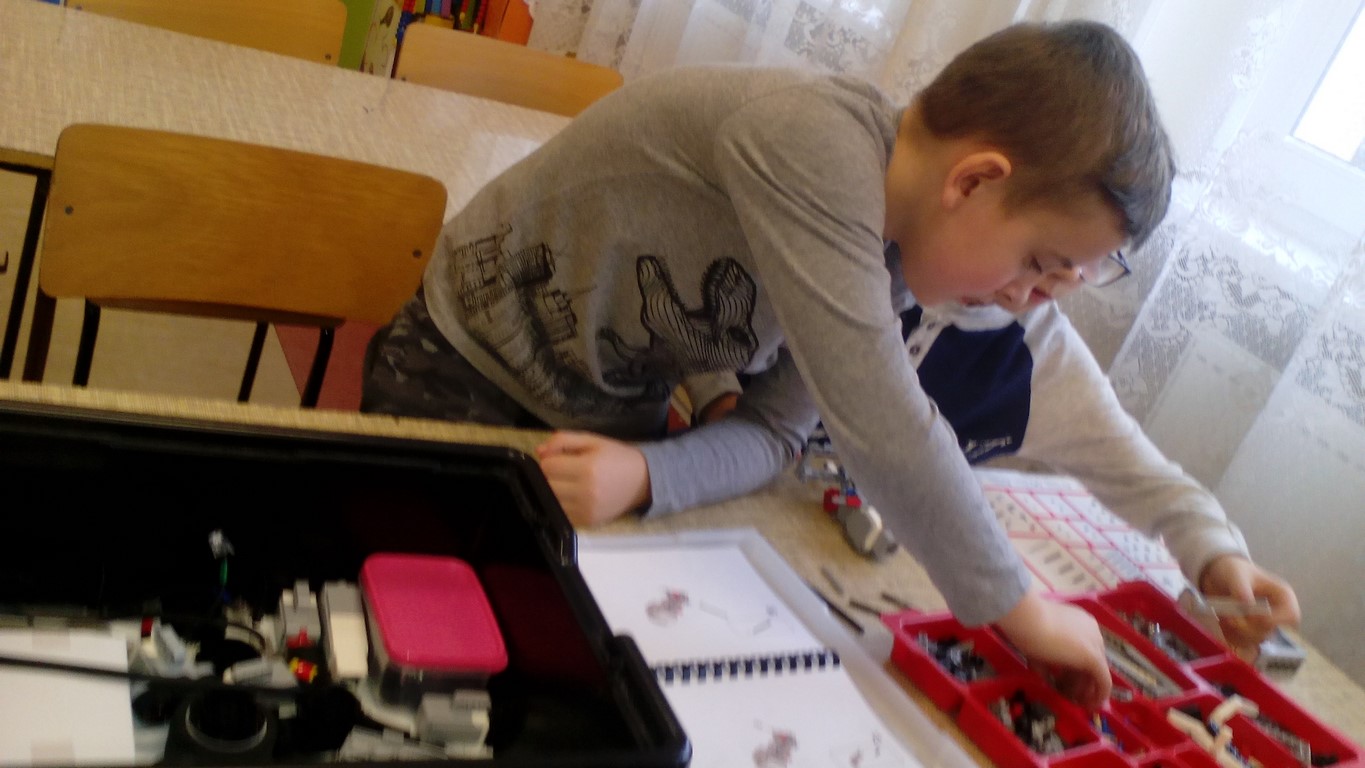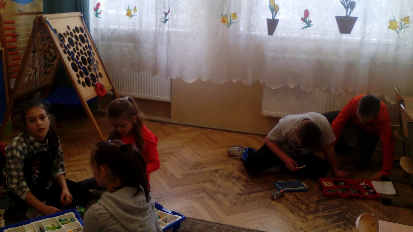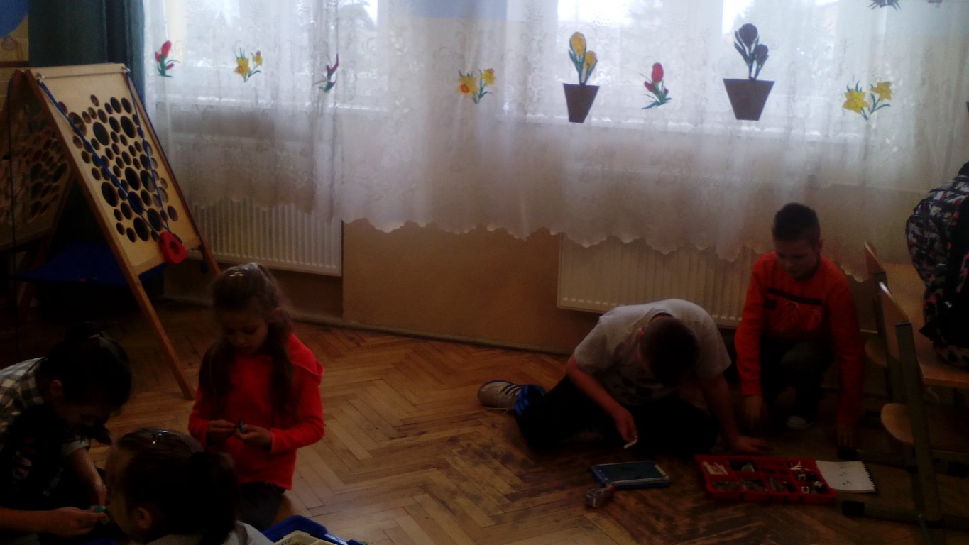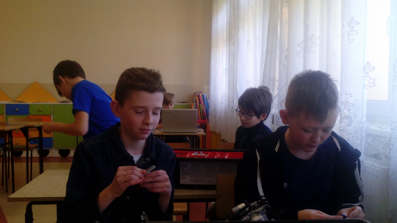 Uczniowie pracują w dwóch grupach ośmioosobowych, po dwie osoby przy jednym zestawie. Wiele radości daje im budowanie robotów z maleńkich elementów, a następnie wprawianie ich w ruch. Nasze „stworki – robotki” potrafią jeździć po linii, wykrywają kolory, przeszkody i odpowiedni na nie reagują. Oczywiście wymaga to dużej sprawności i wytrwałości, aby robot dokładnie wykonywał polecenia konstruktora. Obowiązkowo urządzaliśmy także wyścigi naszych maszyn. Konstruktorzy musieli włożyć wiele wysiłku aby ułożyć program, który powoduje że jego robot jedzie najszybciej, najszybciej i najdokładniej pokonuje przeszkody i oczywiście wraca do twórcy. Teraz budujemy pieska. mając nadzieje że okaże się naszym elektronicznym przyjacielem.