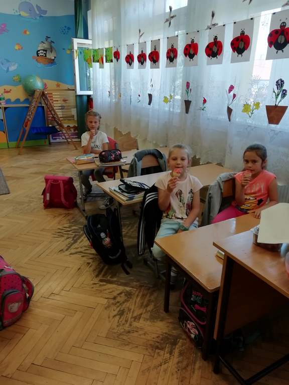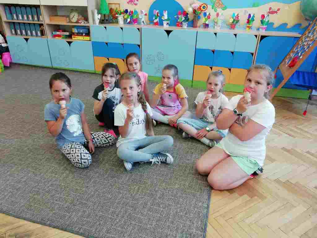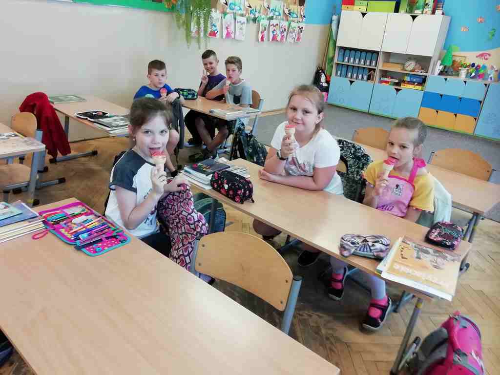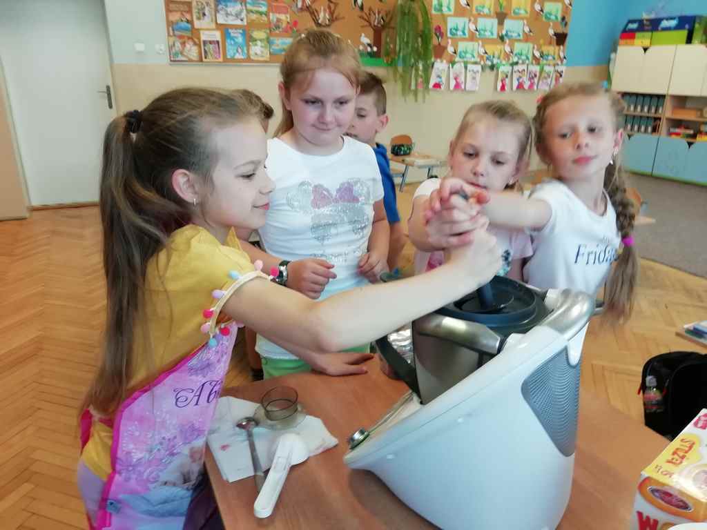 Podczas ostatnich zajęć kulinarnych  „Gotuj z pomysłem smacznie i zdrowo” uczniowie poznawali przepisy na wykonanie domowych lodów, wykorzystując dostępne owoce z naszych ogrodów. Uczniowie nie mogli się już doczekać zajęć o takiej tematyce z uwagi na upały, których obecnie doświadczamy. Ilość lodów, którą przygotowali była tak duża, że częstowano nimi niektórych pracowników szkoły i chętnych uczniów. Lody wszystkim bardzo smakowały i cieszyły się wielkim powodzeniem. Przepis na wykonanie lodów uczniowie starali się zapamiętać aby przekazać w swoich domach do ponownego przygotowania.
