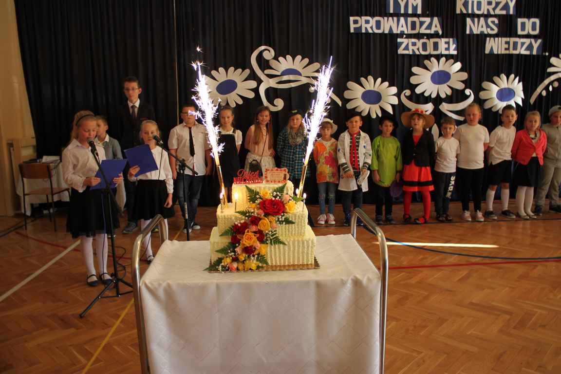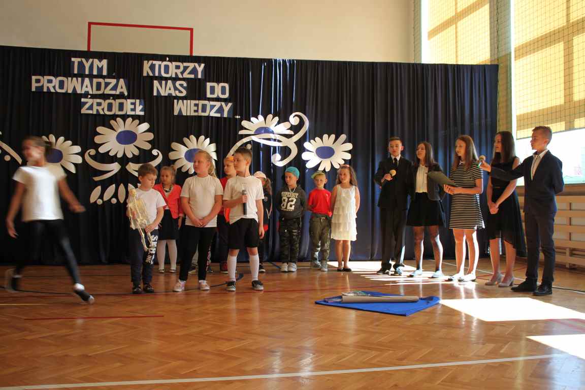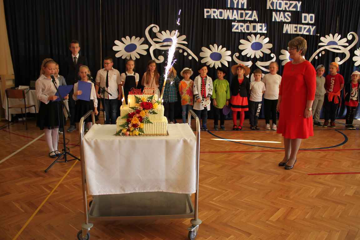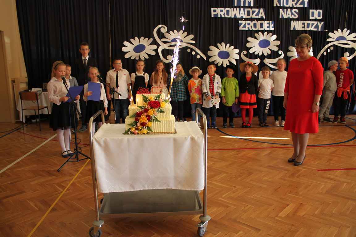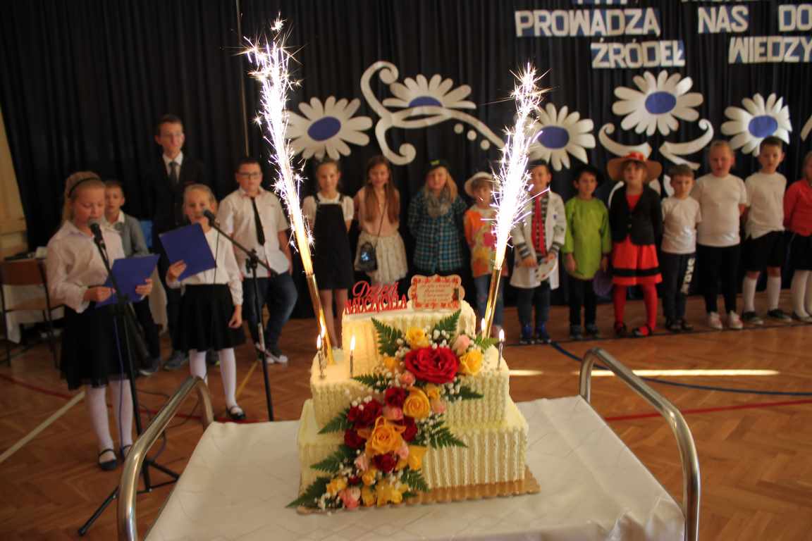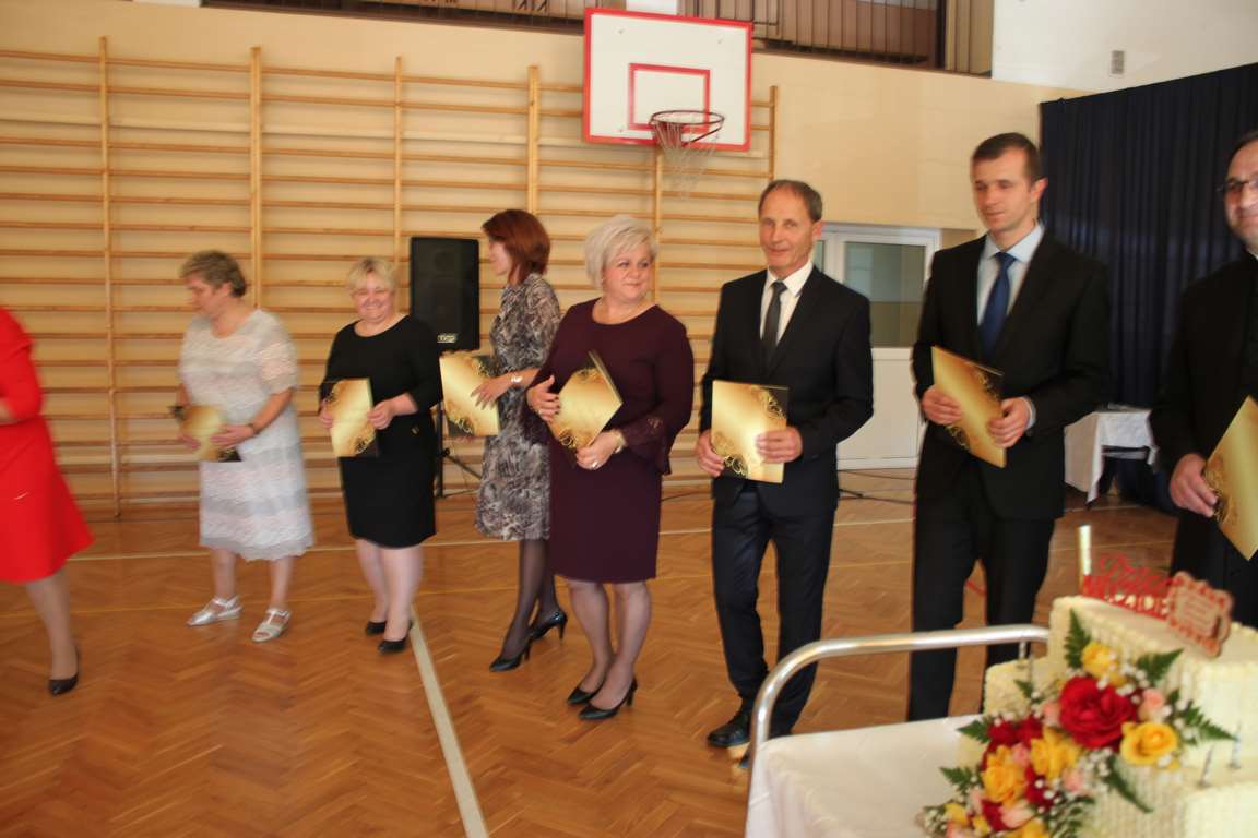 Dziś w naszej szkole odbyła się uroczystość z okazji Dnia Edukacji Narodowej, zwanego również Dniem Nauczyciela. Obchody rozpoczęliśmy modlitwą różańcową w kościele parafialnym w Wietrzychowicach, następnie zaś zgromadziliśmy się na sali gimnastycznej, gdzie klasy II i VIII b przedstawiły piękną akademię z humorem prezentującą życie szkoły, przygotowaną pod kierunkiem pań: Alicji Kozioł i Anny Sochy. Po części artystycznej, wójt gminy, pan Tomasz Banek oraz dyrektor szkoły, pani Jadwiga Łucarz, wręczyli nagrody wyróżniającym się nauczycielom i pracownikom szkoły. W świętowaniu tradycyjnie towarzyszyli nam liczni przyjaciele szkoły, którym serdecznie dziękujemy za obecność i chęć przeżywania z nami dzisiejszej uroczystości.