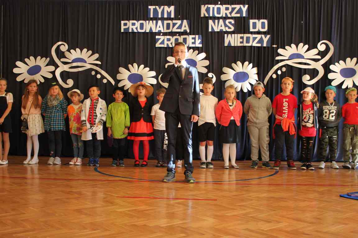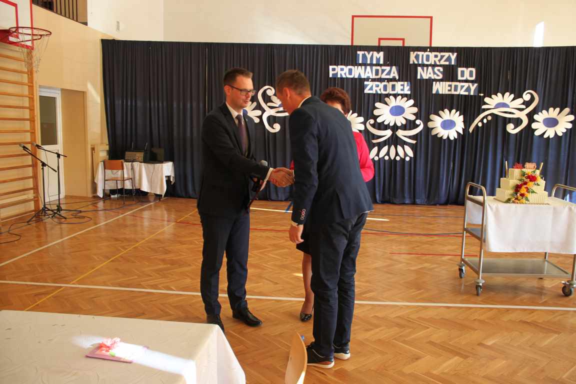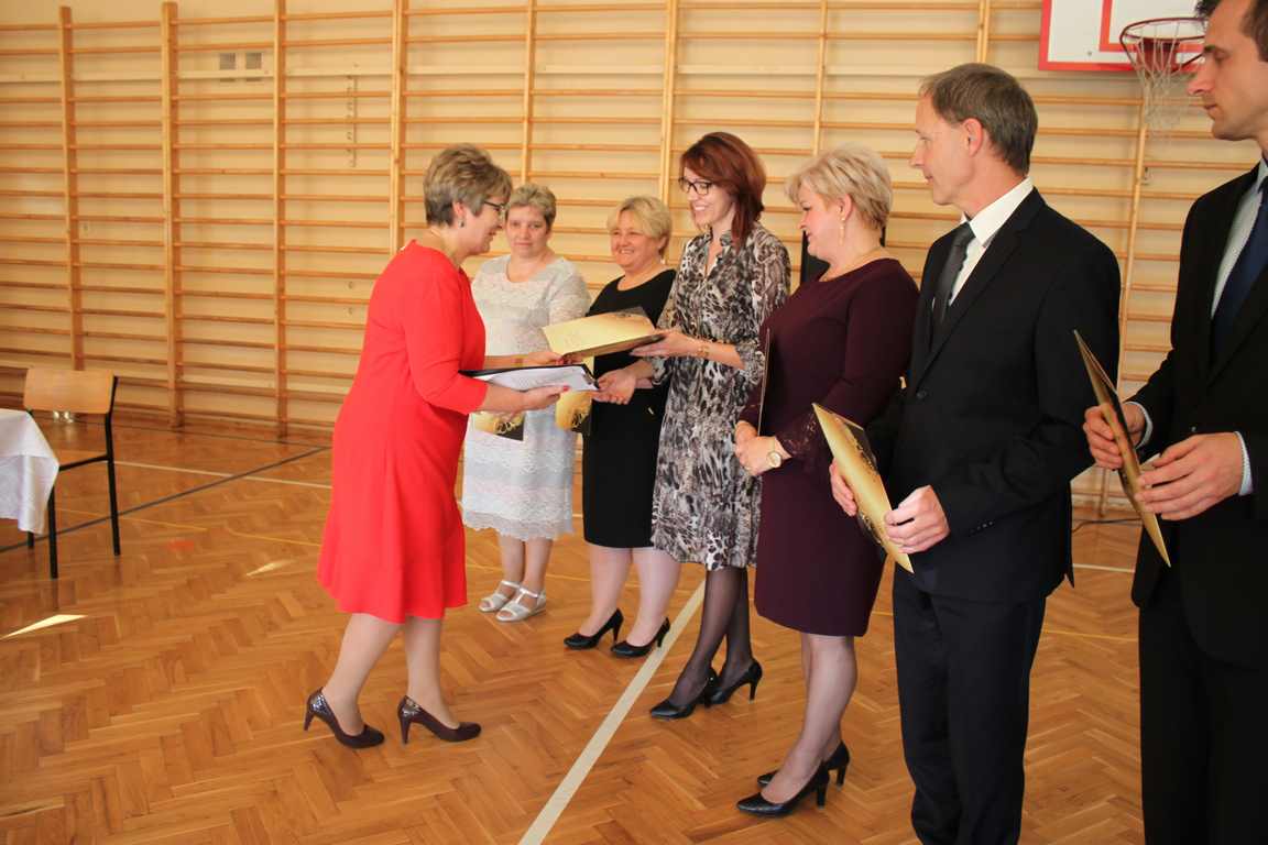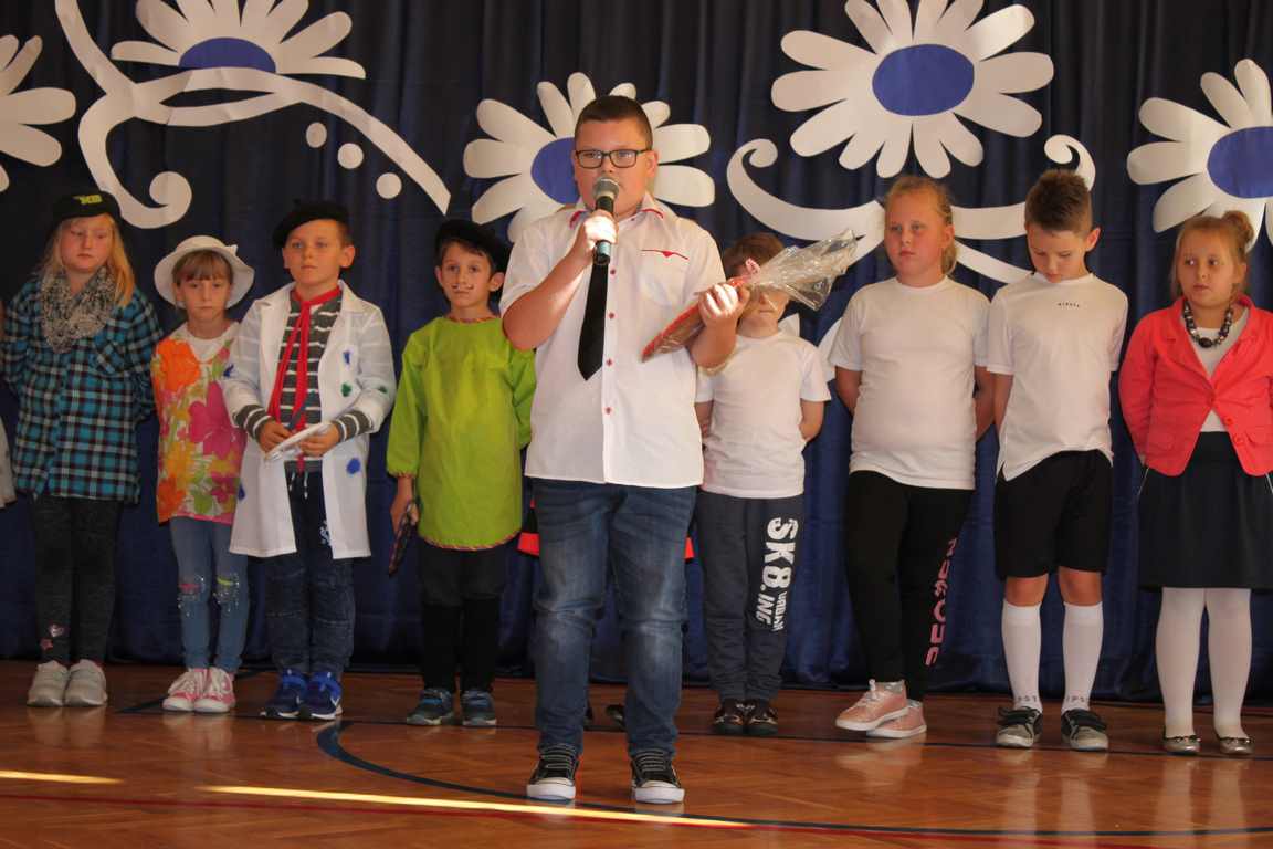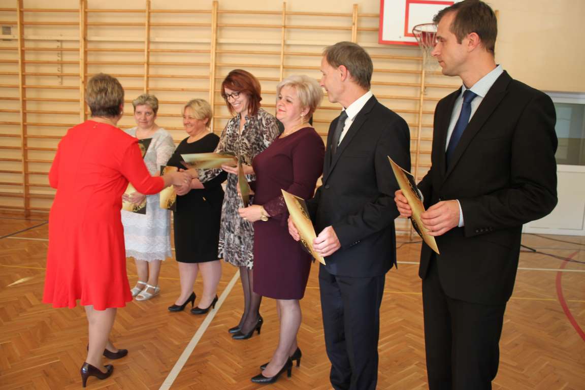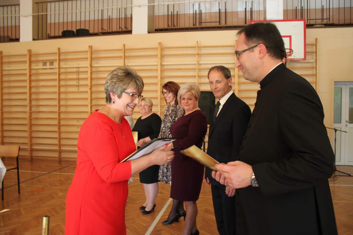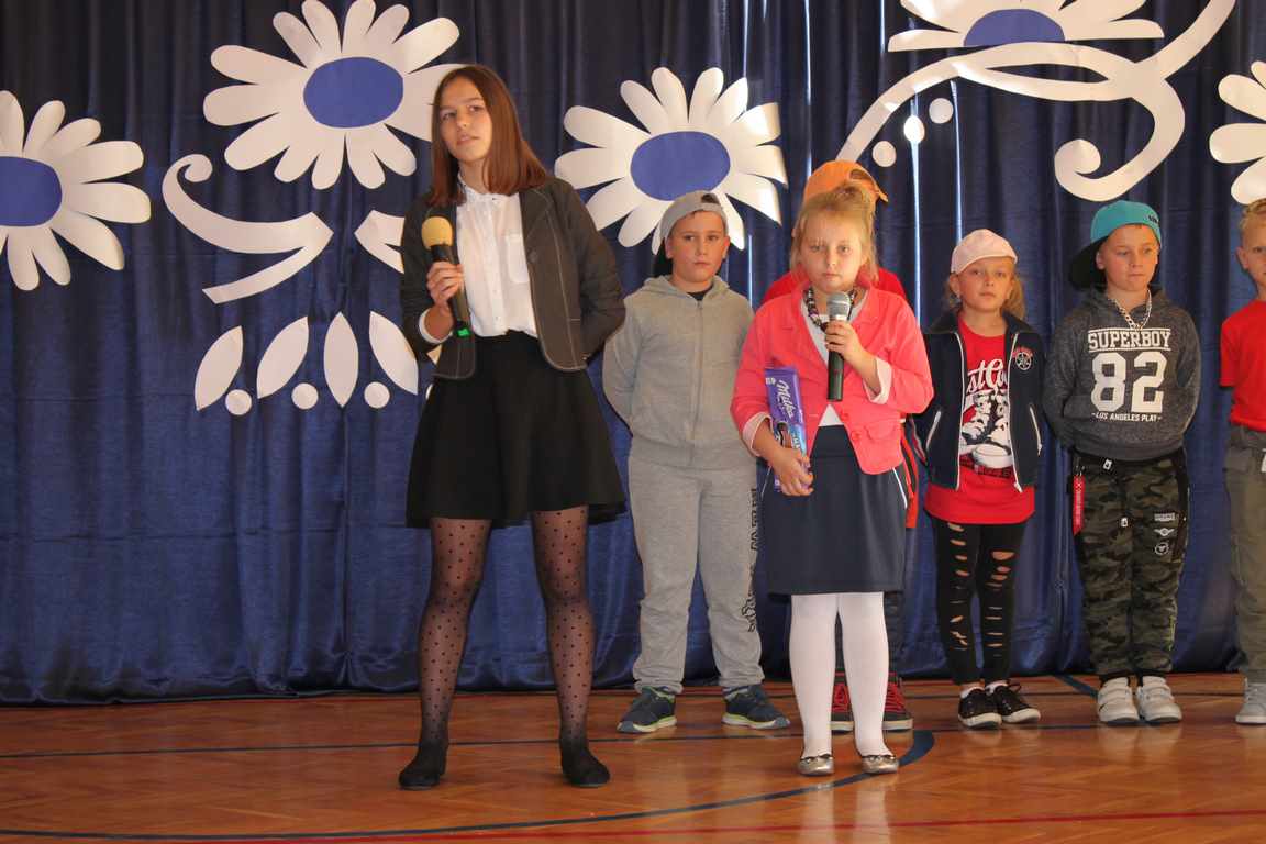 Dziś w naszej szkole odbyła się uroczystość z okazji Dnia Edukacji Narodowej, zwanego również Dniem Nauczyciela. Obchody rozpoczęliśmy modlitwą różańcową w kościele parafialnym w Wietrzychowicach, następnie zaś zgromadziliśmy się na sali gimnastycznej, gdzie klasy II i VIII b przedstawiły piękną akademię z humorem prezentującą życie szkoły, przygotowaną pod kierunkiem pań: Alicji Kozioł i Anny Sochy. Po części artystycznej, wójt gminy, pan Tomasz Banek oraz dyrektor szkoły, pani Jadwiga Łucarz, wręczyli nagrody wyróżniającym się nauczycielom i pracownikom szkoły. W świętowaniu tradycyjnie towarzyszyli nam liczni przyjaciele szkoły, którym serdecznie dziękujemy za obecność i chęć przeżywania z nami dzisiejszej uroczystości.