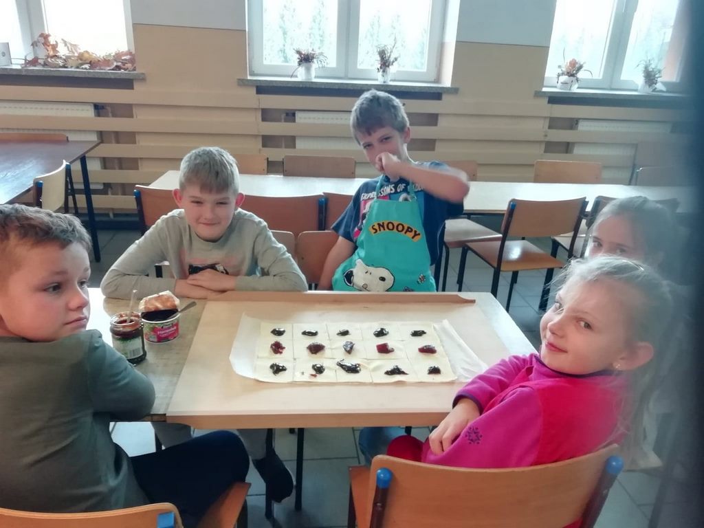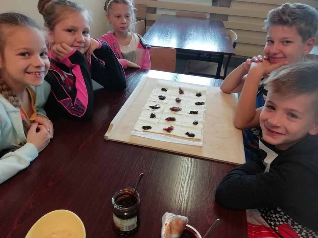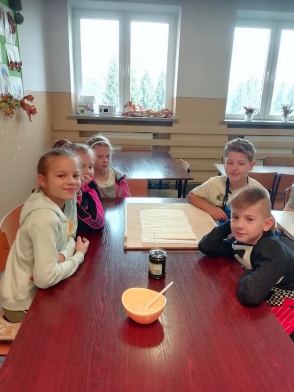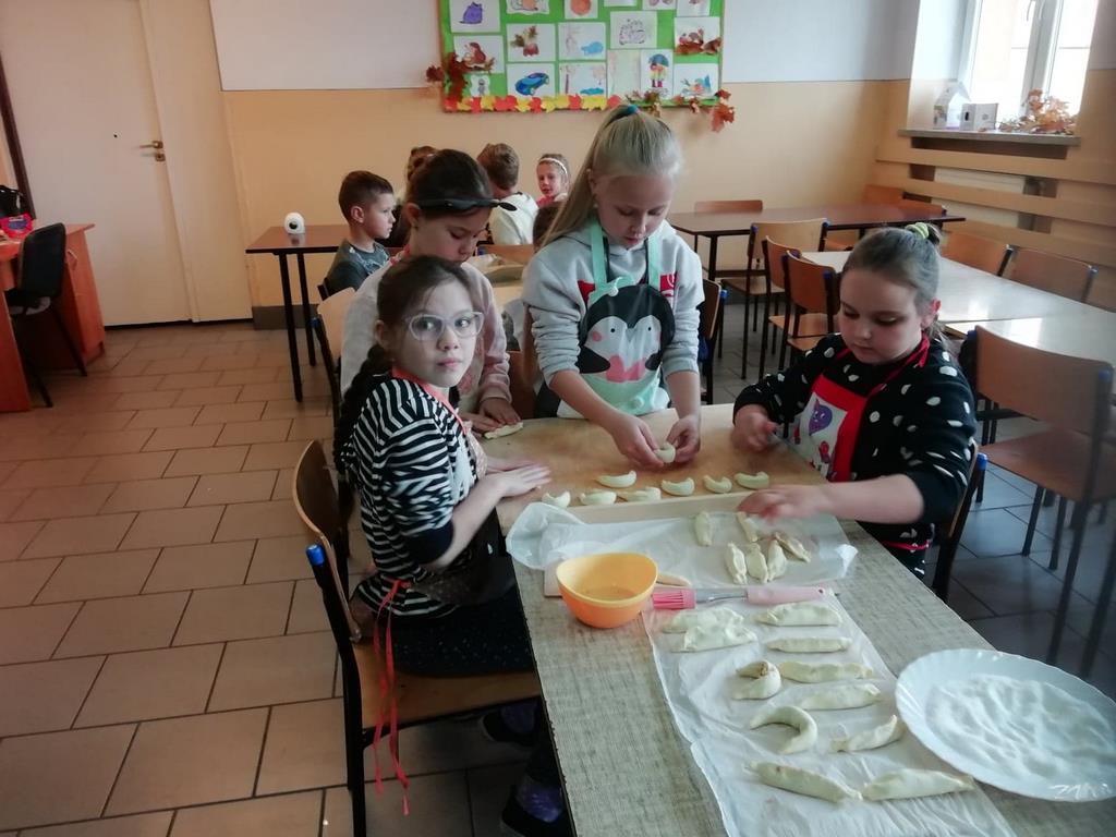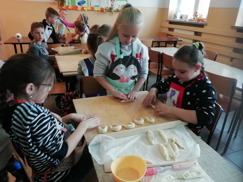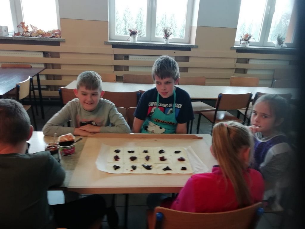 Uczniowie klasy trzeciej w obecnym roku szkolnym rozpoczęli kolejny cykl zajęć kulinarnych „Gotuj z pomysłem smacznie i zdrowo”. Zajęcia te cieszą się dużym zainteresowaniem dzieci. Podczas ostatnich zajęć uczniowie w trzech grupach wykonywali rogaliki, które nadziewane były powidłami domowej produkcji z wykorzystaniem owoców z naszych sadów i ogrodów.  Na kolejne spotkanie – listopadowe, uczniowie zaproponowali jednogłośnie by podczas zajęć przygotowane zostały muffinki oraz sok ze świeżych owoców i warzyw, które będą stanowiły przekąskę podczas spotkania andrzejkowego.
