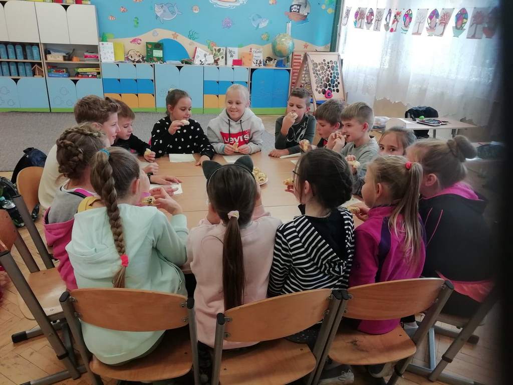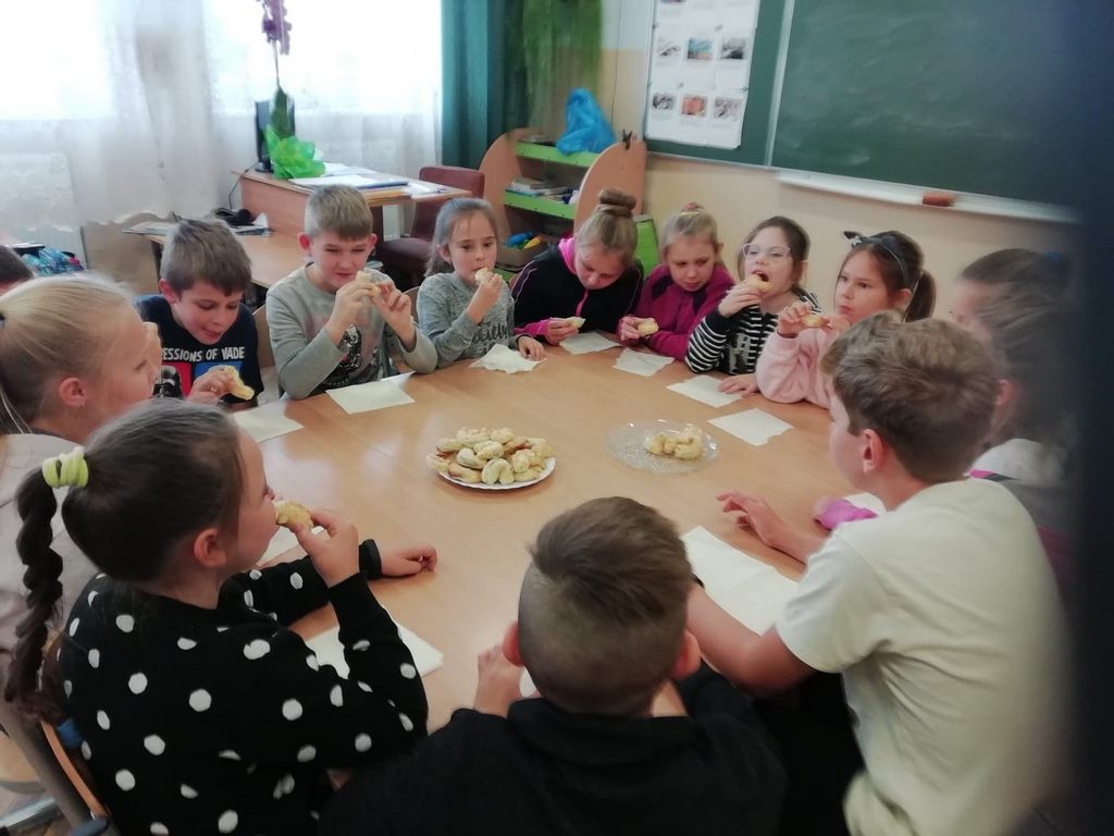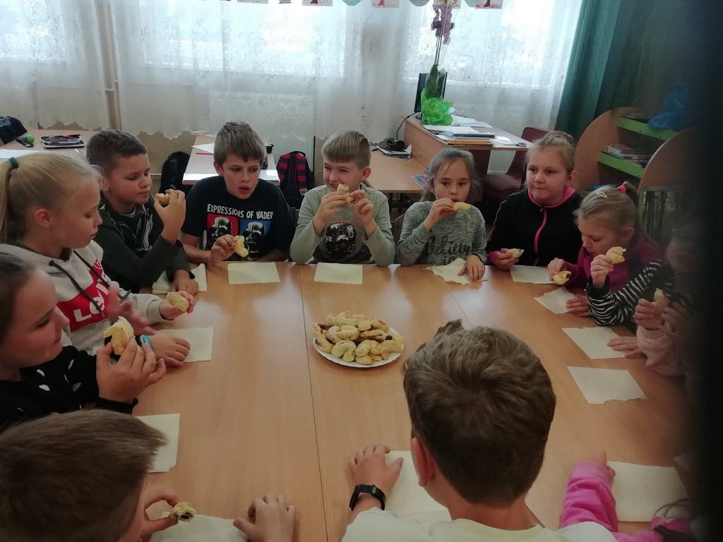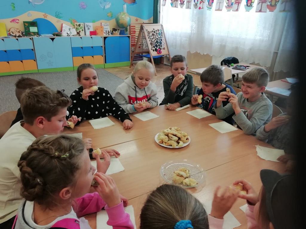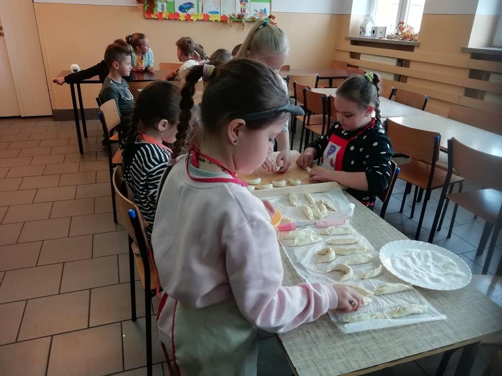 Uczniowie klasy trzeciej w obecnym roku szkolnym rozpoczęli kolejny cykl zajęć kulinarnych „Gotuj z pomysłem smacznie i zdrowo”. Zajęcia te cieszą się dużym zainteresowaniem dzieci. Podczas ostatnich zajęć uczniowie w trzech grupach wykonywali rogaliki, które nadziewane były powidłami domowej produkcji z wykorzystaniem owoców z naszych sadów i ogrodów.  Na kolejne spotkanie – listopadowe, uczniowie zaproponowali jednogłośnie by podczas zajęć przygotowane zostały muffinki oraz sok ze świeżych owoców i warzyw, które będą stanowiły przekąskę podczas spotkania andrzejkowego.