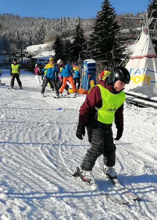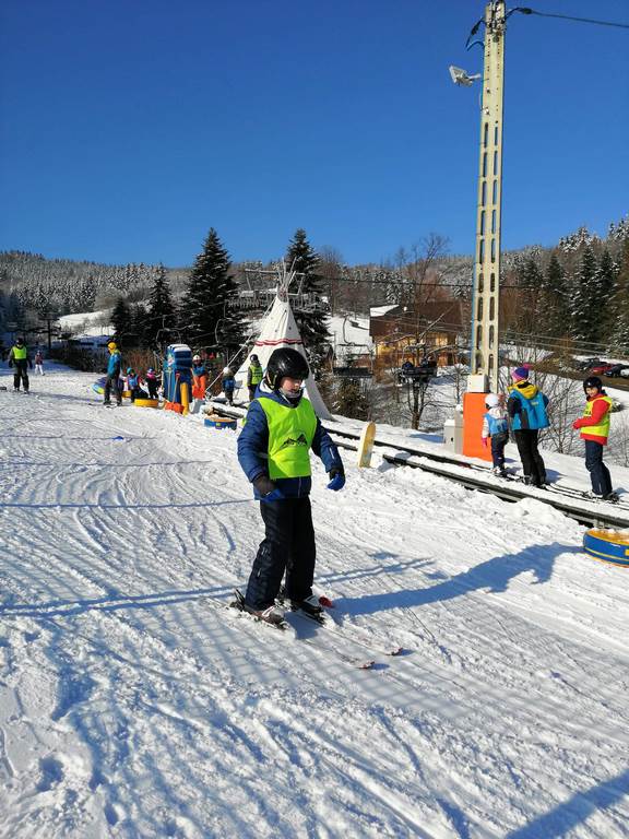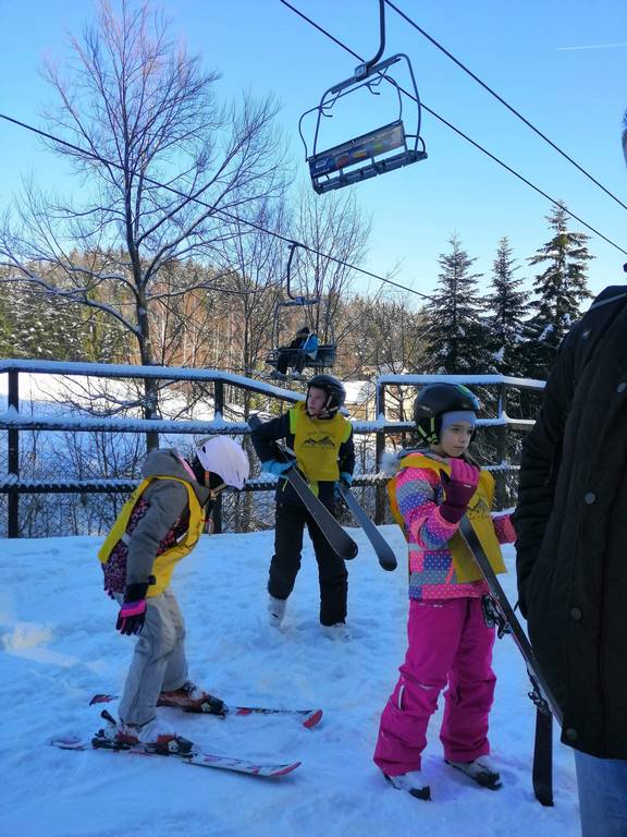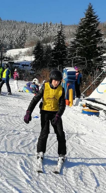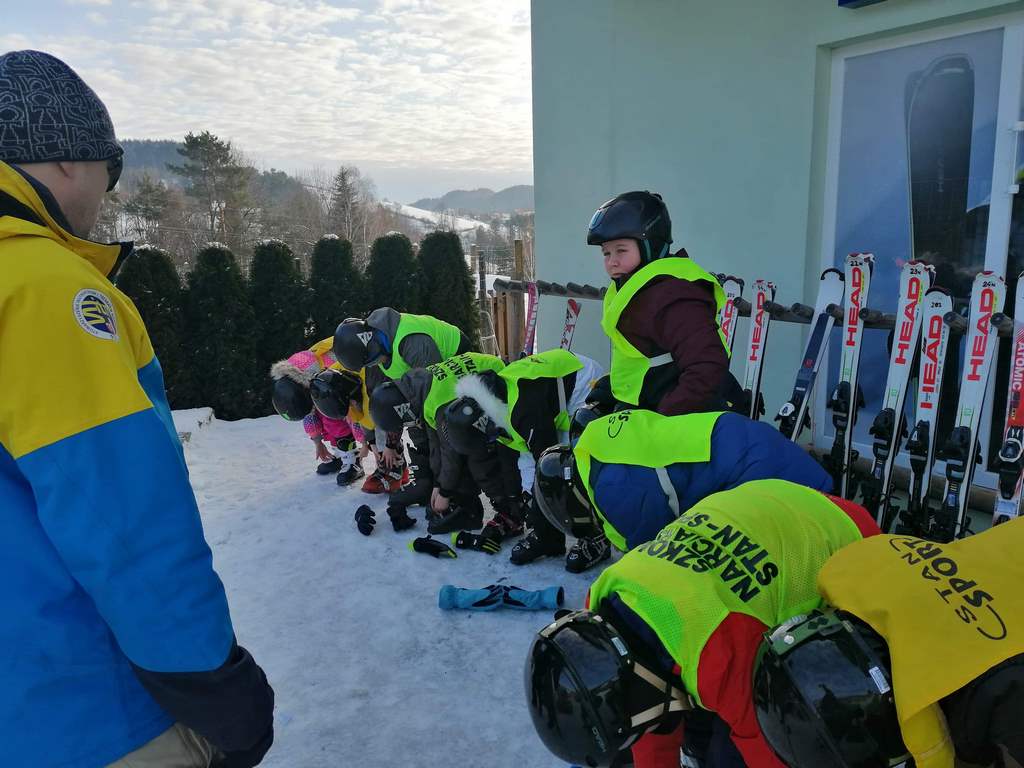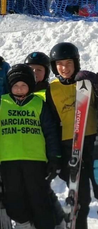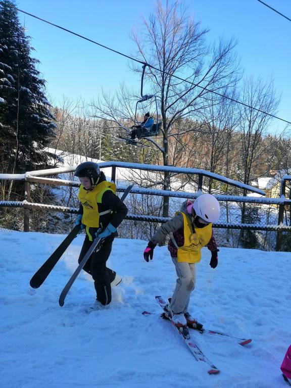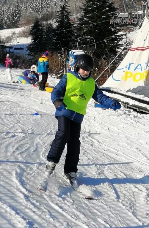 8 lutego grupa 12 uczniów z naszej szkoły rozpoczęła narciarską przygodę na stoku w Laskowej Kamionnej w ramach projektu „Jeżdżę z głową”. Dziewczęta i chłopcy pod opieką pani Katarzyny Nagórzańskiej i nadzorem instruktorów- panów: Marcina i Jakuba ze szkółki narciarskiej „Stan- Sport” nabywali podstawowe umiejętności jazdy na nartach: samoobsługa wyposażenia narciarskiego, jazda pługiem, bezpieczne przewracanie, hamowania, skręcanie. Uczniowie z zapałem ćwiczyli pilnie słuchając wskazówek instruktorskich, z radością wymieniali uwagi o swoich postępach i z dumą przyjmowali pochwały instruktorów i opiekuna. Po zakończeniu zajęć na stoku głodni, ale bardzo zadowoleni pozytywnym podsumowaniem pierwszego dnia nauki przez panów Marcina i Kuby udali się na obiad. W zaprzyjaźnionej pizzerii każdy znalazł coś dla siebie, po czym, ze wspaniałymi humorami i chęcią szybkiego powrotu na stok wrócili do domu.