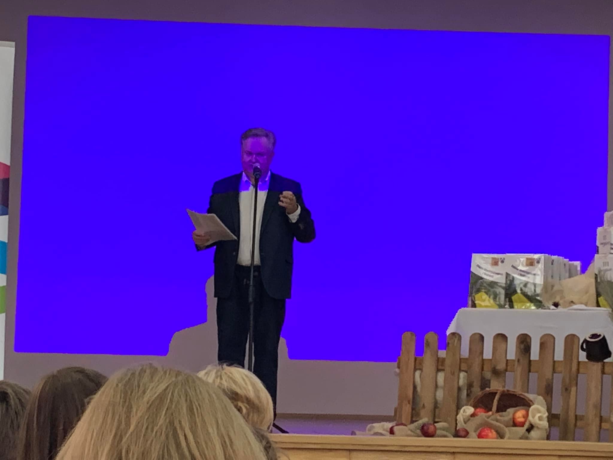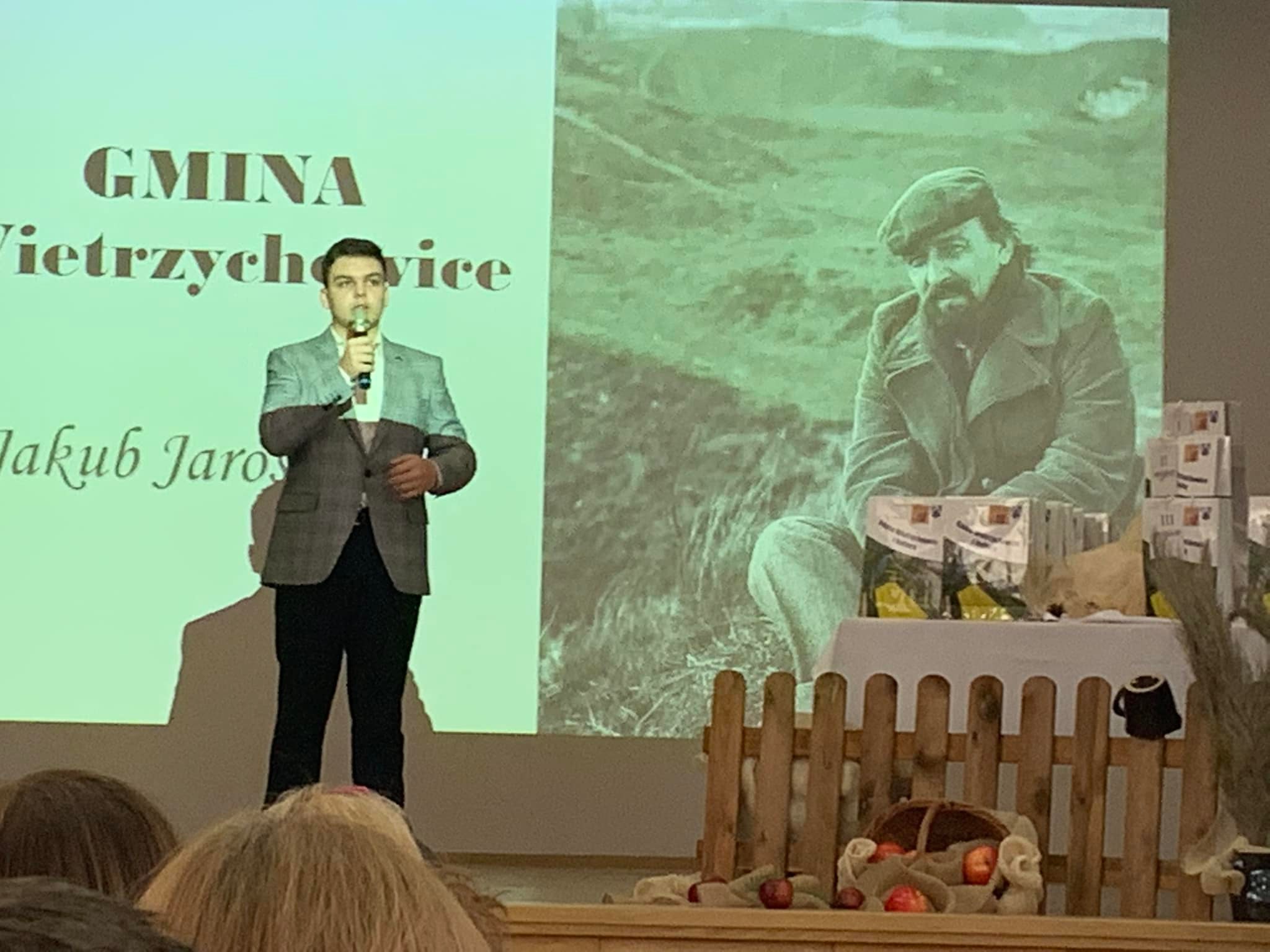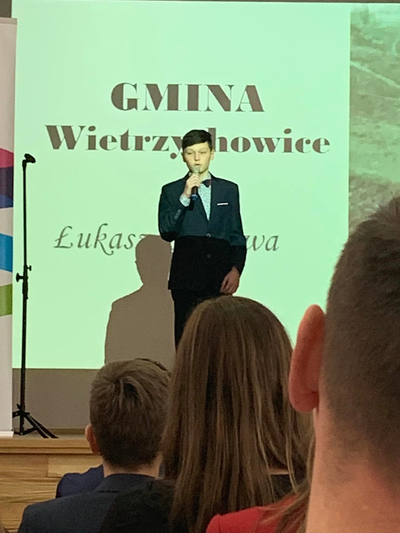 - Chłopiec w czarnym garniturze stoi na scenie i recytuje wiersz. W tle napis Gmina Wietrzychowice