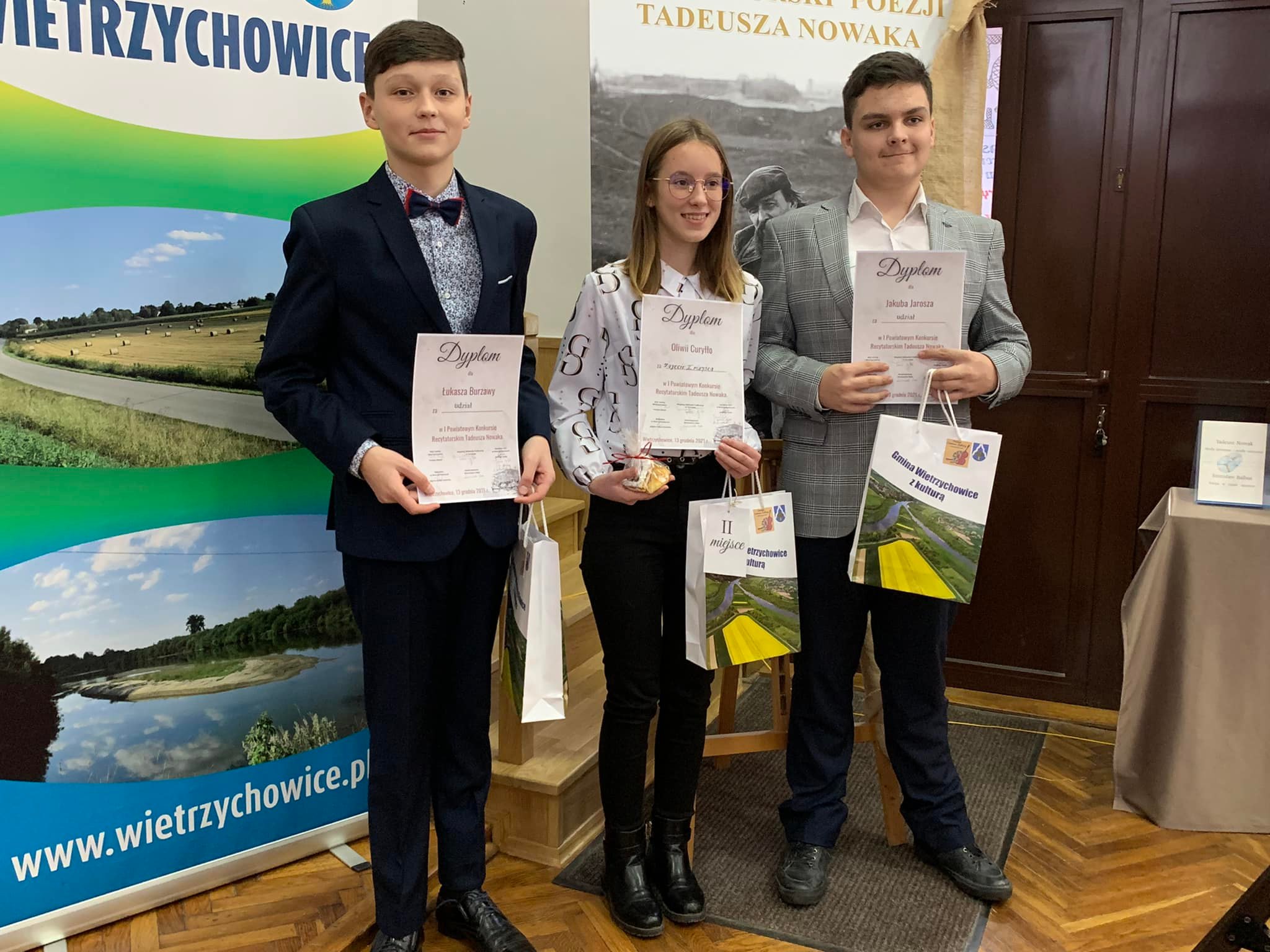 Uczniowie naszej szkoły: Oliwia Curyłło, Łukasz Burzawa oraz Jakub Jarosz, którzy zostali zwycięzcami etapu gminnego Konkursu Poezji Tadeusza Nowaka, wzięli dziś udział w I Powiatowym Konkursie Recytatorskim Poezji Tadeusza Nowaka. Do etapu powiatowego przystąpiło 33 uczestników z całego powiatu tarnowskiego, konkurencja zatem była duża. Wszyscy nasi uczniowie zaprezentowali wysoki poziom recytatorski, zaś w pierwszej trójce znalazła się Oliwia Curyłło zajmując miejsce II. Serdecznie gratulujemy i życzymy dalszych sukcesów 🙂