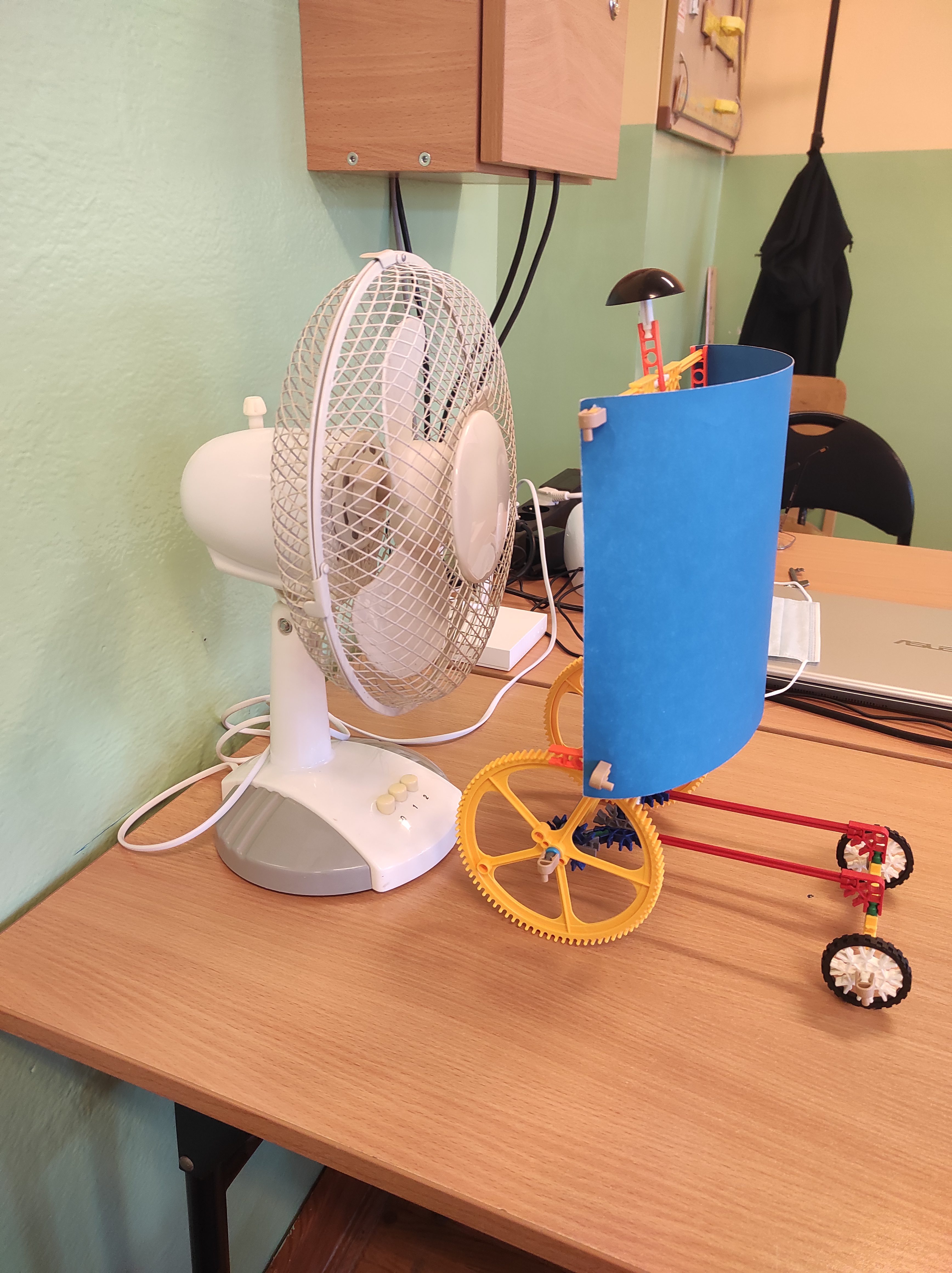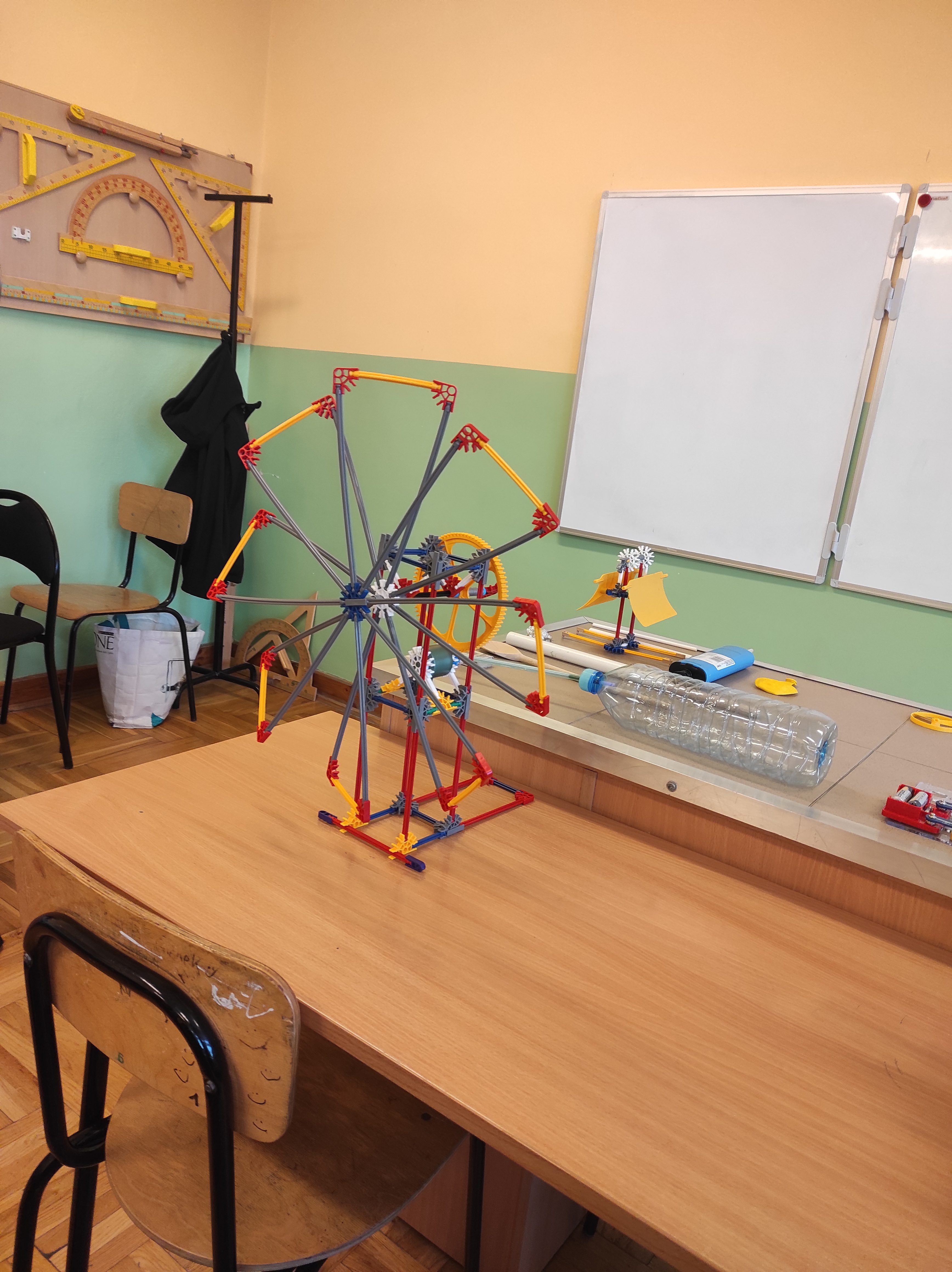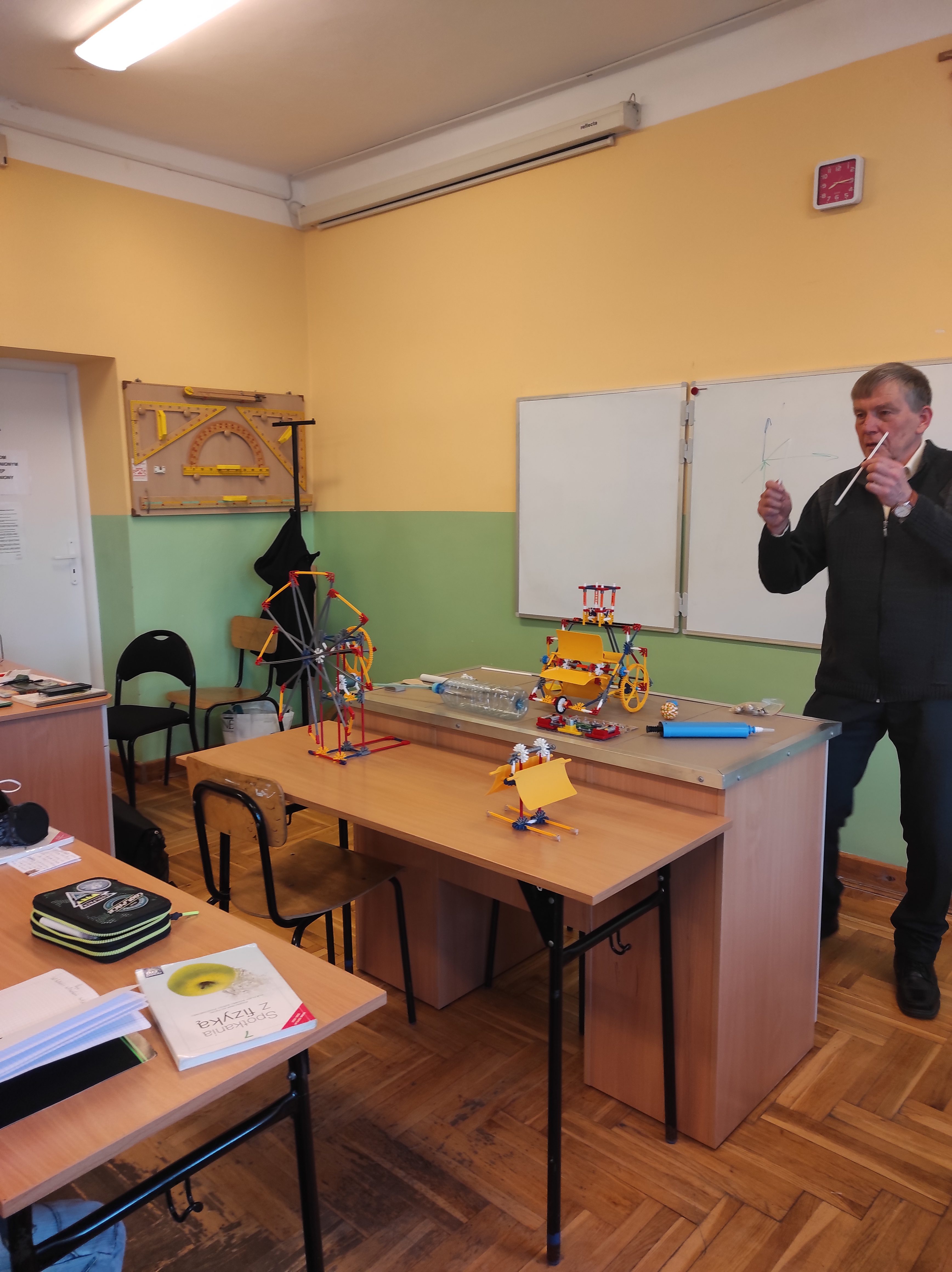 W ostatnim czasie dzięki dofinansowaniu w ramach programu „Laboratoria Przyszłości” nasza szkoła poszerzyła swój zbiór pomocy dydaktycznych o specjalne klocki konstrukcyjne. Z takich klocków możemy zbudować różnego rodzaju pojazdy, konstrukcje budowlane czy jak w tym przypadku model wiatraka prezentującego zasadę akcji i reakcji (III zasada dynamiki Newtona), a równocześnie po podłączeniu fotoogniwa przekształcającego się w model wentylatora (wielokrotna przemiana energii: energia świetlna, energia elektryczna, energia mechaniczna), model urządzenia napędzanego strumieniem wody lub innego czynnika (zasada akcji, jak w turbinie akcyjnej), model urządzenia napędzanego siłą wiatru, który prezentuje drugą zasadę dynamiki Newtona czy model do prezentowania III zasady dynamiki Newtona oraz sił oporu, w szczególności siły tarcia.
