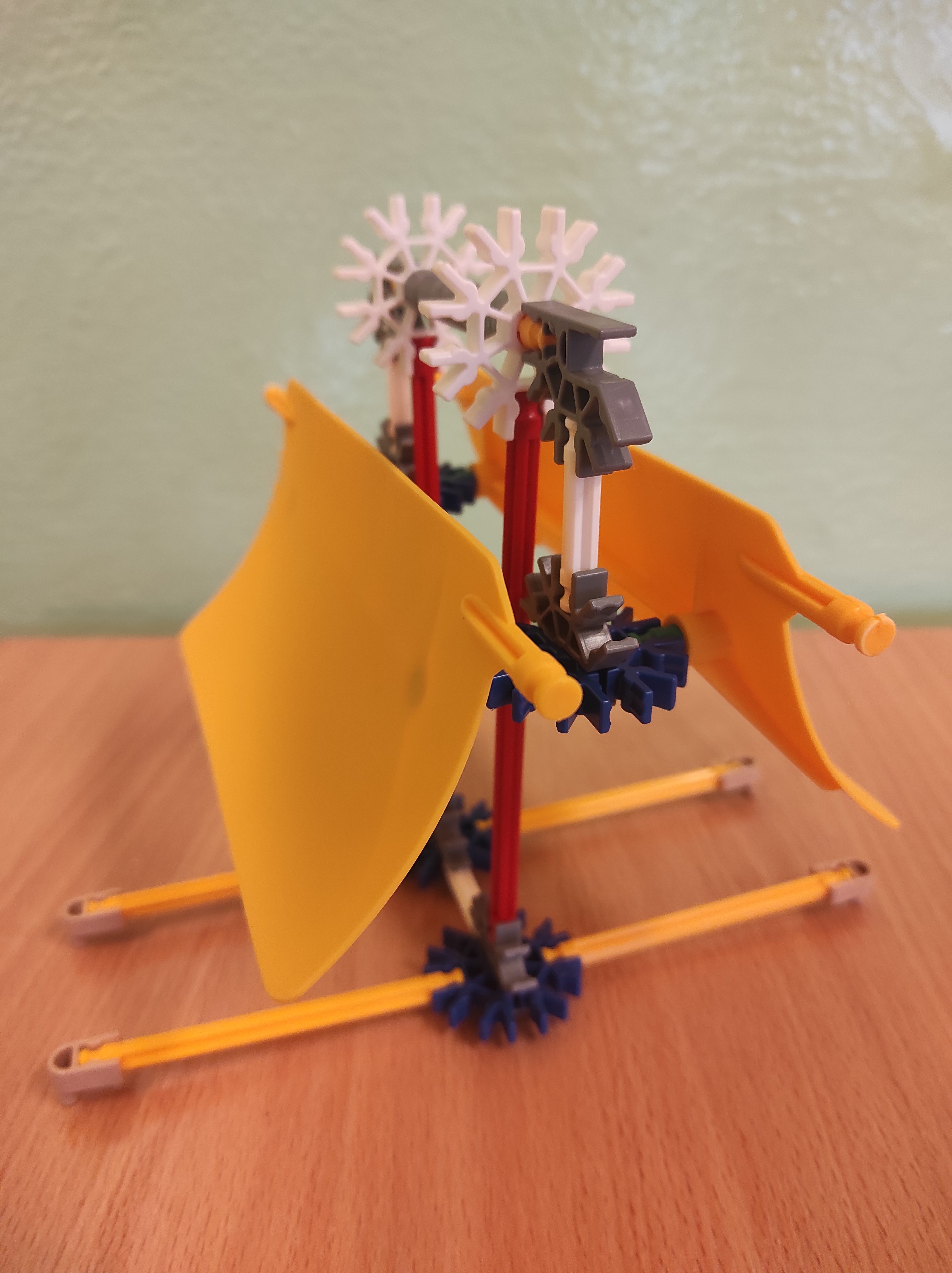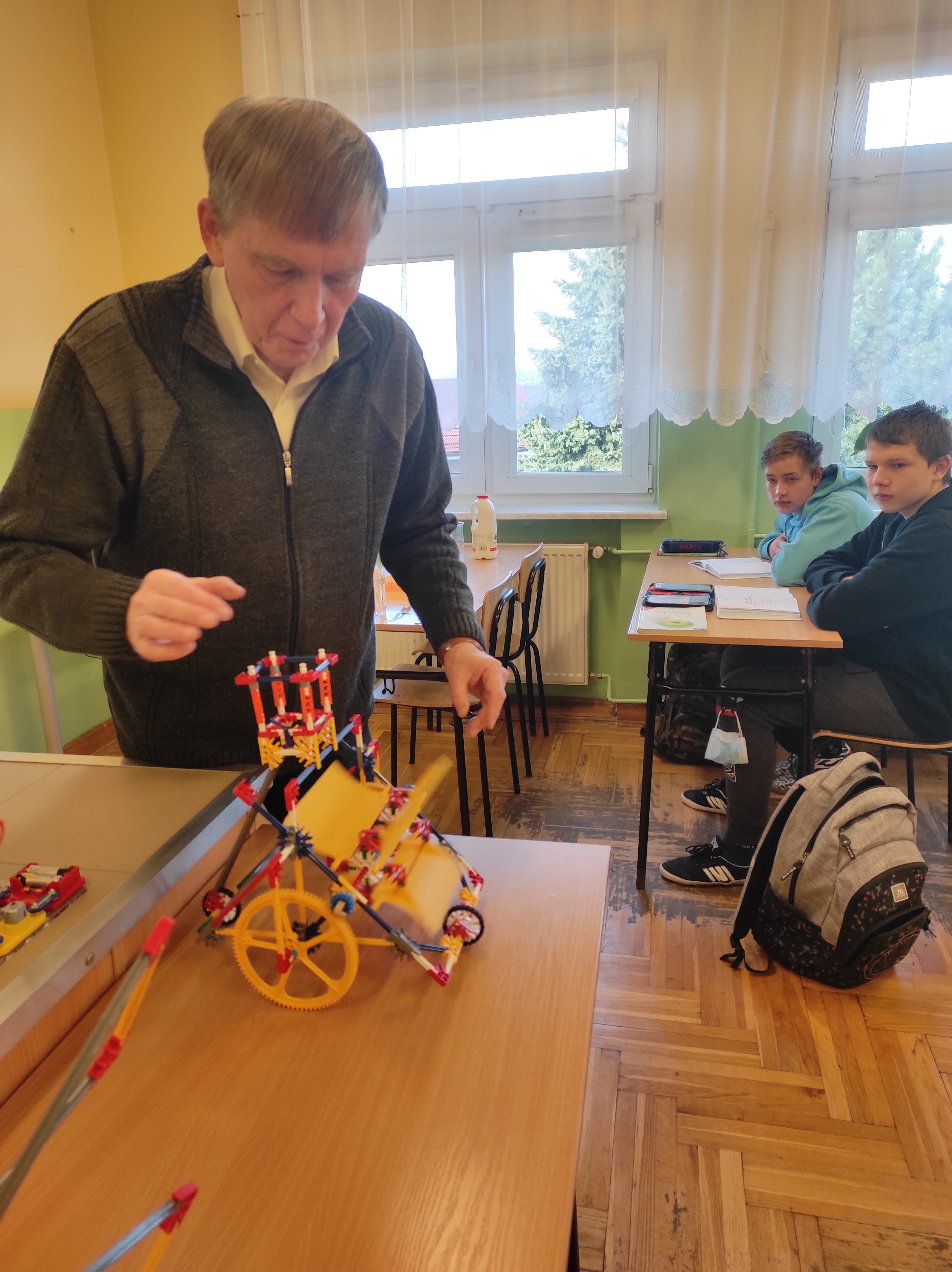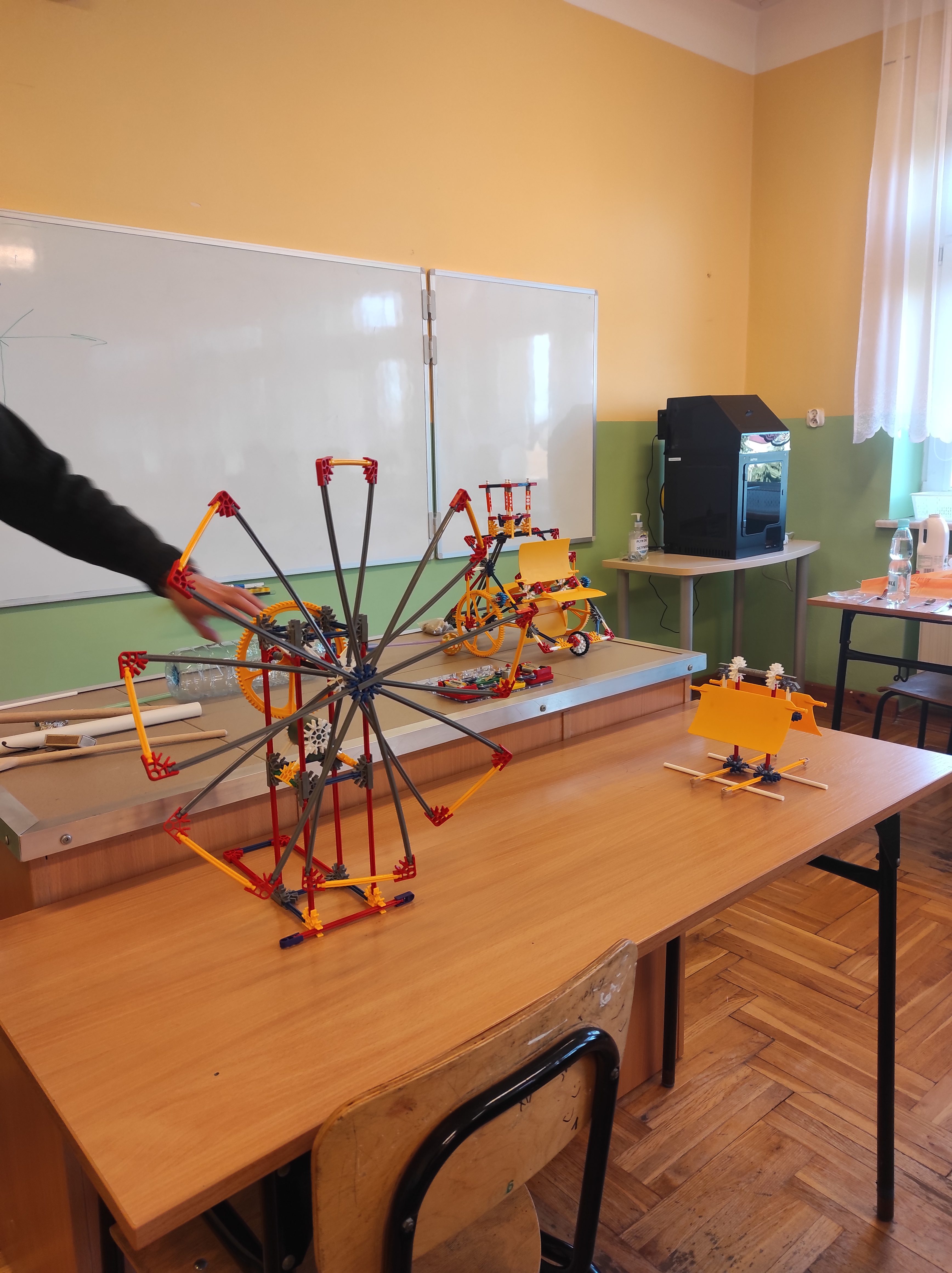 W ostatnim czasie dzięki dofinansowaniu w ramach programu „Laboratoria Przyszłości” nasza szkoła poszerzyła swój zbiór pomocy dydaktycznych o specjalne klocki konstrukcyjne. Z takich klocków możemy zbudować różnego rodzaju pojazdy, konstrukcje budowlane czy jak w tym przypadku model wiatraka prezentującego zasadę akcji i reakcji (III zasada dynamiki Newtona), a równocześnie po podłączeniu fotoogniwa przekształcającego się w model wentylatora (wielokrotna przemiana energii: energia świetlna, energia elektryczna, energia mechaniczna), model urządzenia napędzanego strumieniem wody lub innego czynnika (zasada akcji, jak w turbinie akcyjnej), model urządzenia napędzanego siłą wiatru, który prezentuje drugą zasadę dynamiki Newtona czy model do prezentowania III zasady dynamiki Newtona oraz sił oporu, w szczególności siły tarcia.