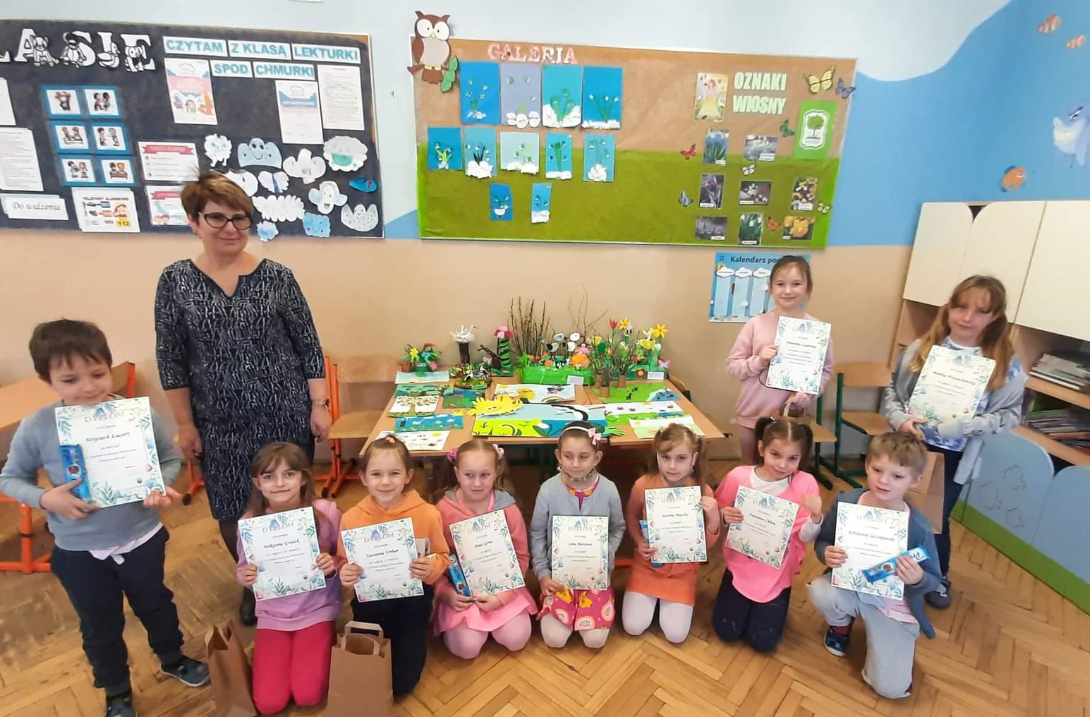 Nadeszła wiosna…, a z nią wyniki konkursu plastycznego „Wiosna wokół nas”. Uczniowie kl. I – III wykonali wiele pięknych, kolorowych, wiosennych prac. Jury przyznało trzy pierwsze miejsca w kategorii przestrzenna praca plastyczna: