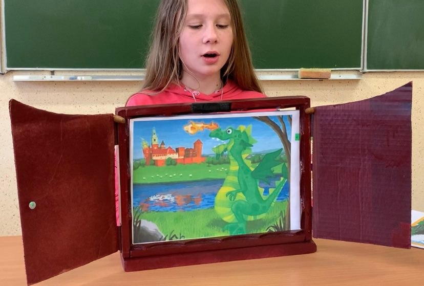 Uczniowie klasy 5, w ramach zajęć kółka teatralnego, zapoznali się z teatrem kamishibai. KAMI to papier, SHIBAI to teatr – KAMISHIBAI to Papierowy Teatr. Jest to teatr, który służy do prezentowania widzom ilustracji, tworzących fabułę. Zbiór obrazków (umożliwiających przedstawienie całej opowieści), ułożonych jeden po drugim, umieszczany jest w butai – drewnianej skrzynce. Na odwrocie każdej ilustracji znajduje się fragment tekstu czytanego głośno przez narratora siedzącego przy teatrzyku. Tekst do obrazka pokazywanego w danym momencie jest wydrukowany z tyłu obrazka go poprzedzającego i jest widoczny jedynie dla czytającego. Dzieci natomiast oglądają piękne ilustracje zmieniające się jak slajdy. Kamishibai to narzędzie kreatywnego działania, aktywizująca metoda pracy z uczniem.