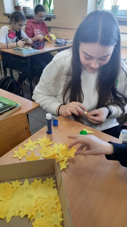- wspólne wykonywanie papierowych żonkili, które następnie rozdawane były w naszej szkole
