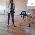 Panie przybyły na zaproszenie dyrekcji oraz pedagog szkolnej z prelekcją pt. „Uzależnienia medialne- poradnik dla rodziców”, która obejmowała treści związane z mechanizmami wchodzenia w uzależnienie od Internetu, telefonów komórkowych, gier video czy innych, powiązanych z przenośnymi środkami medialnymi. Panie: psycholog i pedagog omówiły mechanizm wchodzenia w uzależnienie, jego konsekwencje psychiczne dla dziecka, podały sposoby i wskazówki do wykorzystania przez rodziców w oddziaływaniach wychowawczych, mające na celu zapobiegnięcie skutkom długotrwałego spędzania czasu z mediami. Specjalistki zwróciły uwagę na obecne w Internecie zjawisko cyberprzemocy, zagrażające dzieciom i młodzieży w podatnym na niekontrolowaną manipulację on-line wieku rozwojowym. Doradziły rodzicom jak skutecznie wykorzystać zasady filtrowania treści płynących z sieci i nauczyć dziecko racjonalnego wykorzystania czasu wolnego, powołując się na przykład własny- przykład rodzica.